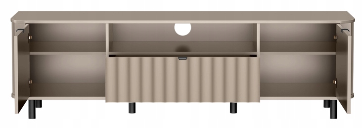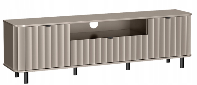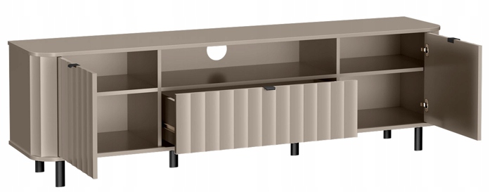 Korpus wykonany z laminowanej płyty meblowej w odcieniu Clay Gray i frezowane fronty z MDF nadają całości subtelnego, a zarazem nowoczesnego wyglądu. Smukłe, czarne nogi ze stali malowanej proszkowo dodają konstrukcji lekkości i doskonale komponują się z metalowymi uchwytami w tym samym kolorze. Szafka została zaprojektowana z myślą o przechowywaniu sprzętu RTV i akcesoriów – oferuje przestronne półki oraz zamykane szafki z systemem cichego domyku, który zapewnia komfort i elegancję w codziennym użytkowaniu.
