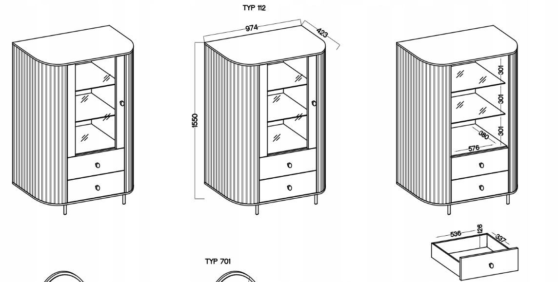 Witryna z kolekcji OVALIO łączy funkcję praktycznego przechowywania z elegancką ekspozycją. Przeszklony front umożliwia wyeksponowanie dekoracji, książek lub zastawy, dzięki czemu mebel może pełnić również funkcję dekoracyjną w salonie lub jadalni. Dwie pojemne szuflady zapewniają dodatkową przestrzeń na drobne przedmioty, a konstrukcja oparta na smukłych metalowych nogach nadaje bryle lekkości i ułatwia utrzymanie czystości pod meblem.