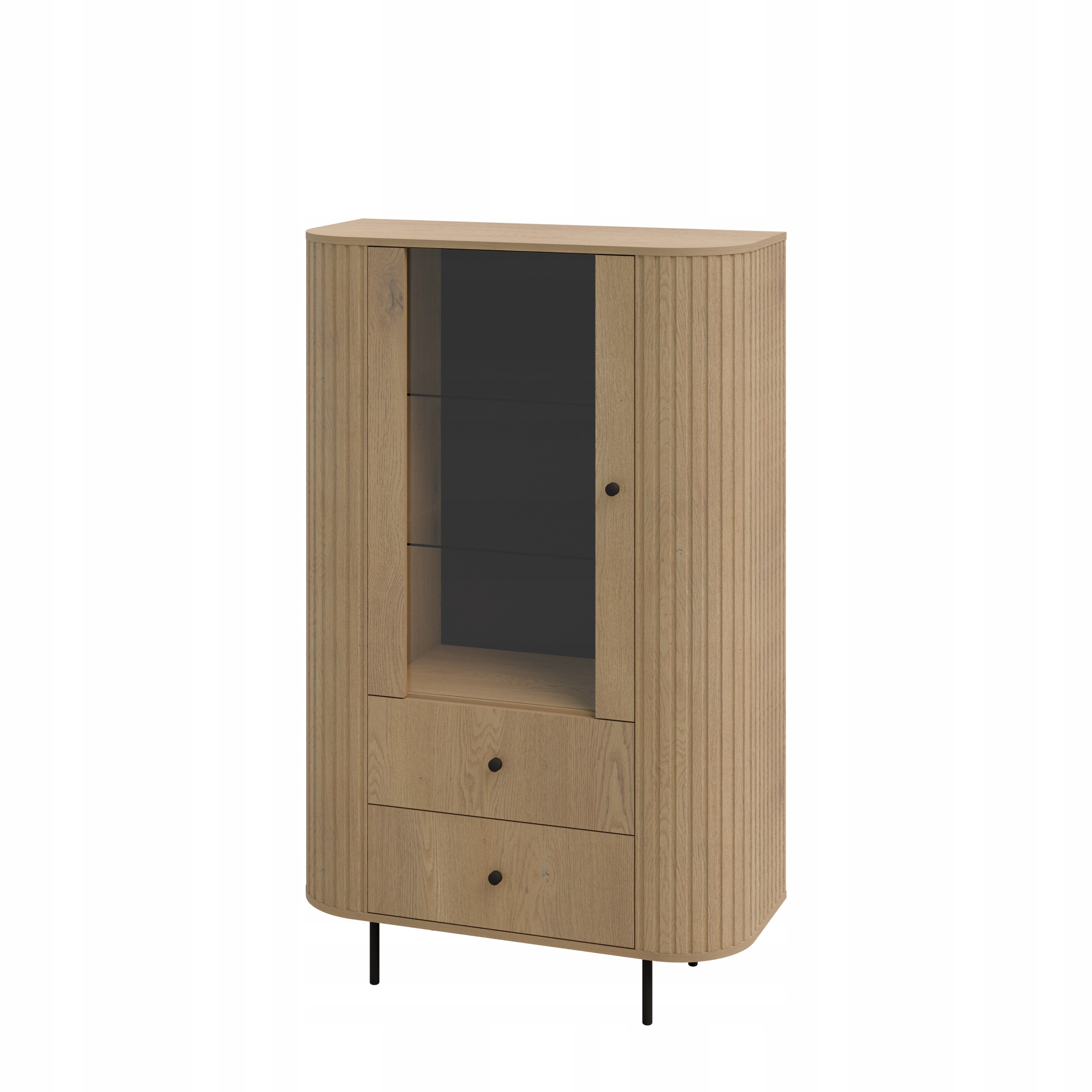 Witryna z kolekcji OVALIO łączy funkcję przechowywania z elegancką ekspozycją. Przeszklona część pozwala wyeksponować dekoracje, książki lub zastawę, dzięki czemu mebel może pełnić również funkcję dekoracyjną w pomieszczeniu. Dwie praktyczne szuflady zapewniają dodatkową przestrzeń do przechowywania drobnych przedmiotów, a konstrukcja oparta na smukłych metalowych nogach nadaje bryle lekkości i ułatwia utrzymanie czystości pod meblem.