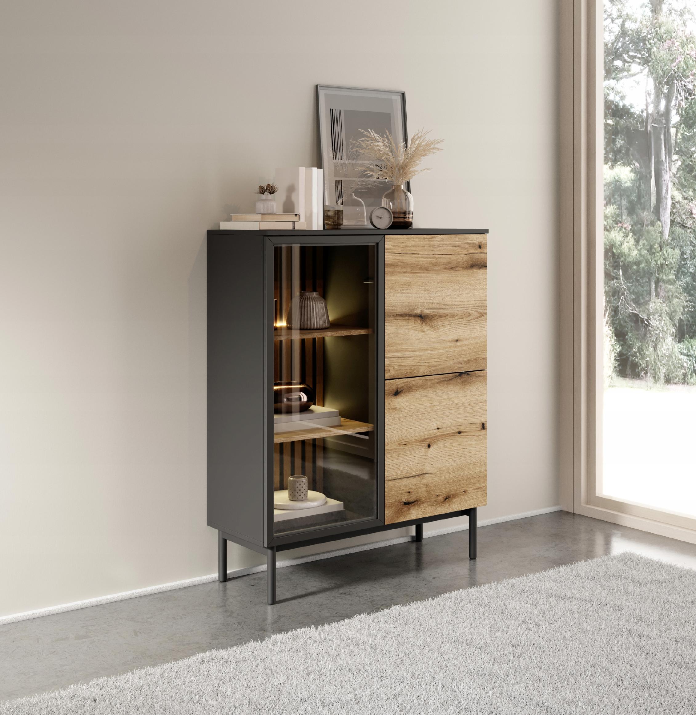 Kolekcja ARIA wyróżnia się oryginalnymi lamelowymi plecami w kolorze czarnego drewna i dębu evoke, które dodają meblowi głębi i stylowego charakteru. Subtelna czarna ramka wokół szkła nadaje witrynie elegancji i wyrazistości, a wbudowane oświetlenie LED, zawarte w cenie, podkreśla prezentowane przedmioty i tworzy przytulną atmosferę.