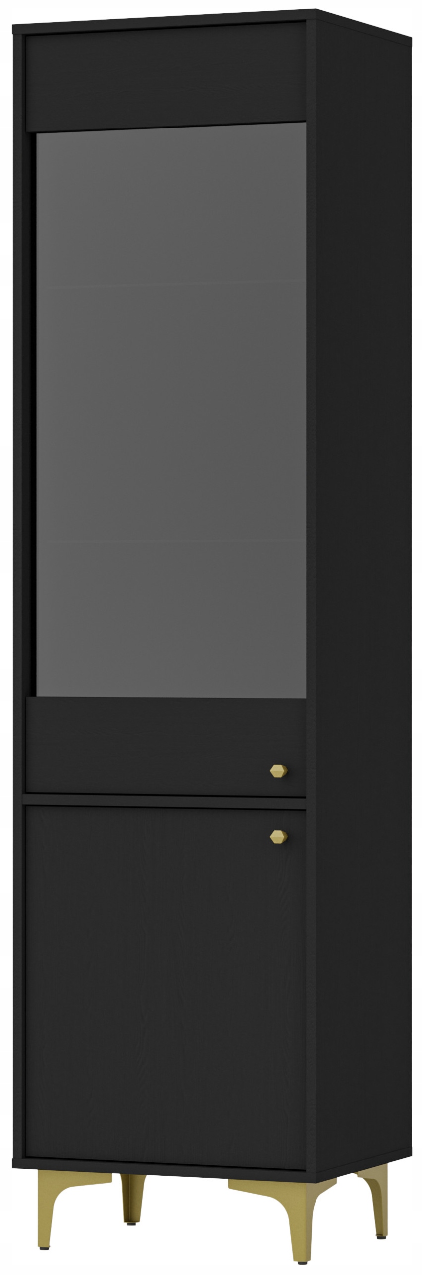 Witryna AVILA w eleganckim, czarnym kolorze to wysoka propozycja o nowoczesnym charakterze, która doskonale dopełni każde wnętrze salonu. Wyposażona w złote metalowe uchwyty i nóżki, nadaje pomieszczeniu luksusowy akcent, a jednocześnie zapewnia maksymalną funkcjonalność. Wykonana z wytrzymałej płyty laminowanej, witryna charakteryzuje się solidnością oraz estetyką, którą podkreśla struktura drewna na froncie.