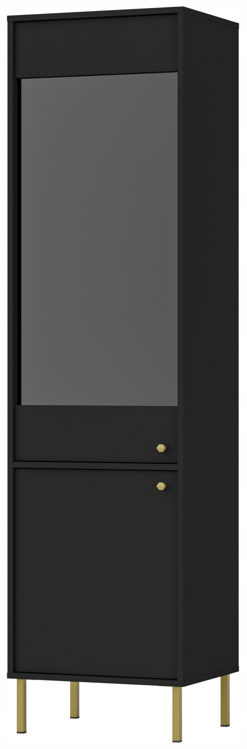 Wykończona w głębokim kolorze czarnego grafitu, witryna AVILA idealnie wpasowuje się w modne, minimalistyczne wnętrza. Złote metalowe uchwyty i nóżki dodają jej luksusowego wyglądu i doskonale kontrastują z ciemnym korpusem, wprowadzając do wnętrza elegancki akcent. Proste, geometryczne linie i subtelna struktura drewna podkreślają współczesny styl, a wytrzymałe obrzeża ABS zwiększają odporność na codzienne uszkodzenia.