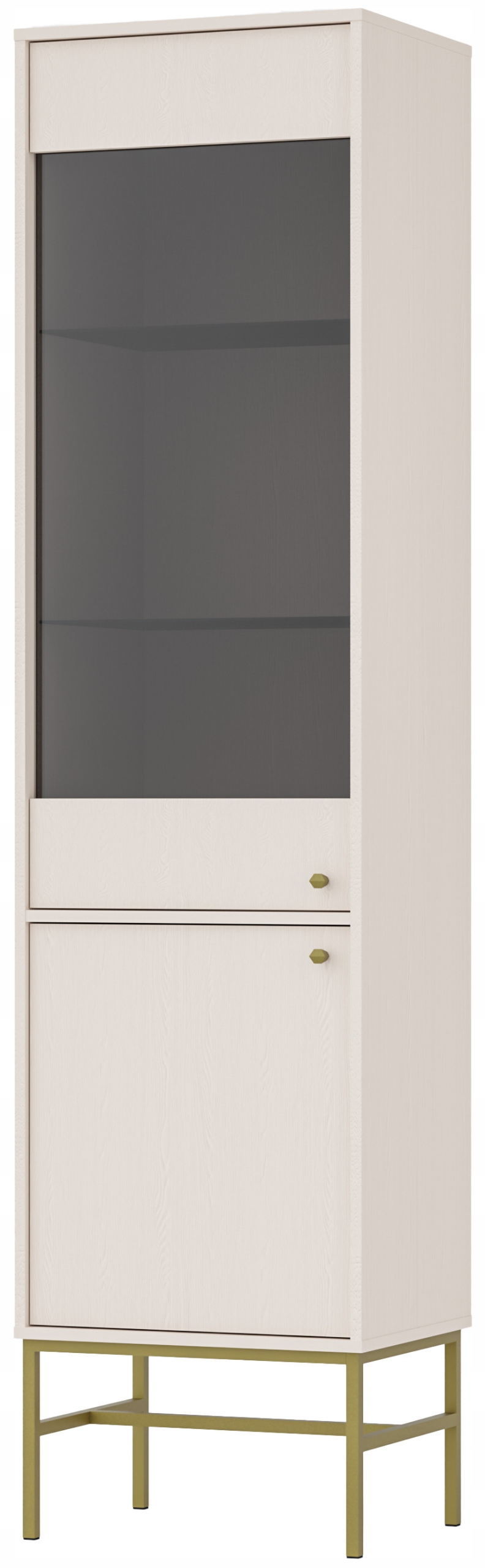 Witryna wysoka AVILA to wyrafinowany element, który doda elegancji i funkcjonalności każdemu wnętrzu. Beżowy piaskowy odcień w połączeniu ze złotymi metalowymi nóżkami i uchwytami podkreśla nowoczesny styl mebla, nadając mu luksusowego charakteru. Doskonale sprawdzi się w salonie, wprowadzając ciepło i harmonię do otoczenia.