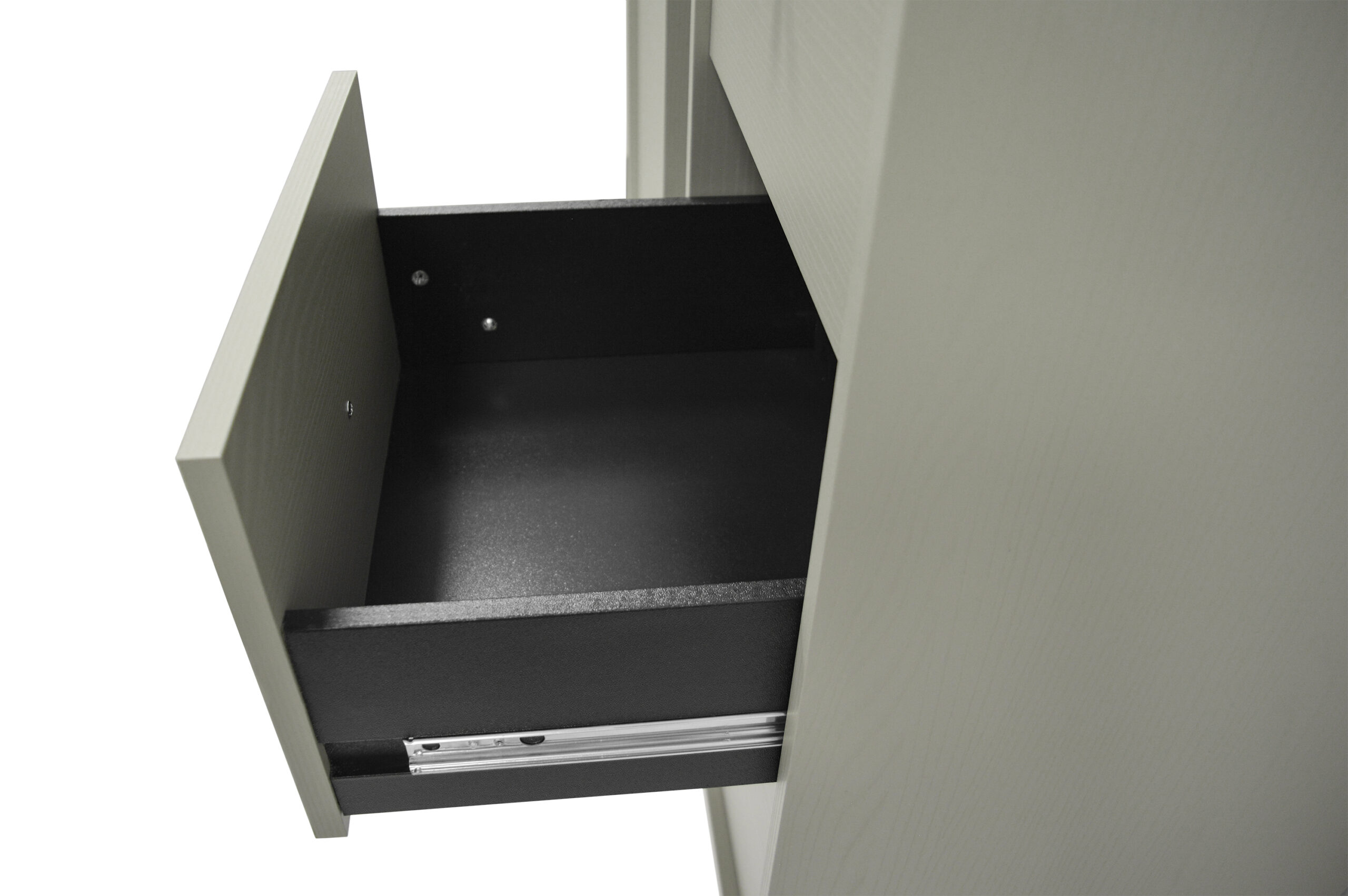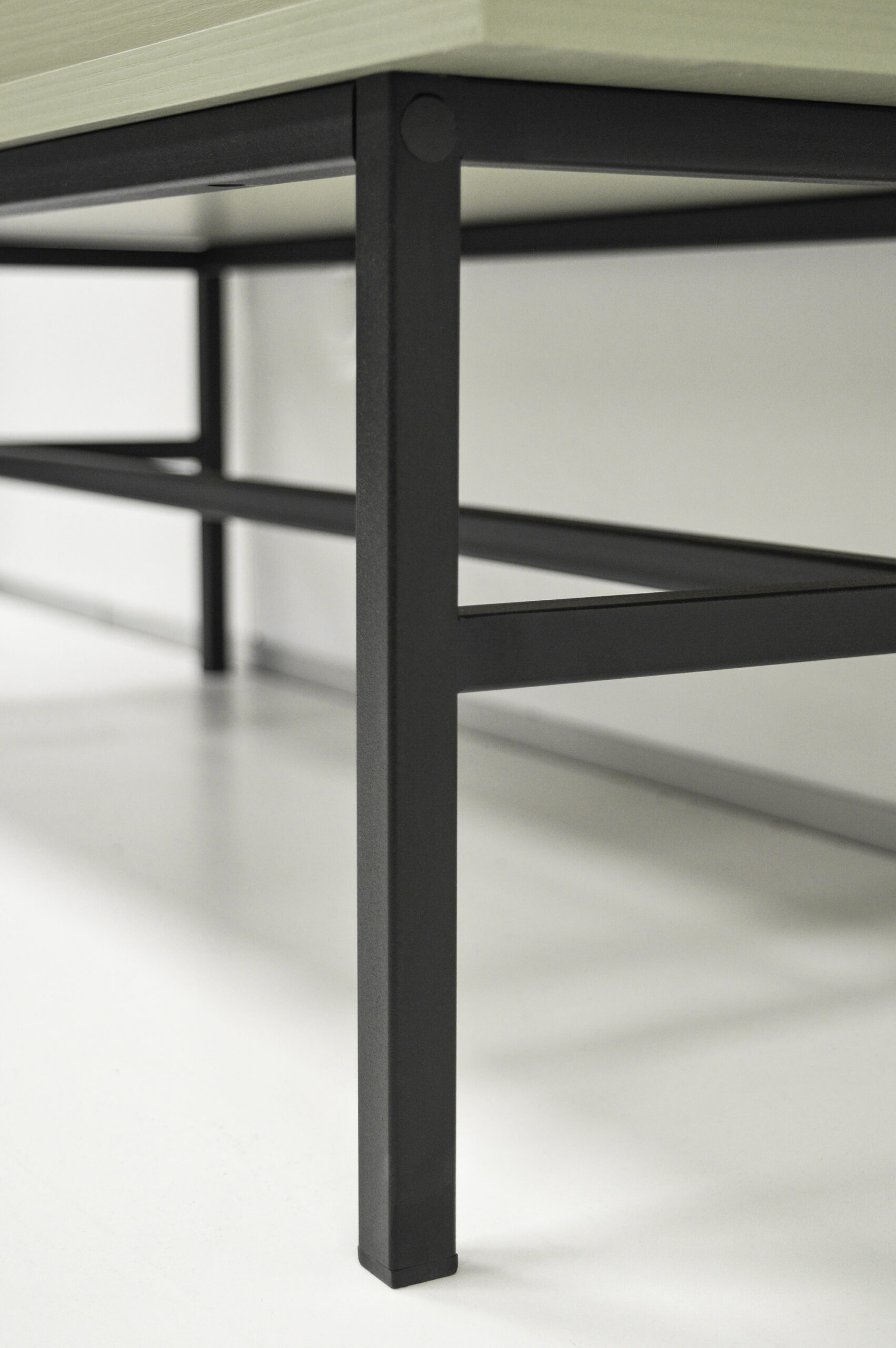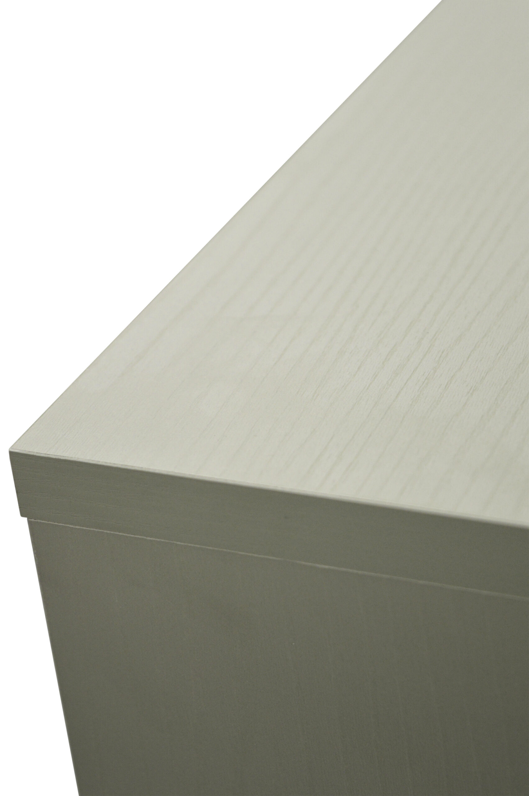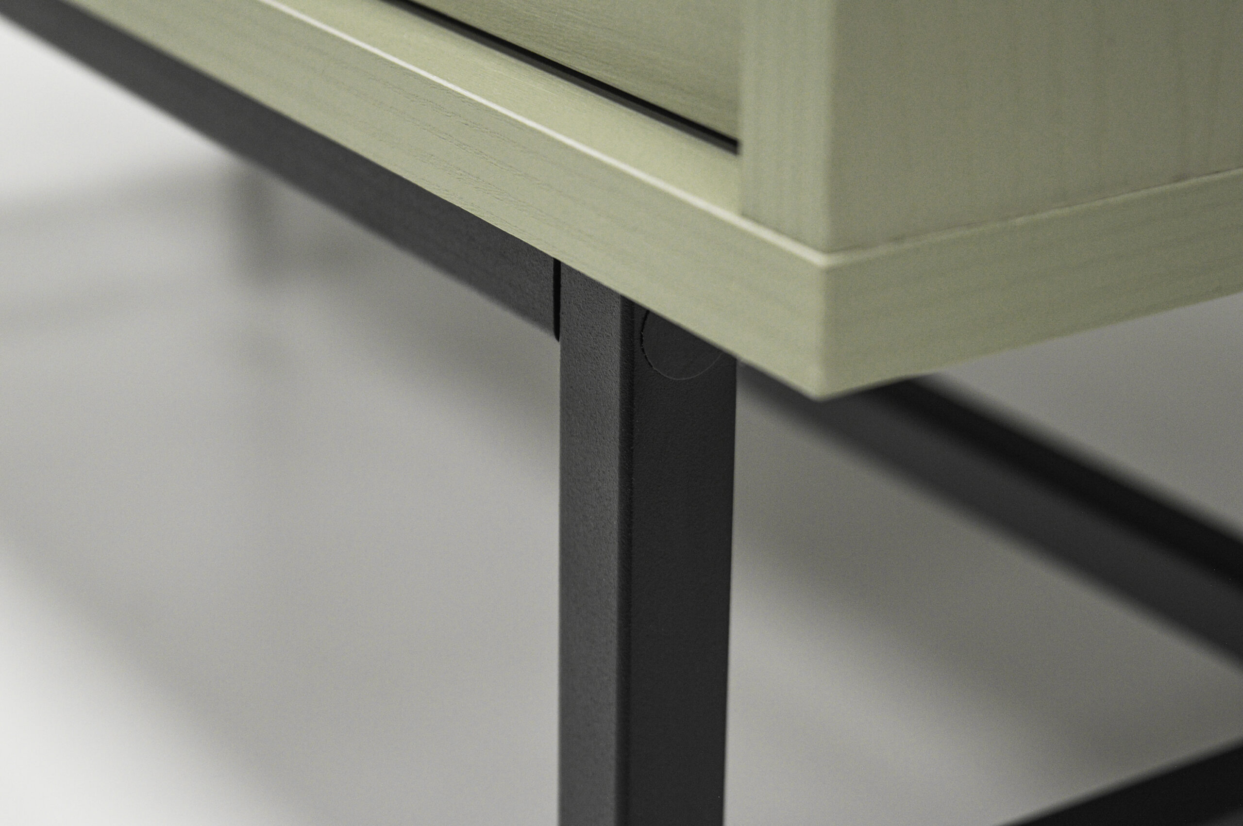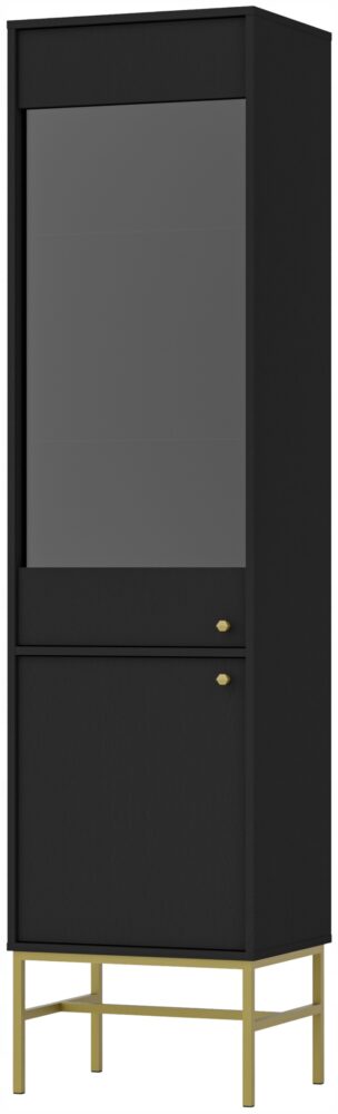 Czarne, metalowe uchwyty i nóżki dodają nowoczesnego charakteru, a proste linie oraz struktura drewna frontów wprowadzają naturalny i subtelny akcent. Witryna wykonana z wysokiej jakości płyty laminowanej z zabezpieczonymi obrzeżami ABS gwarantuje trwałość i odporność na codzienne użytkowanie. System mebli AVILA oferuje także pełną personalizację – możliwość wyboru różnych nóg i kolorów, co pozwala idealnie dopasować ją do indywidualnych potrzeb i gustu.