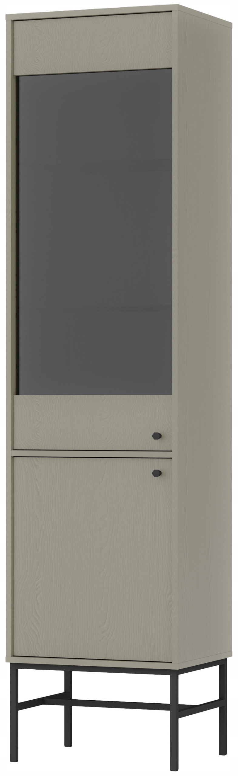 Wysoka witryna AVILA w kolorze eukaliptus to elegancka i funkcjonalna propozycja do każdego salonu, który potrzebuje stylowego miejsca do ekspozycji. Dzięki swojej wysokości 208 cm oraz wąskiej szerokości 51,8 cm, idealnie sprawdzi się zarówno w przestronnych, jak i bardziej kompaktowych wnętrzach, dodając im lekkości i harmonii. Szklany front z hartowanego szkła pozwala na estetyczną prezentację książek, dekoracji czy zastawy stołowej, chroniąc je przed kurzem.