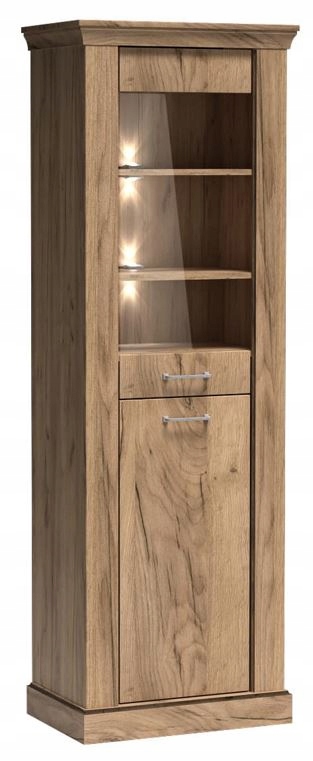 Solidne wykonanie, metalowe uchwyty i zabezpieczone obrzeża ABS podkreślają trwałość mebla, a możliwość dodatkowego oświetlenia półek pozwala wyeksponować jego zawartość w elegancki sposób. Witryna CANITA łączy funkcjonalność z ponadczasowym designem, wprowadzając do Twojego wnętrza harmonię klasyki i nowoczesności.