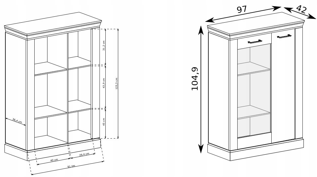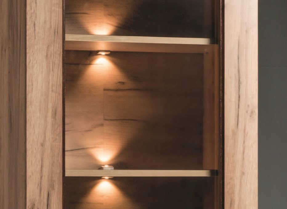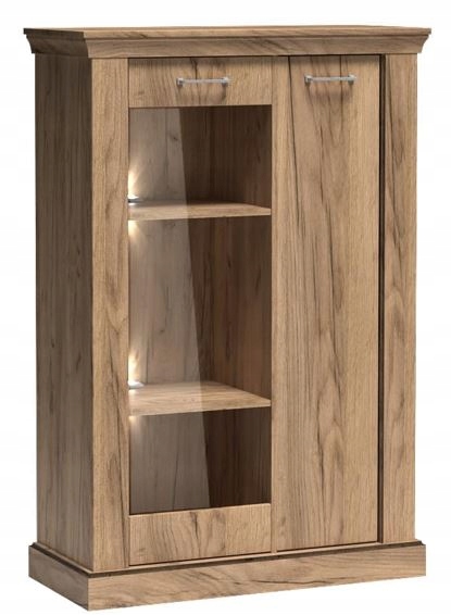 Cichy domyk oraz metalowe uchwyty zwiększają komfort użytkowania, łącząc tradycyjny design z nowoczesnymi rozwiązaniami. Solidna konstrukcja i starannie wykonane detale, takie jak górne wieńce i pogrubione cokoły, nadają meblowi klasyczny charakter. Witryna CANITA to perfekcyjne połączenie estetyki i praktyczności, które odmieni Twoje wnętrze.