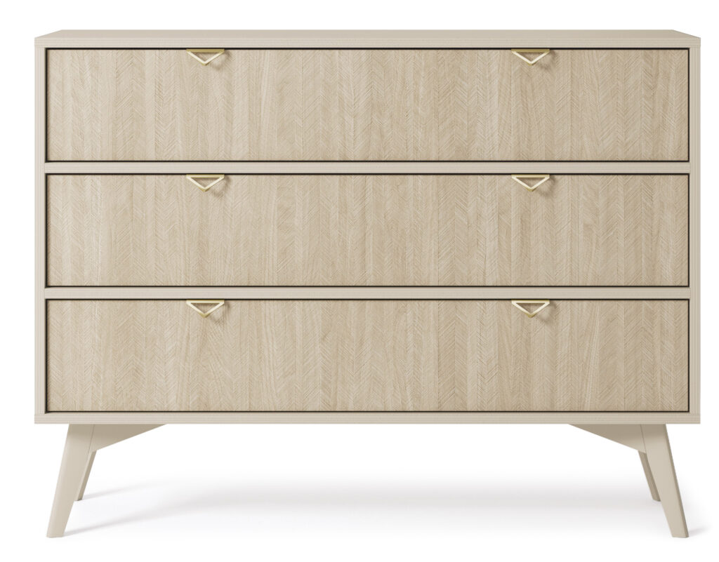 Kolekcja MALUBA wyróżnia się czarnymi, matowymi korpusami i frontami, ozdobionymi eleganckim wzorem jodełki, wykonanym przy użyciu precyzyjnego nadruku UV. Subtelny połysk wzoru pięknie kontrastuje z matową powierzchnią, podkreślając widoczne słoje drewna i nadając meblowi luksusowego charakteru.