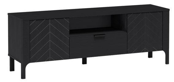Kolekcja MALUBA wyróżnia się czarnymi, matowymi korpusami i frontami, ozdobionymi eleganckim wzorem jodełki, wykonanym przy użyciu precyzyjnego nadruku UV. Subtelny połysk wzoru pięknie kontrastuje z matową powierzchnią, podkreślając widoczne słoje drewna i nadając meblowi luksusowego charakteru.