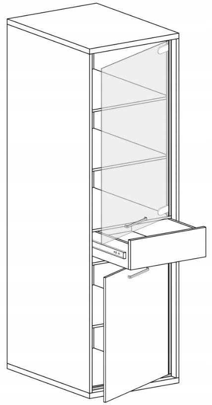 Witryna MILAN to wyjątkowy element kolekcji, harmonijnie łączący industrialny styl z elegancją koloru Natural Hikora. Dzięki metalowym, czarnym nóżkom oraz uchwytom, witryna nabiera nowoczesnego charakteru, idealnie komponując się w przestrzeniach o loftowym stylu. Przestronne wnętrze z funkcją PUSH TO OPEN oraz cichy domyk w drzwiach gwarantują komfortowe użytkowanie i wygodny dostęp do przechowywanych przedmiotów.