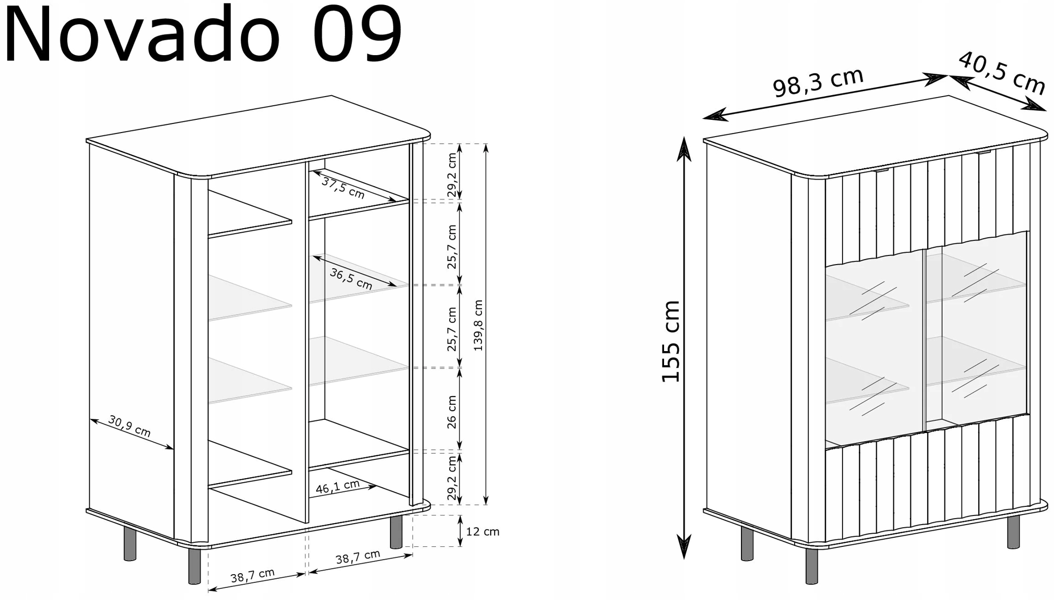 Kolekcja NOVADO to synonim elegancji i nowoczesności, stworzony z myślą o funkcjonalnych i stylowych wnętrzach. Smukła witryna o wysokości 155 cm zachwyca połączeniem przeszklonych frontów z hartowanego szkła i subtelnych frezowań MDF, co nadaje meblowi wyjątkowego charakteru i pozwala pięknie wyeksponować ulubione dekoracje.