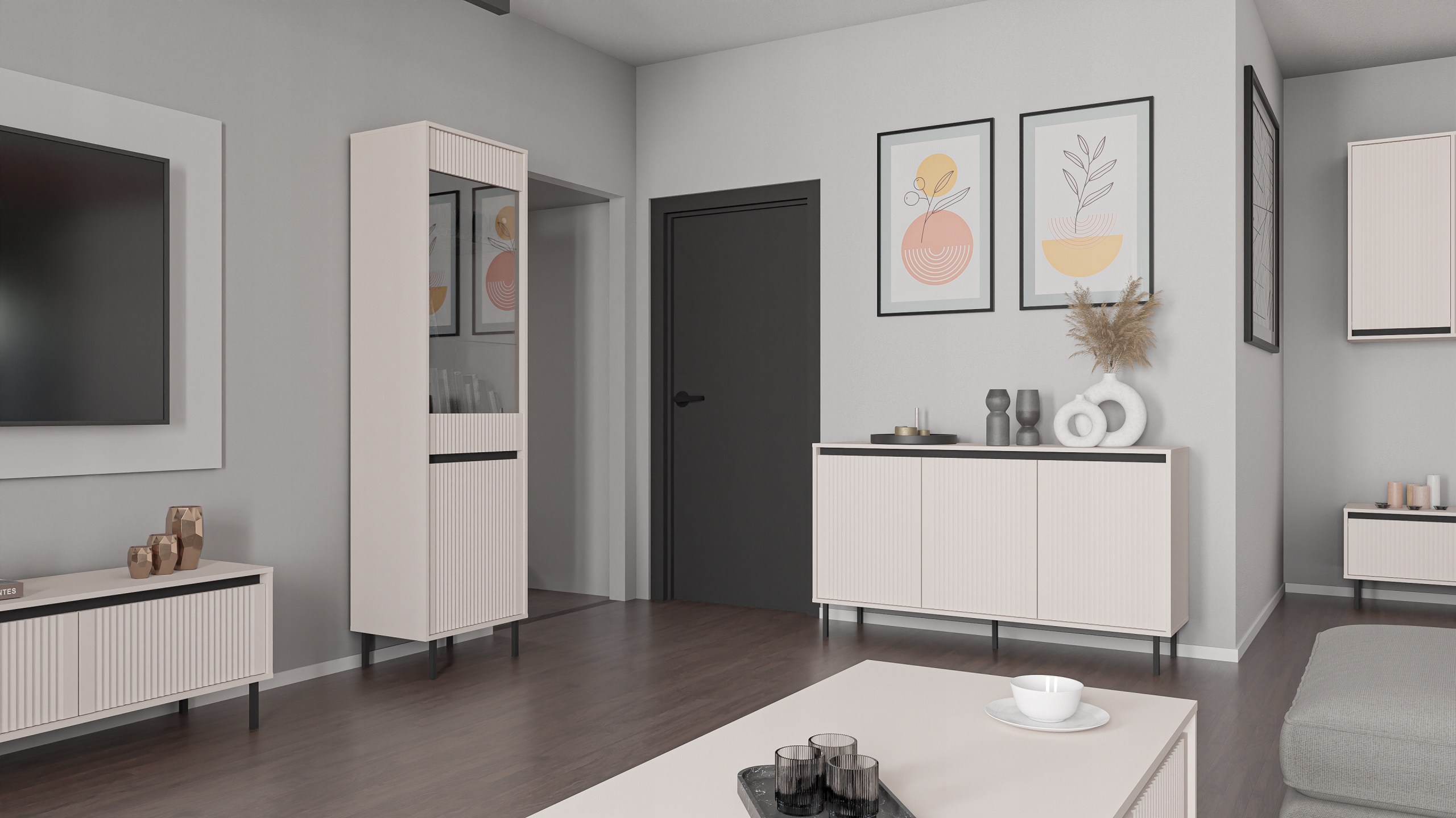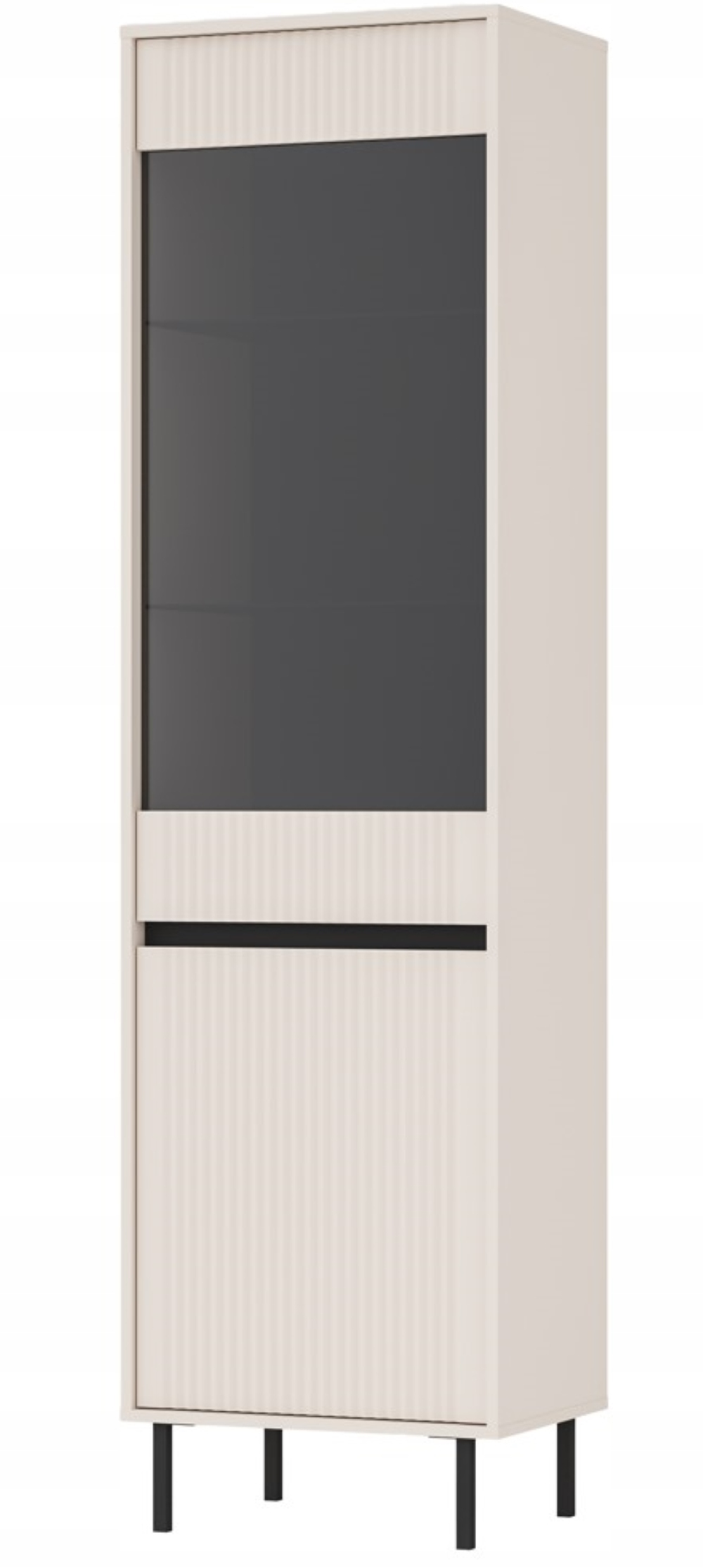 Ta elegancka witryna z kolekcji Osaka to stylowe rozwiązanie do salonu, które łączy funkcjonalność z nowoczesnym designem. Wysoka na 205 cm, prezentuje efektowne ryflowane fronty oraz szklane półki, tworząc idealne miejsce do wyeksponowania ulubionych dekoracji, książek lub szkła. Subtelny beż piaskowy dodaje wnętrzu ciepła i harmonii, a czarne, matowe nóżki z metalu podkreślają współczesny charakter witryny.
