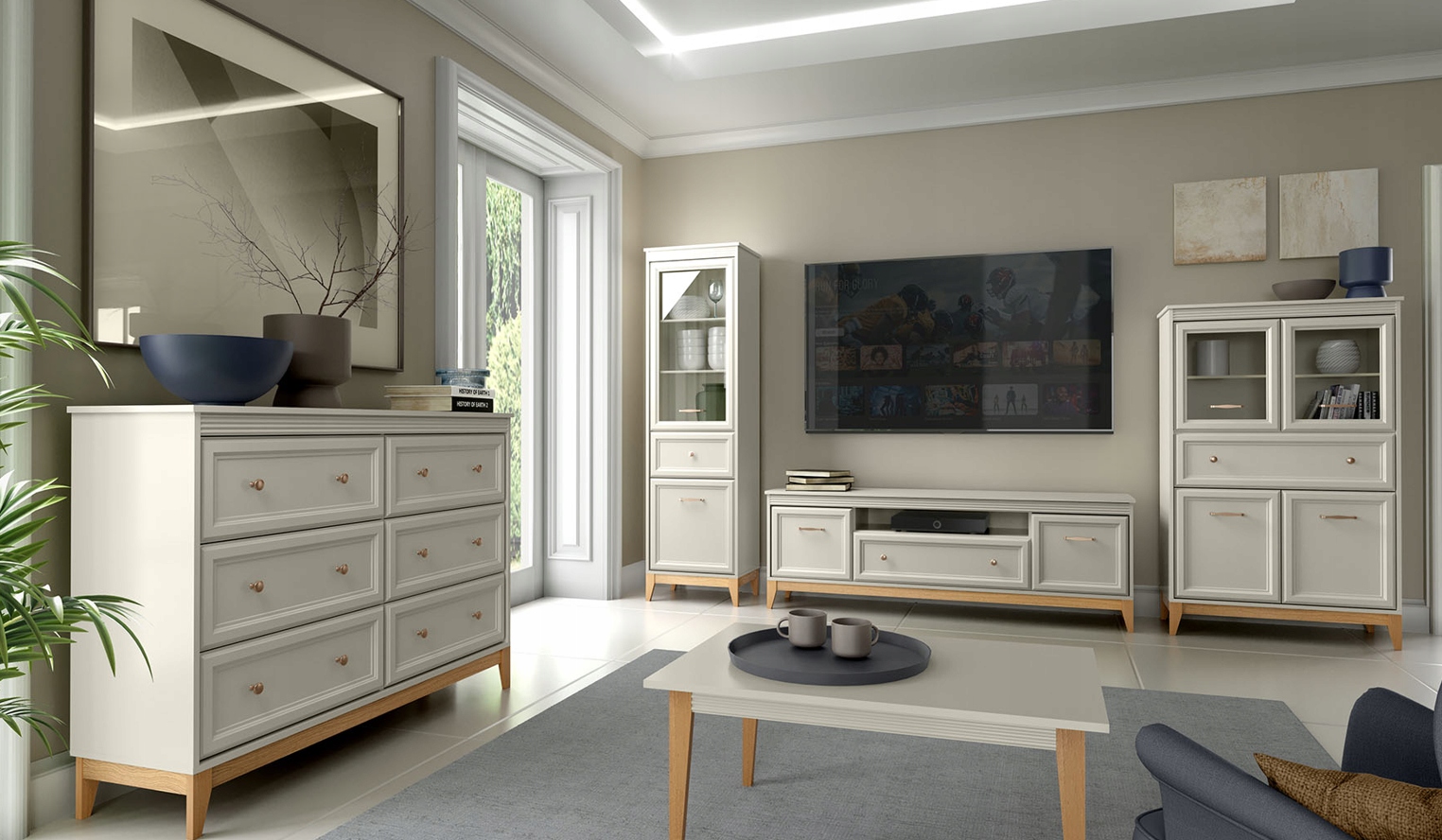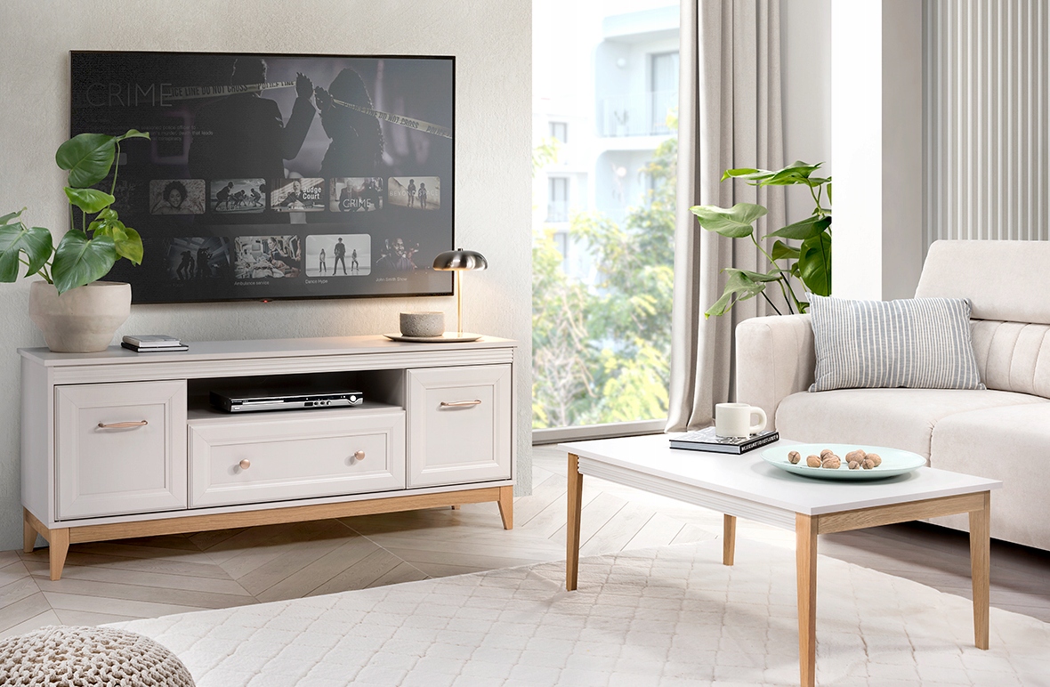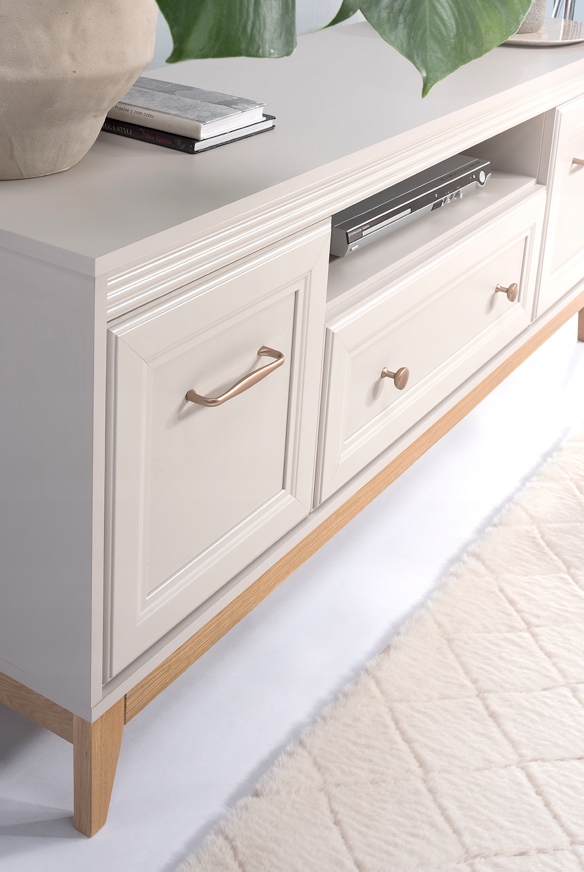 Witryna WINDSOR 92 2D1S to połączenie klasycznej elegancji i nowoczesnej funkcjonalności. Subtelne frezowane fronty z płyty MDF, przeszklenie w górnej części drzwi oraz dekoracyjna listwa podblatowa tworzą harmonijną całość, która doda wnętrzu wyjątkowego charakteru. Ciepły odcień kaszmiru (EGER U702) wprowadza do pomieszczenia spokój i elegancję.