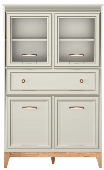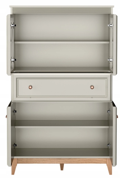 Model o szerokości 92 cm został wyposażony w dwie pojemne szafki (górna przeszklona, dolna pełna) oraz jedną szufladę na prowadnicach kulkowych z miękkim domykiem, co zapewnia praktyczne przechowywanie i komfort użytkowania. Naturalne nogi z litego dębu o wysokości 15 cm dodają konstrukcji lekkości i podkreślają jej wysoką jakość.