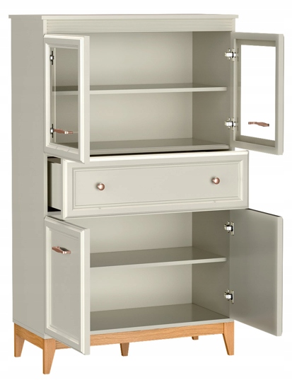 Korpus wykonano z laminowanej płyty meblowej EGER U702, a fronty z frezowanej płyty MDF z hartowanym szkłem w przeszkleniu. Całość uzupełniają metalowe uchwyty w kolorze miedzi, które podkreślają elegancki charakter kolekcji. Mebel jest przeznaczony do samodzielnego montażu – w zestawie znajduje się instrukcja i komplet okuć.