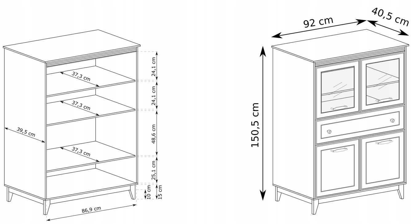 • Witryna WINDSOR 92 2D1S – szerokość: 92 cm, wysokość: 150,5 cm, głębokość: 40,5 cm