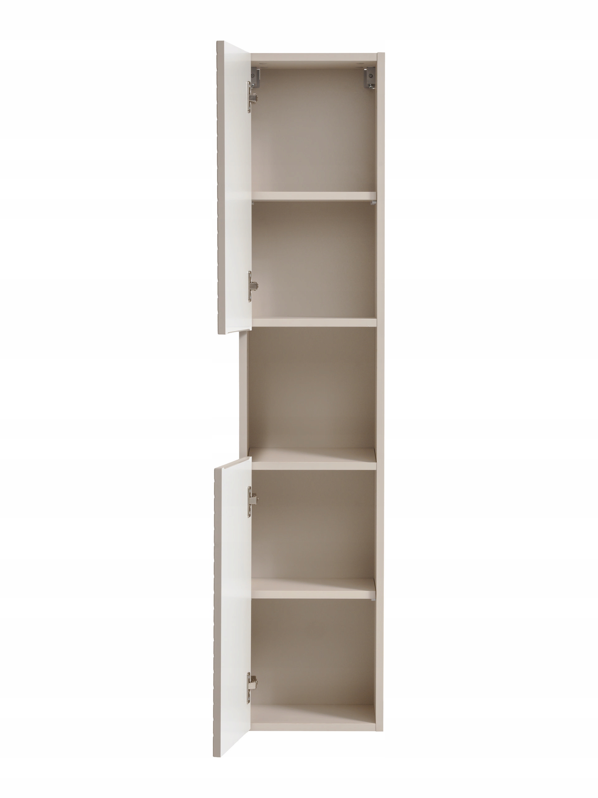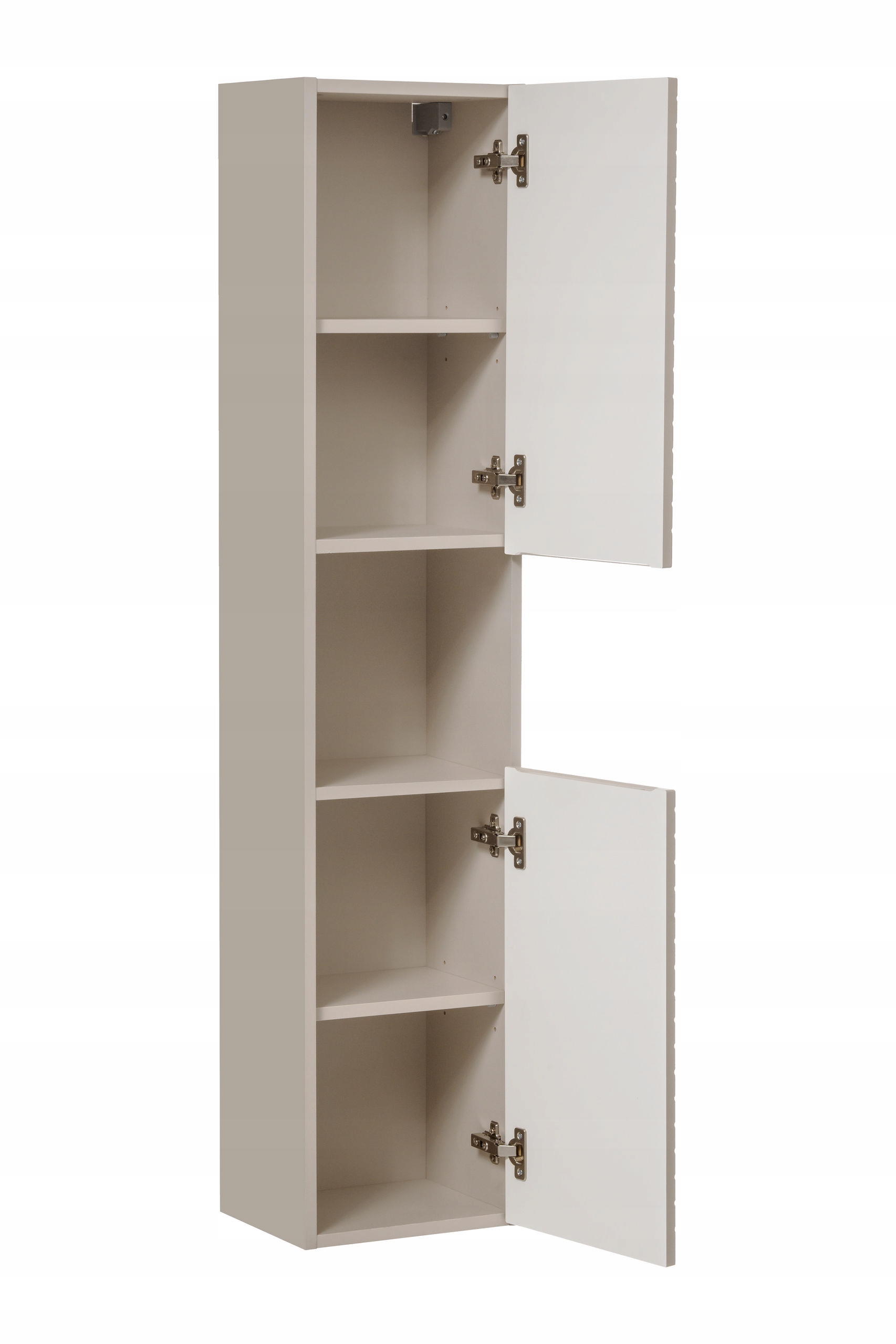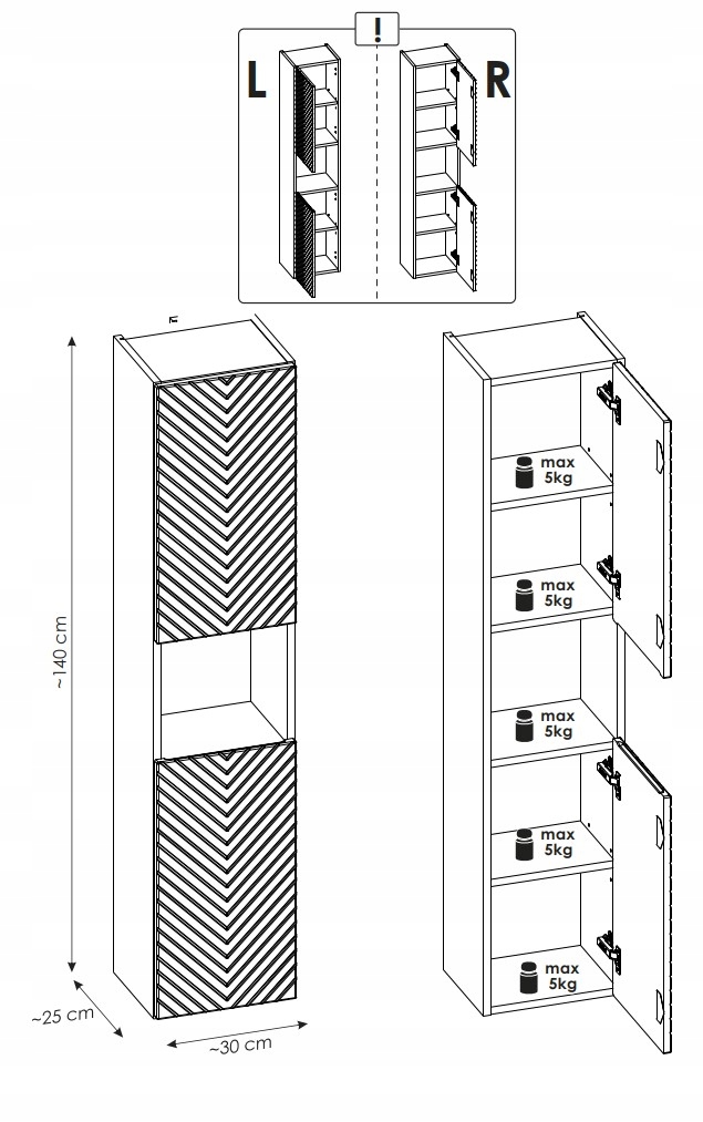 Dwoje drzwi – górne i dolne – wyposażone zostały w zawiasy z funkcją SOFT CLOSE, które zapewniają ciche i komfortowe domykanie. Frezowany uchwyt zintegrowany z frontem podkreśla nowoczesny charakter mebla, jednocześnie zapewniając wygodne użytkowanie. Dodatkowym atutem jest uniwersalny montaż drzwi, który umożliwia ich instalację zarówno po lewej, jak i prawej stronie – dzięki czemu słupek łatwo dopasować do każdego układu łazienki.