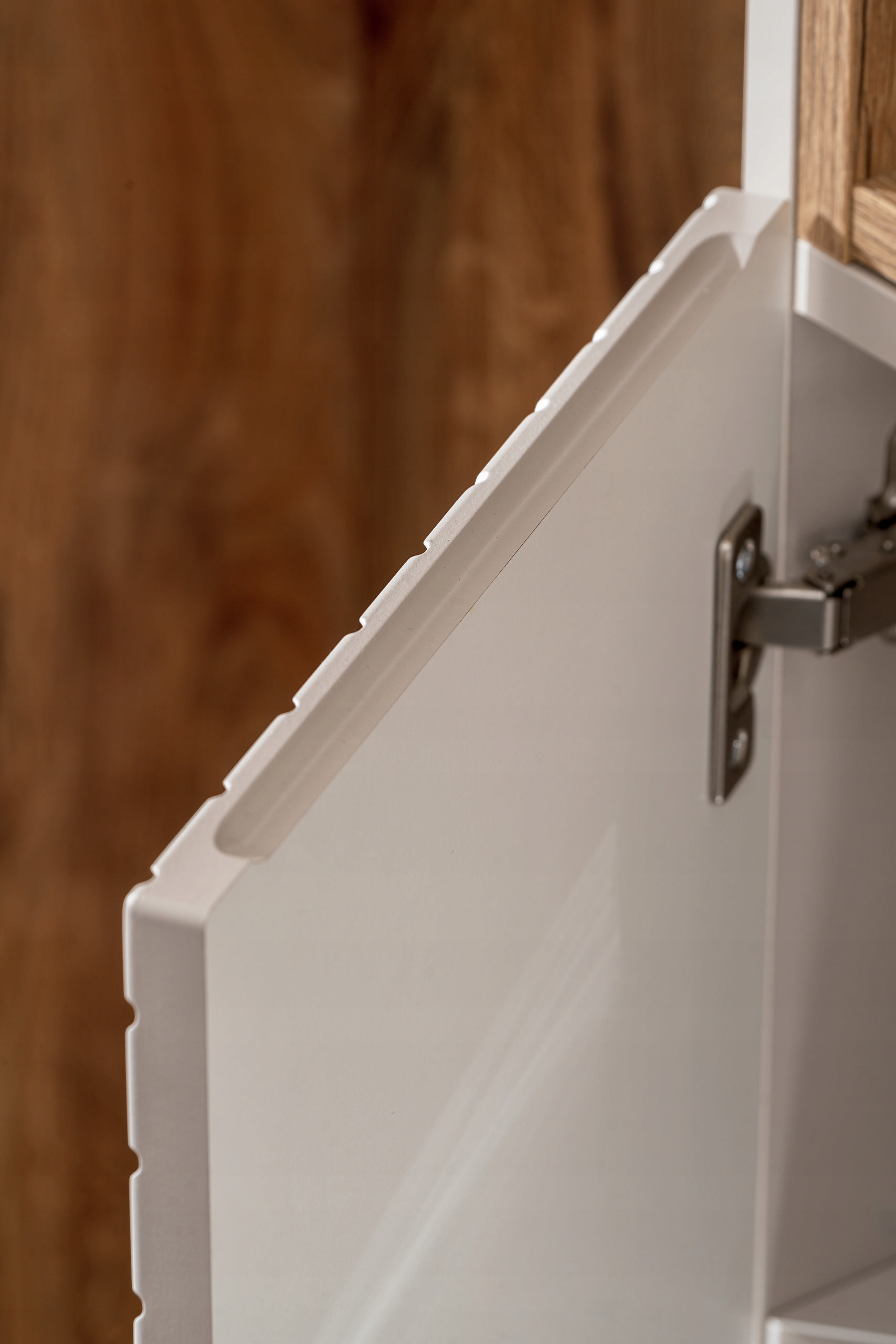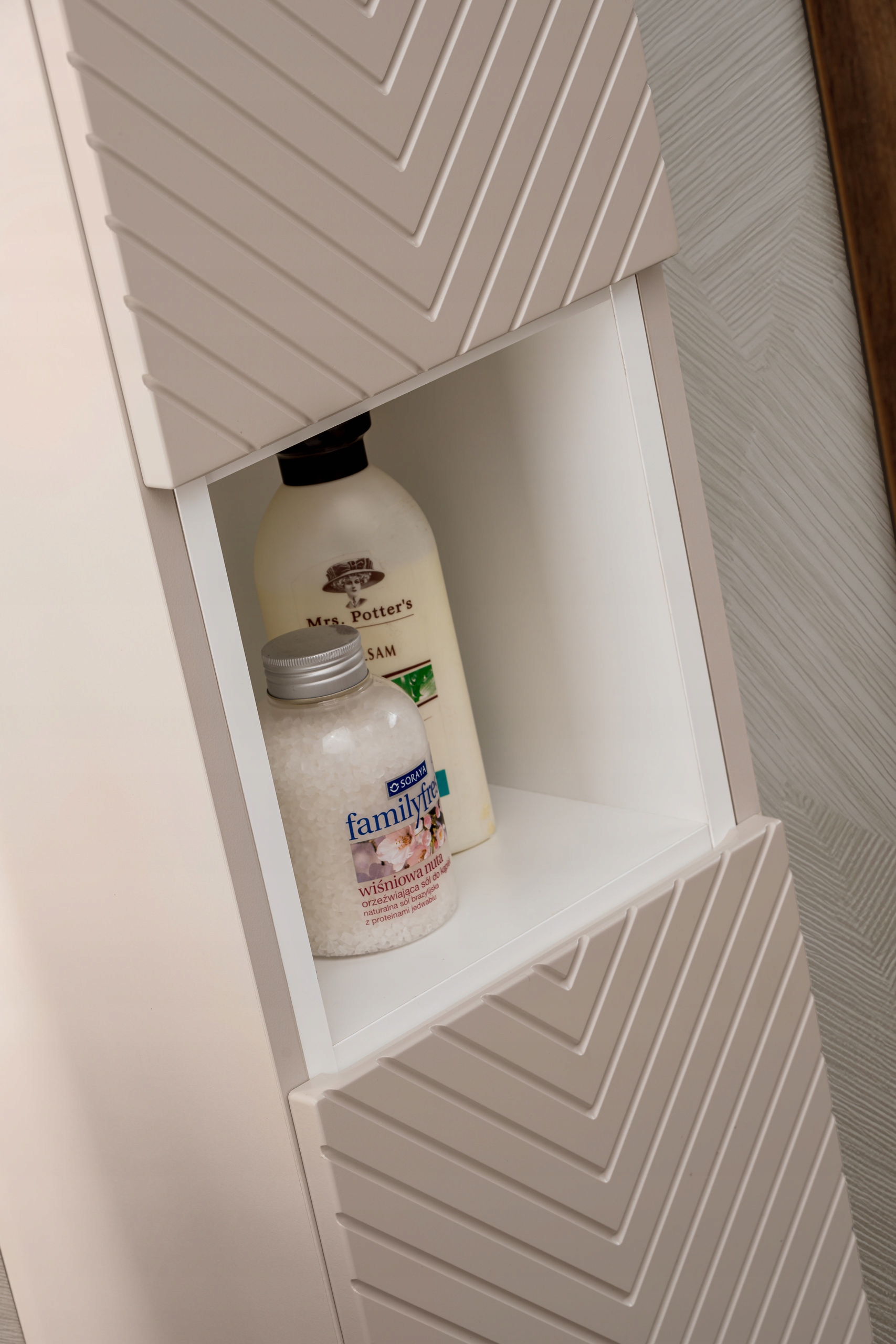Słupek łazienkowy z kolekcji VIVA to połączenie eleganckiego wzornictwa i przemyślanej funkcjonalności. Fronty w odcieniu kaszmiru ozdobione są wyrazistym, frezowanym wzorem jodełki, który nadaje meblowi unikalny charakter i przyciąga wzrok. Na środku słupka umieszczono otwartą półkę, idealną na często używane kosmetyki lub dekoracyjne akcenty, które wprowadzą do wnętrza osobisty styl.