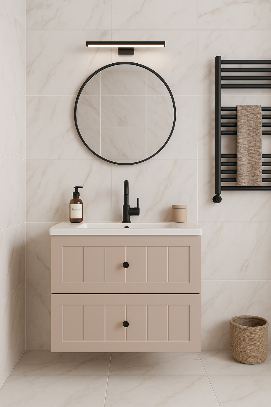 Oferujemy nowoczesny, wiszący mebel z kolekcji Gusto, który doskonale łączy funkcjonalność z eleganckim designem. Korpus wykonany jest z trwałej płyty laminowanej o grubości 16 mm, natomiast fronty to frezowane płyty MDF o grubości 19 mm, które nadają całości subtelnego, klasycznego charakteru. Mebel wyposażony jest w 2 drzwi z uniwersalnym montażem – lewo lub prawostronnym oraz zawiasy z systemem cichego domyku (SOFT CLOSE), co zapewnia komfort użytkowania i wydłużoną żywotność mechanizmów. W zestawie znajdują się trzy komplety metalowych uchwytów w modnych kolorach: czarnym, złotym i srebrnym, co pozwala na dopasowanie mebla do indywidualnych preferencji i stylu wnętrza. Całość uzupełnia czytelna instrukcja montażu, dzięki której złożenie mebla jest szybkie i bezproblemowe. Kolekcja Gusto dostępna jest w trzech eleganckich kolorach – białym, kaszmirowym oraz czarnym, dzięki czemu idealnie wpisuje się zarówno w nowoczesne, jak i klasyczne aranżacje łazienkowe. Produkt został wyprodukowany w Polsce, co gwarantuje wysoką jakość wykonania i trwałość na lata. Wybierając ten mebel, stawiasz na design, wygodę i ponadczasowy styl.