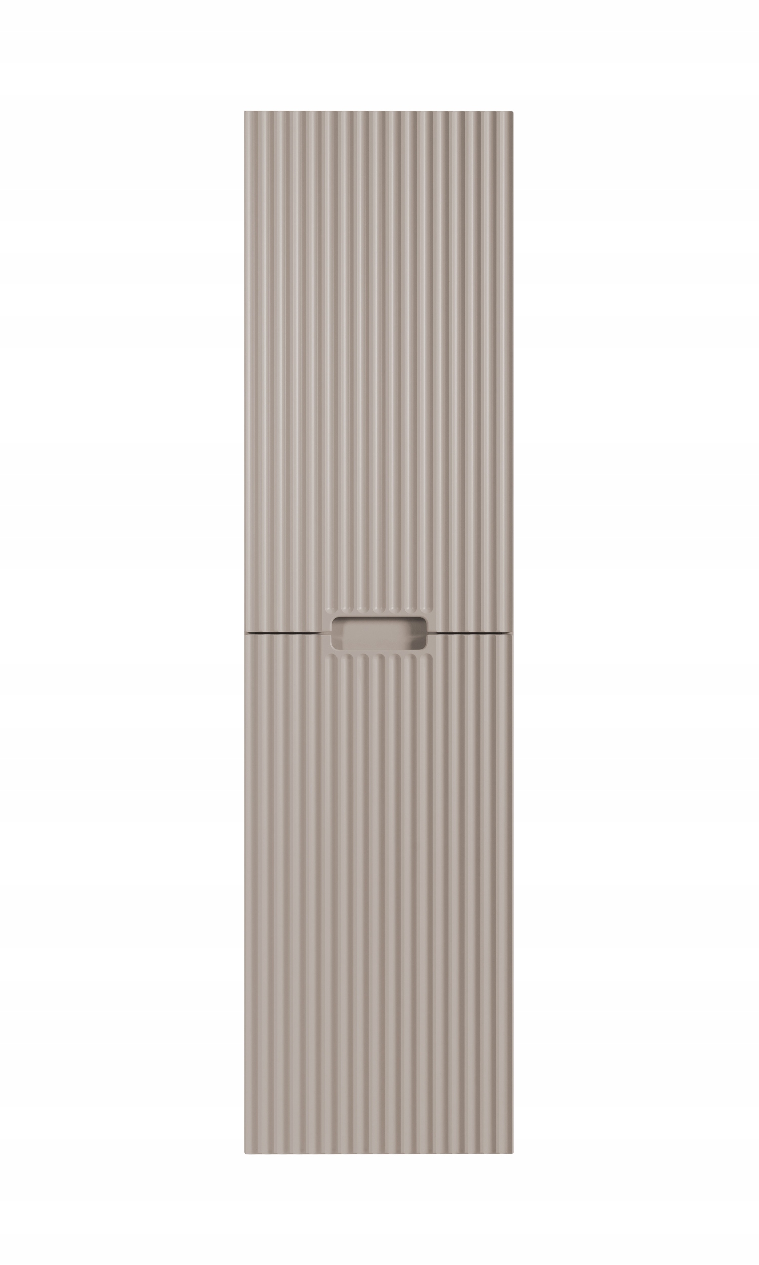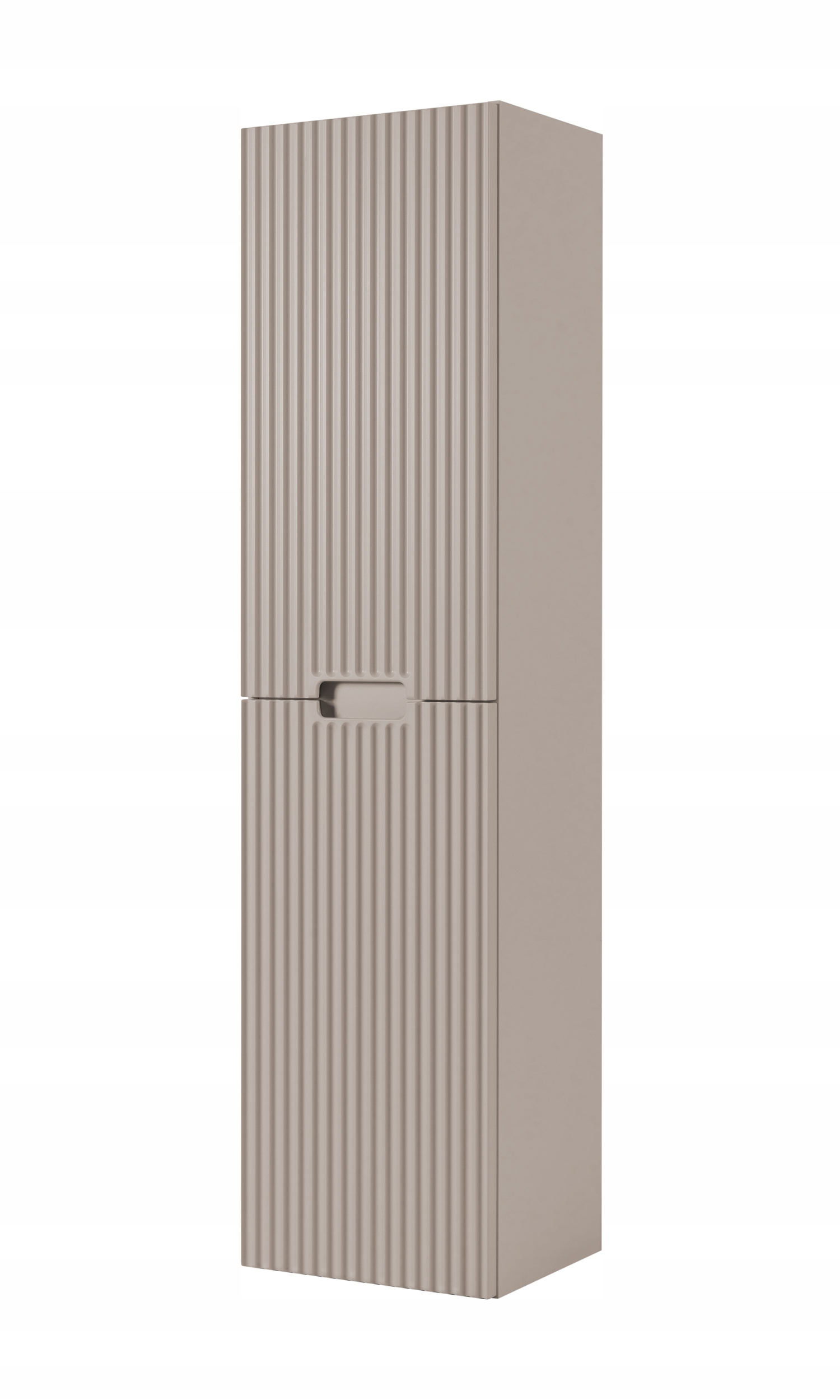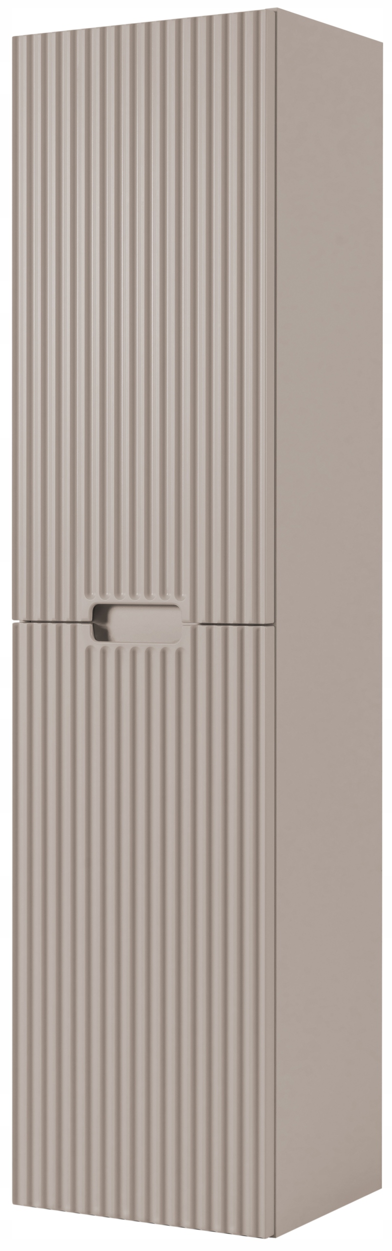 Słupek łazienkowy z kolekcji VENA w kolorze kaszmir to elegancka i funkcjonalna propozycja do nowoczesnych wnętrz. Delikatna, stonowana kolorystyka w połączeniu z dekoracyjnym ryflowanym frontem nadaje meblowi subtelny, ale wyrazisty charakter. Zintegrowany uchwyt frezowany harmonijnie wtapia się w powierzchnię frontu, zapewniając wygodę użytkowania bez potrzeby stosowania wystających elementów. Za dwojgiem drzwi znajdują się praktyczne półki, idealne do przechowywania codziennych akcesoriów łazienkowych.