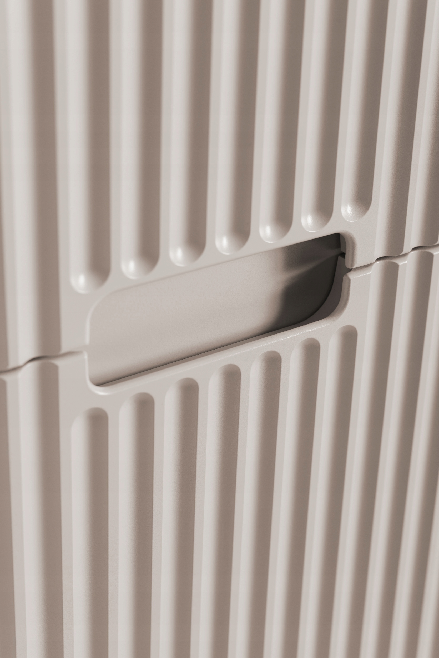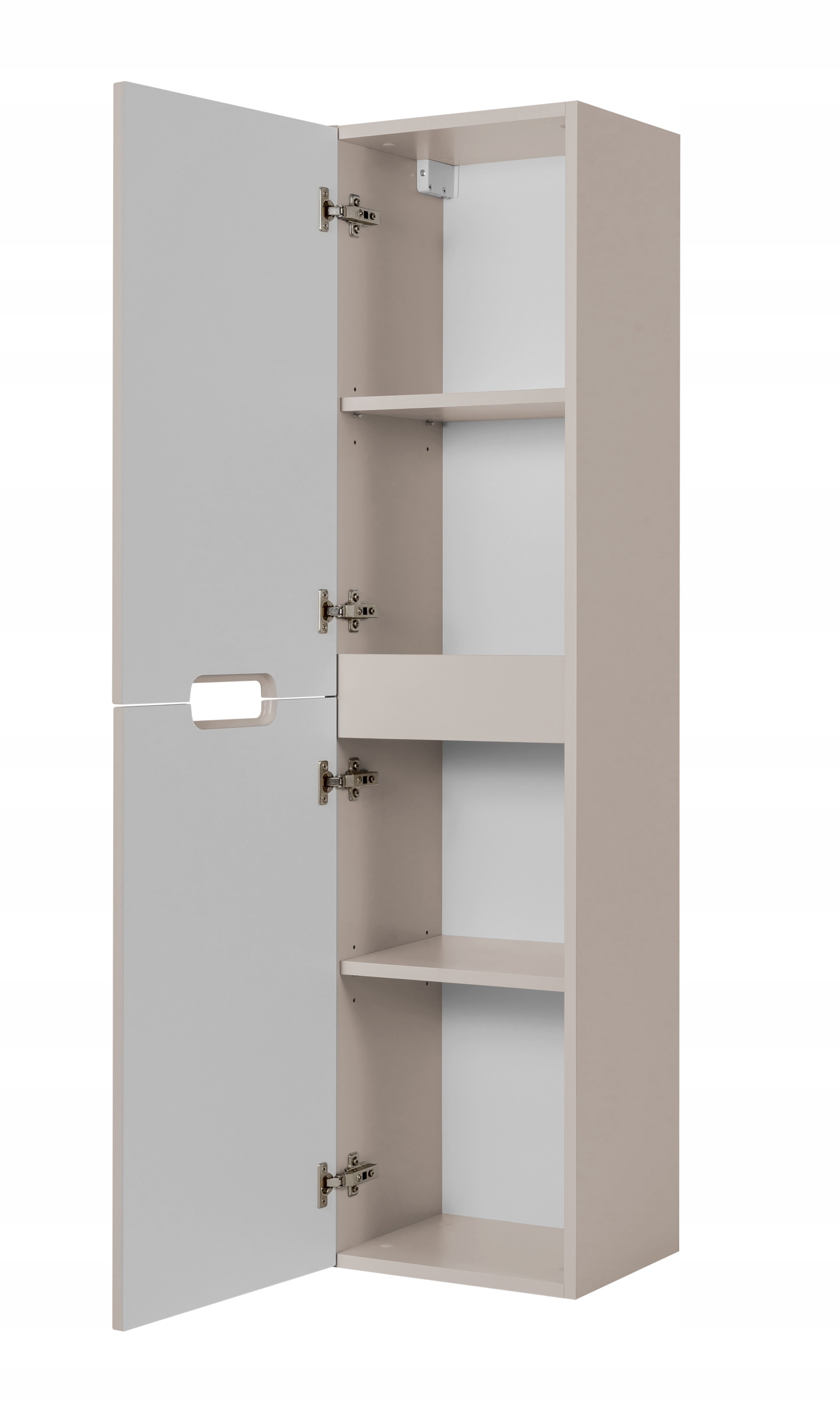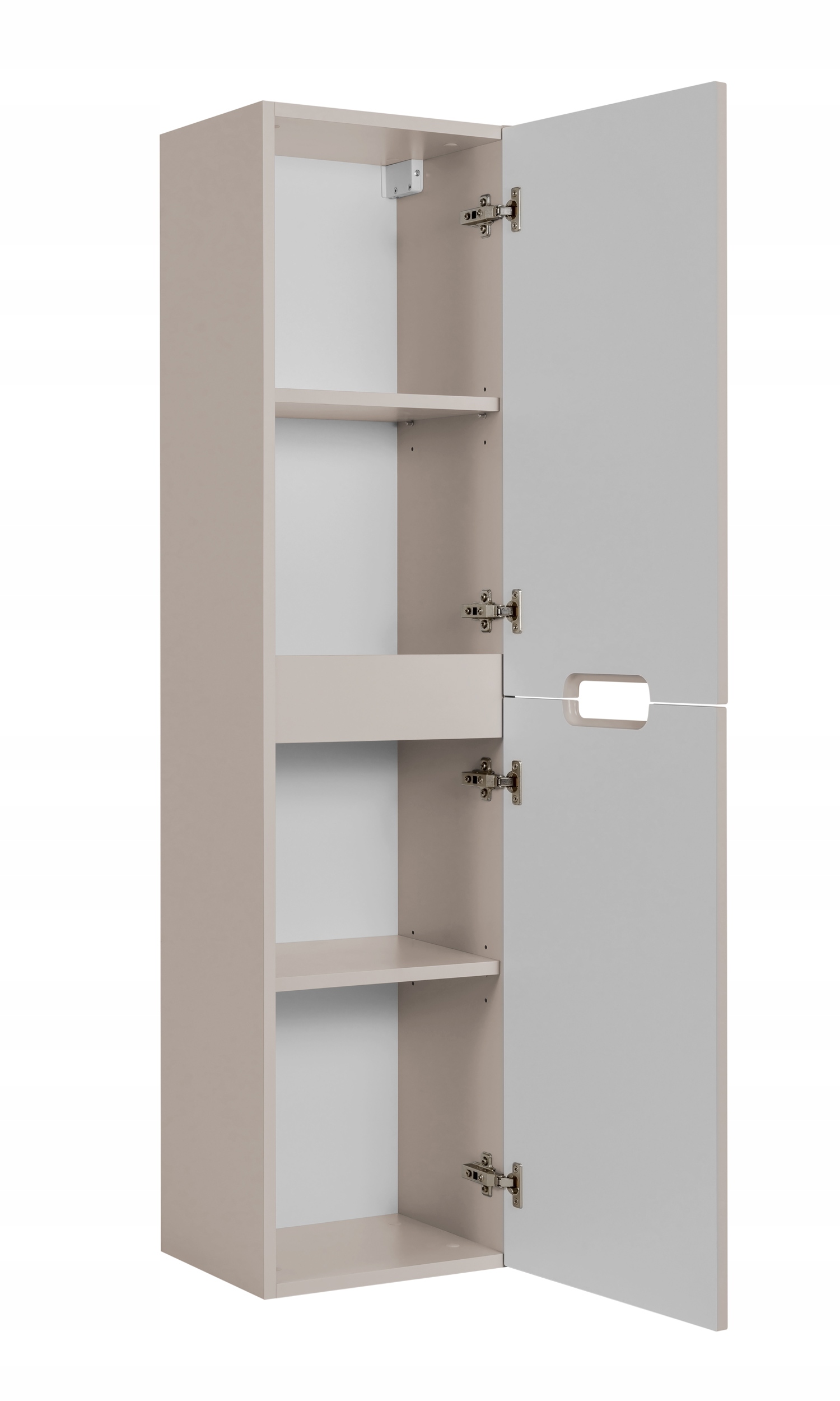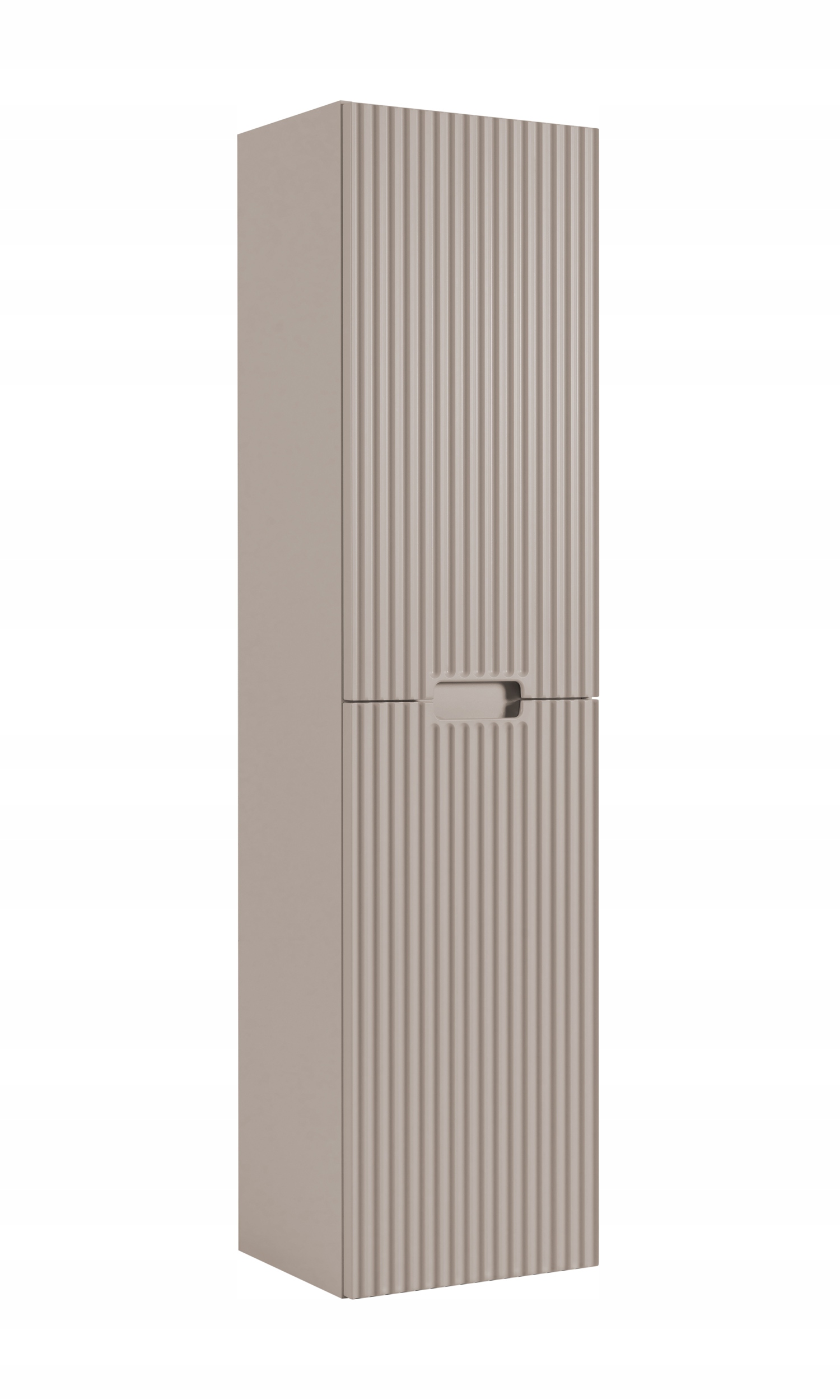 Słupek łazienkowy z kolekcji VENA w kolorze kaszmir to elegancka i funkcjonalna propozycja do nowoczesnych wnętrz. Delikatna, stonowana kolorystyka w połączeniu z dekoracyjnym ryflowanym frontem nadaje meblowi subtelny, ale wyrazisty charakter. Zintegrowany uchwyt frezowany harmonijnie wtapia się w powierzchnię frontu, zapewniając wygodę użytkowania bez potrzeby stosowania wystających elementów. Za dwojgiem drzwi znajdują się praktyczne półki, idealne do przechowywania codziennych akcesoriów łazienkowych.