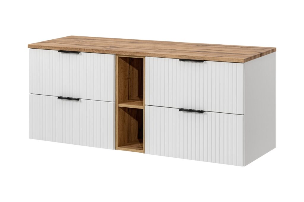 Wykonana z dębu craft złotego z białym frontem w połysku, szafka emanuje elegancją i stylem, tworząc harmonijną całość w Twojej łazience. Dodatkowo, uniwersalny montaż drzwi (prawo lub lewostronny) oraz zaokrąglone kanty nadają meblowi lekkości i nowoczesnego charakteru.