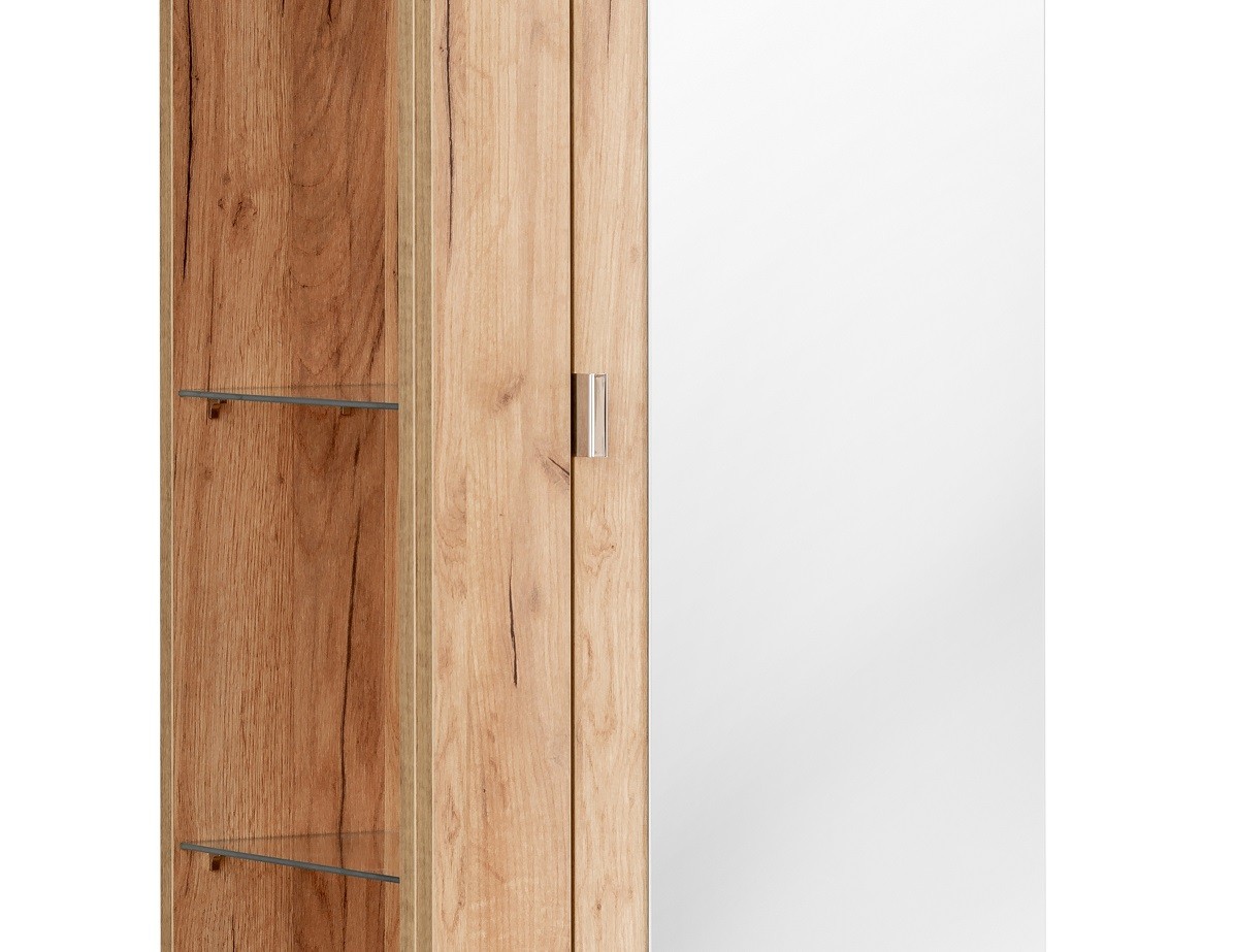 Kolekcja CAPRI OAK łączy w sobie prostą formę z pięknym dekorem, tworząc harmonijne wnętrze. Metalowe uchwyty krawędziowe oraz funkcja cichego domyku to nowoczesne akcenty, które podnoszą komfort użytkowania. Praktyczne półki szklane z boku szafki zapewniają dodatkową przestrzeń na kosmetyki i akcesoria.