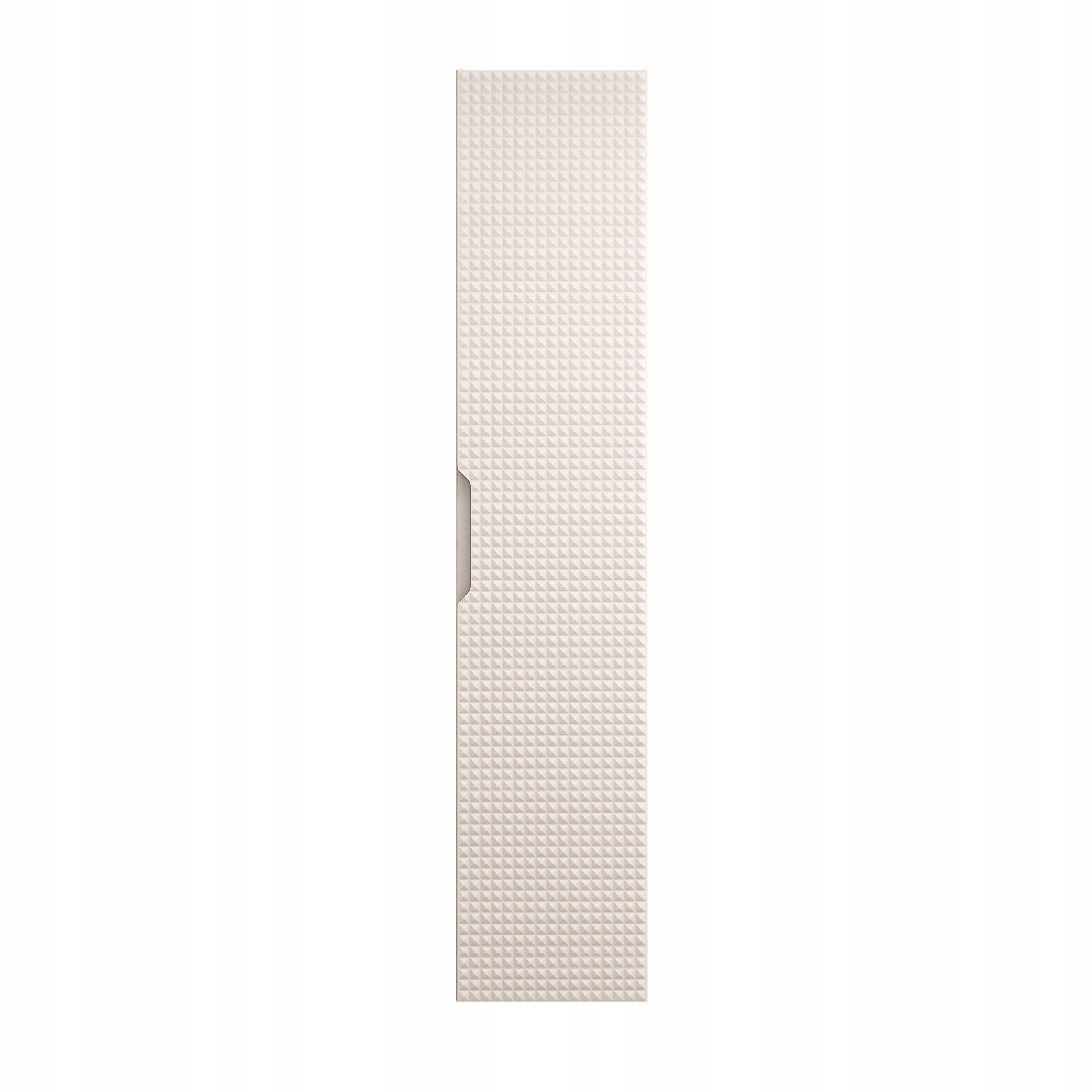 Wyróżnia się frontami 3D, które nadają mu niepowtarzalny charakter, a subtelny beżowy kolor w połączeniu z olejowanym dębem wprowadza ciepło do wnętrza. Słupek wyposażony jest w 4 półki, które oferują dodatkowe miejsce na kosmetyki i akcesoria, a funkcjonalne drzwi z cichym domykiem zapewniają komfort użytkowania.