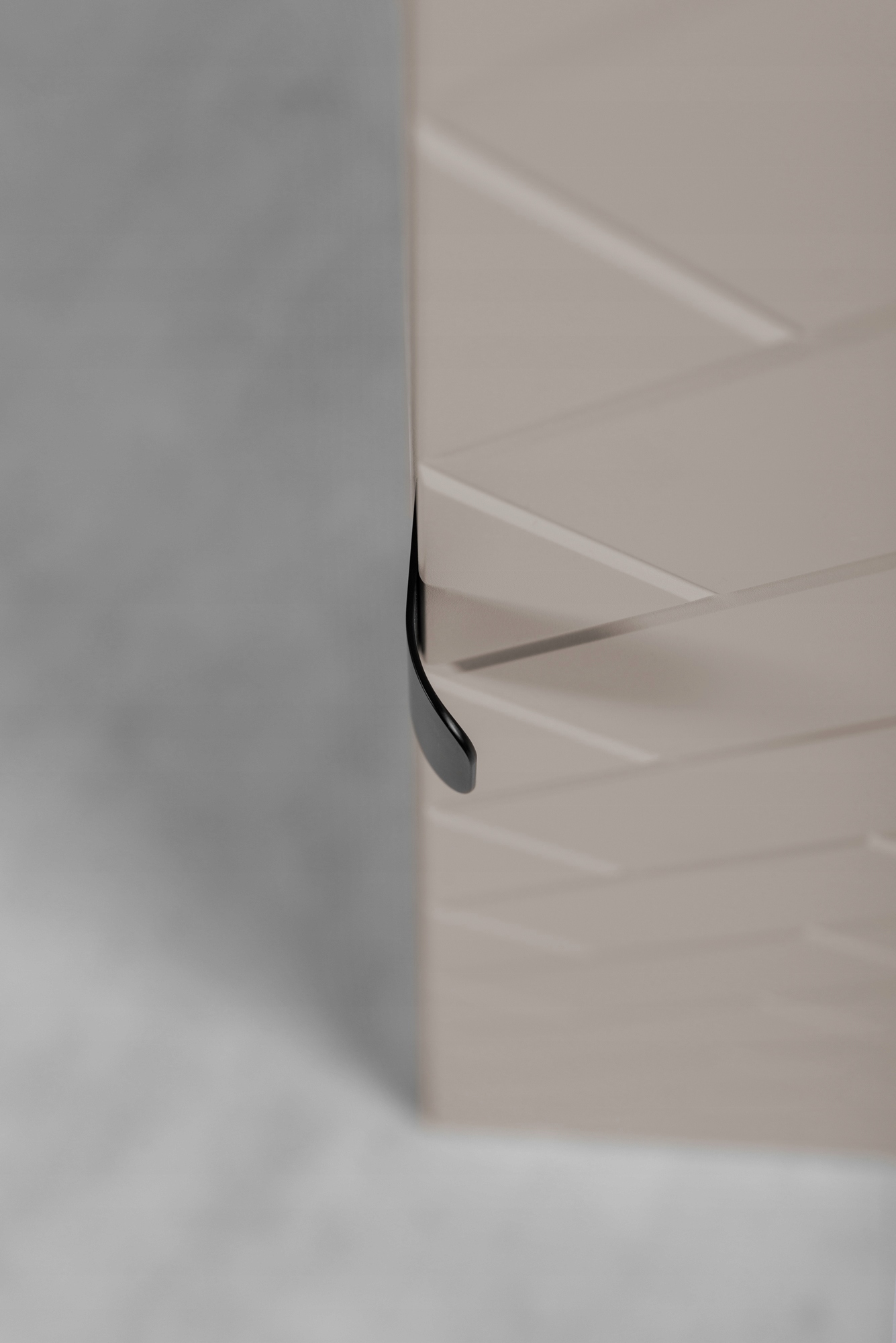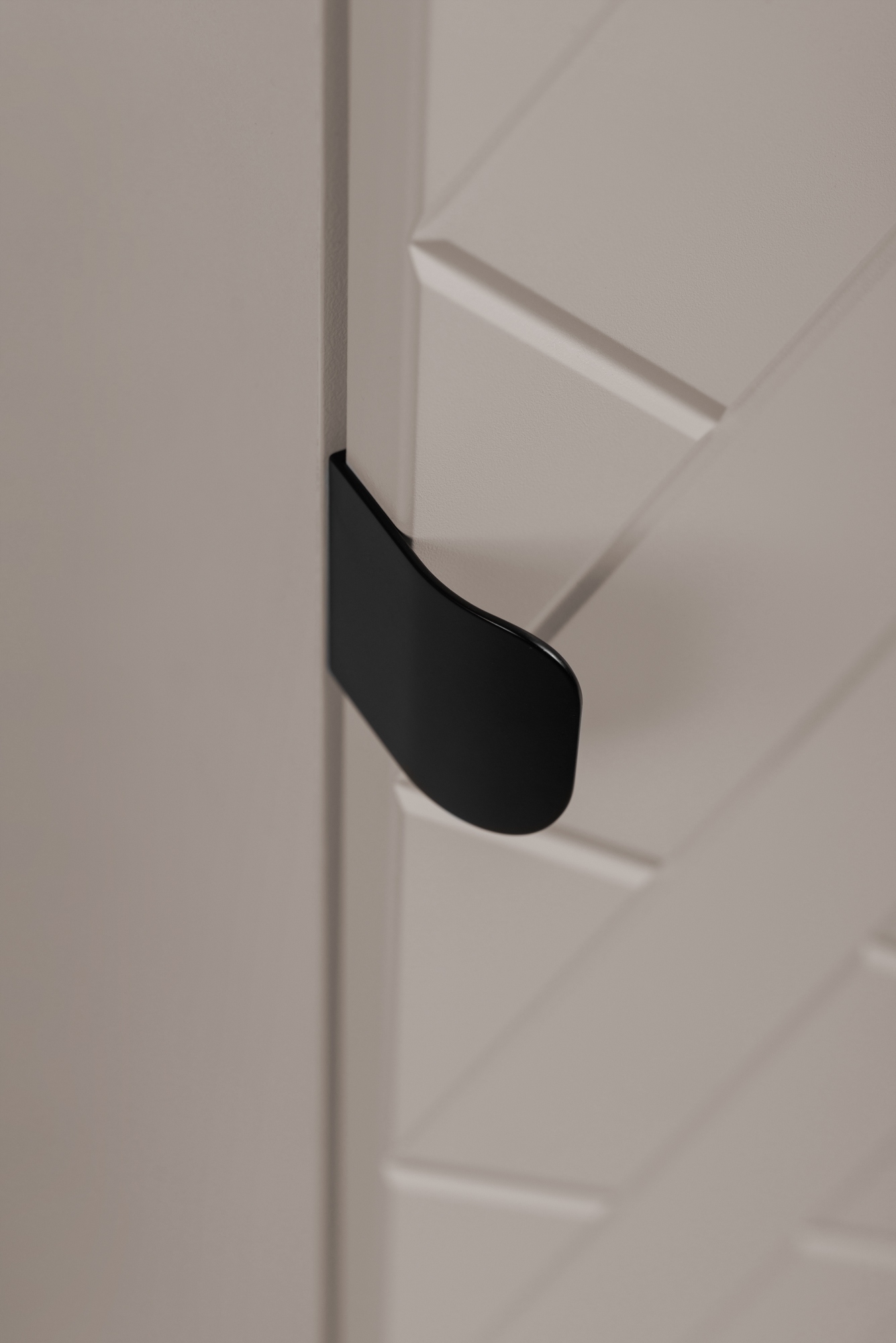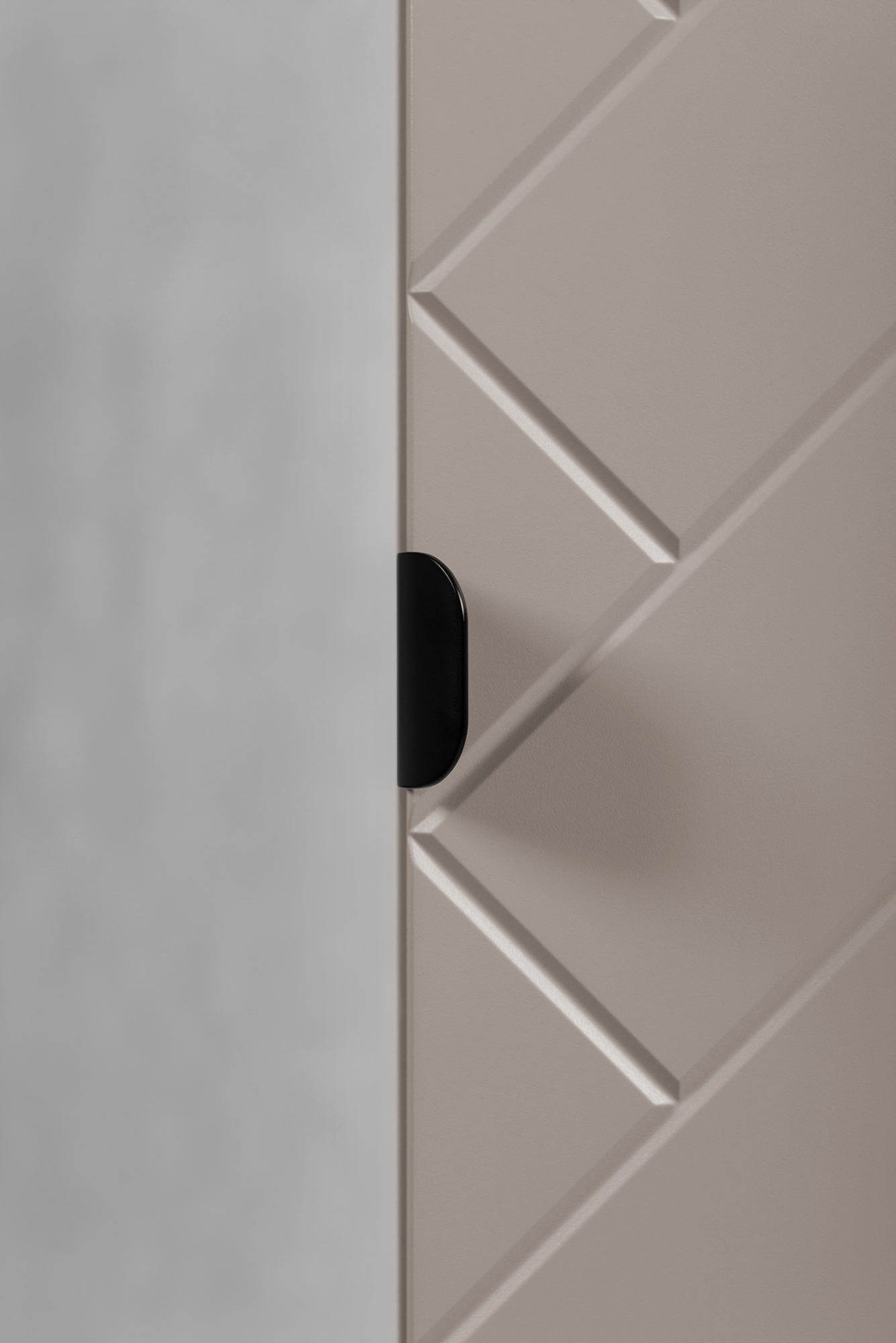 Zastosowane uchwyty krawędziowe są dostępne w trzech eleganckich kolorach: złotym, czarnym i srebrnym, co ułatwia dopasowanie do stylu wnętrza. Mechanizm cichego domyku w szufladach i drzwiach gwarantuje komfortowe użytkowanie oraz chroni meble przed uszkodzeniami.