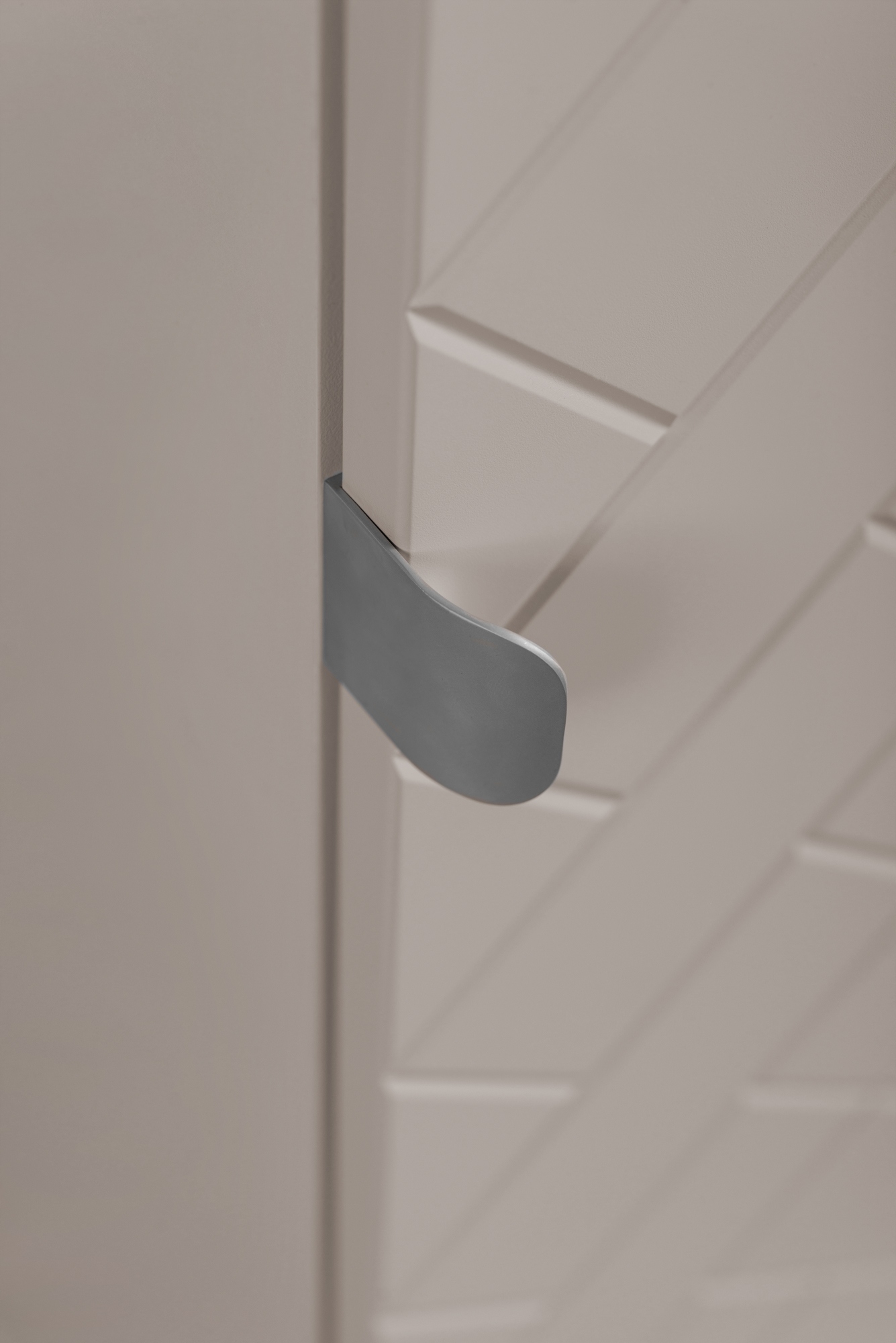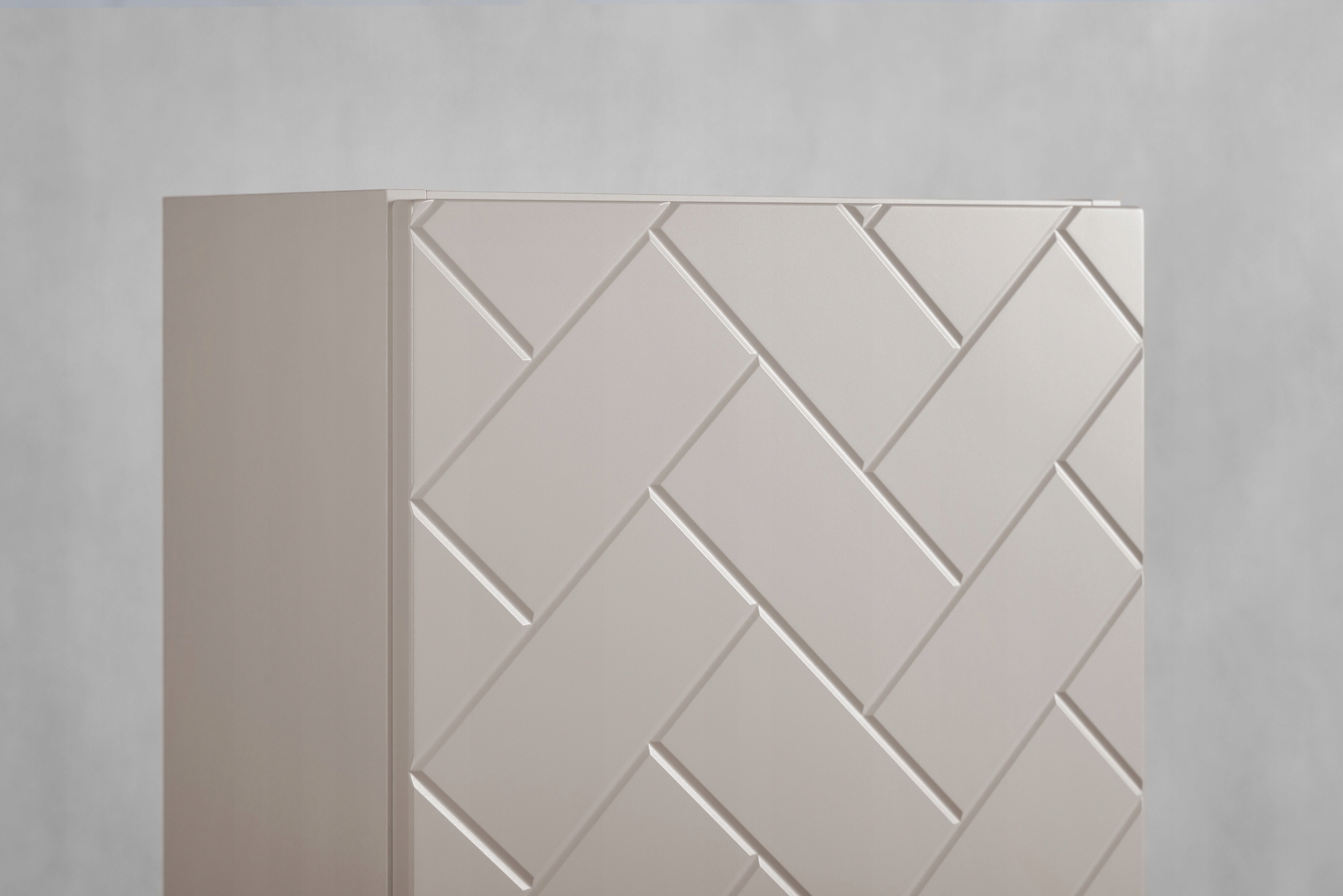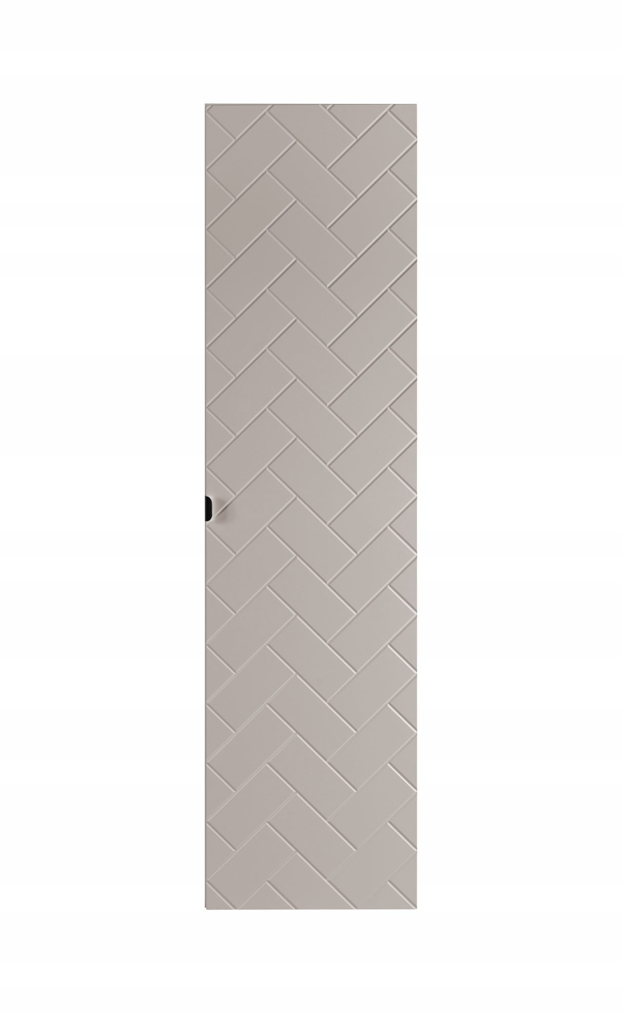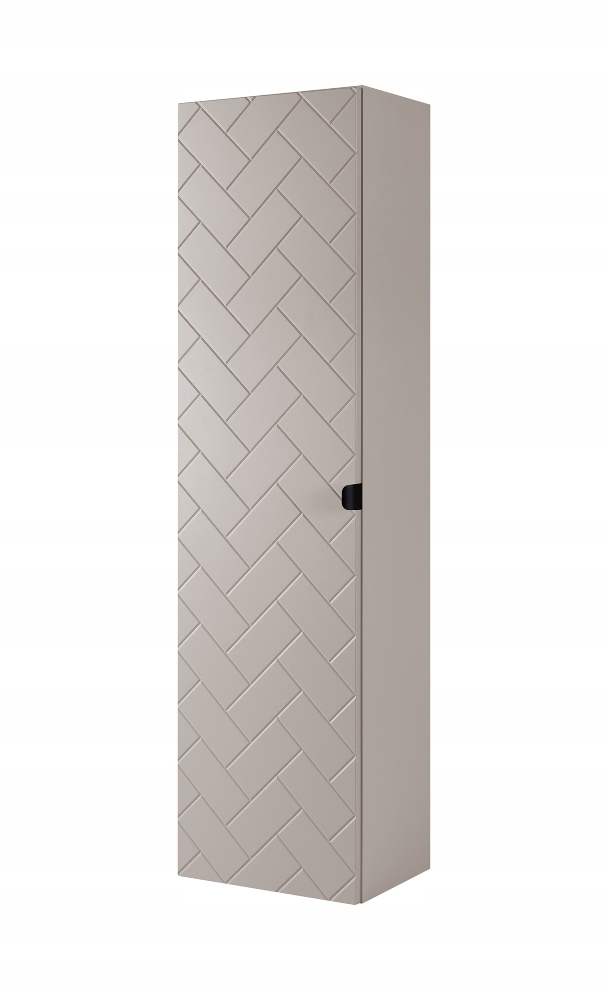 Wyróżnia się subtelnym wzorem w kształcie jodełki, który nadaje meblom unikalny charakter. W skład kolekcji wchodzi szereg elementów, w tym wysoki słupek wiszący, który zapewnia obszerną przestrzeń do przechowywania, doskonałą zarówno do małych, jak i dużych łazienek.