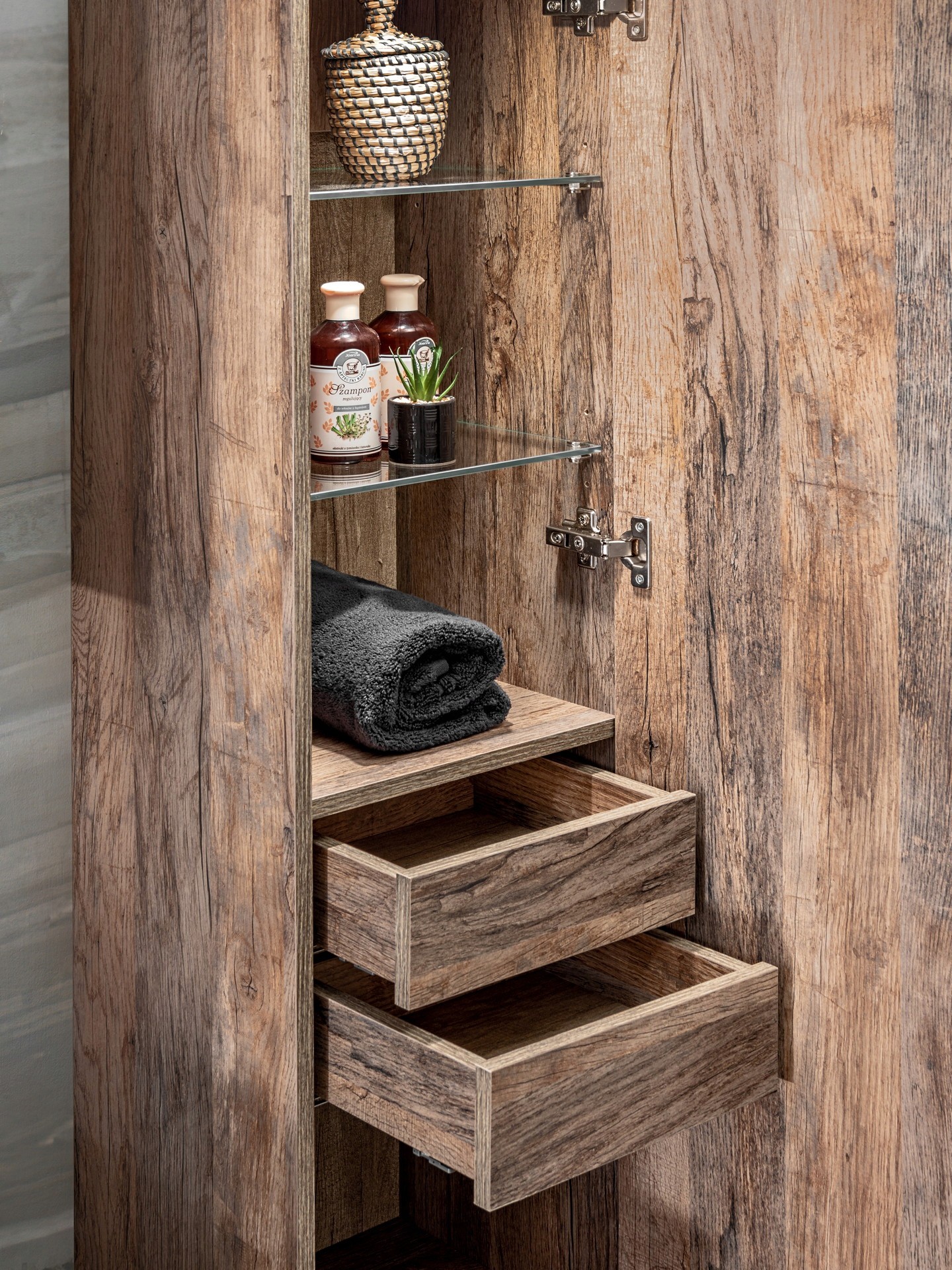 Słupek łazienkowy z kolekcji SANTA FE OAK to połączenie nowoczesnego designu i funkcjonalności. Wykonany w eleganckim kolorze dębu Vintage z chromowanymi uchwytami, dodaje lekkości każdemu wnętrzu. Praktyczne wewnętrzne szuflady oraz szklane półki umożliwiają wygodne przechowywanie niezbędnych akcesoriów łazienkowych, pomagając utrzymać porządek i estetykę w przestrzeni.