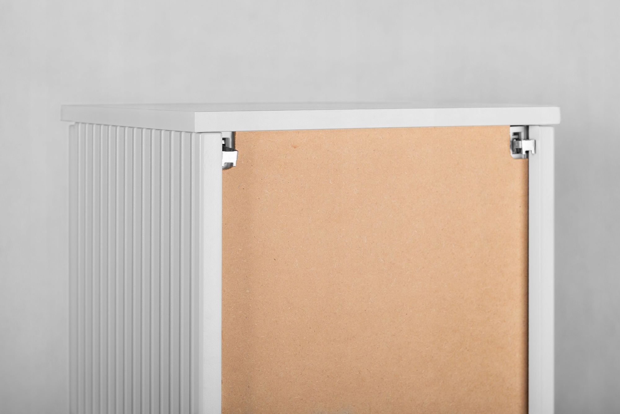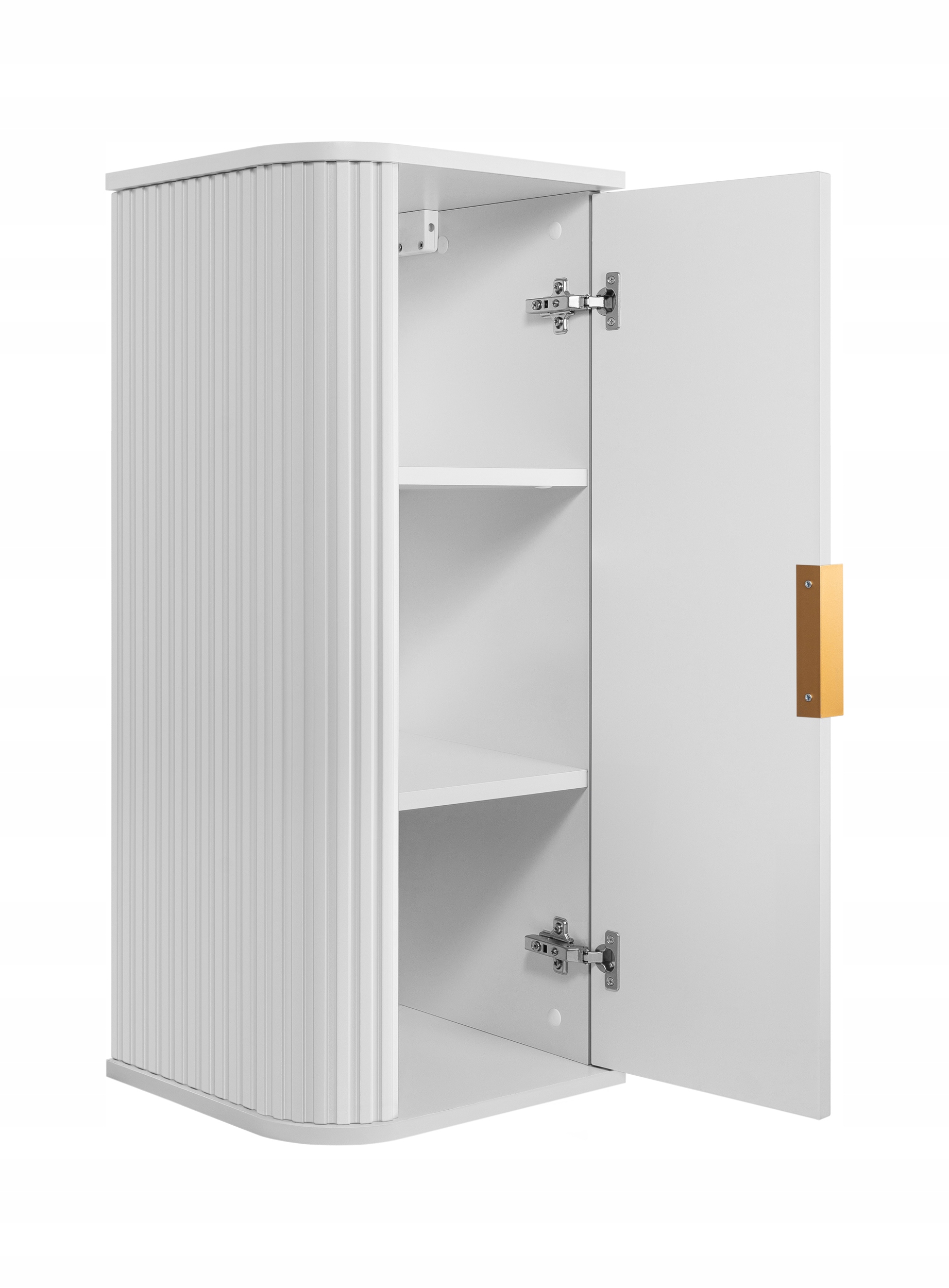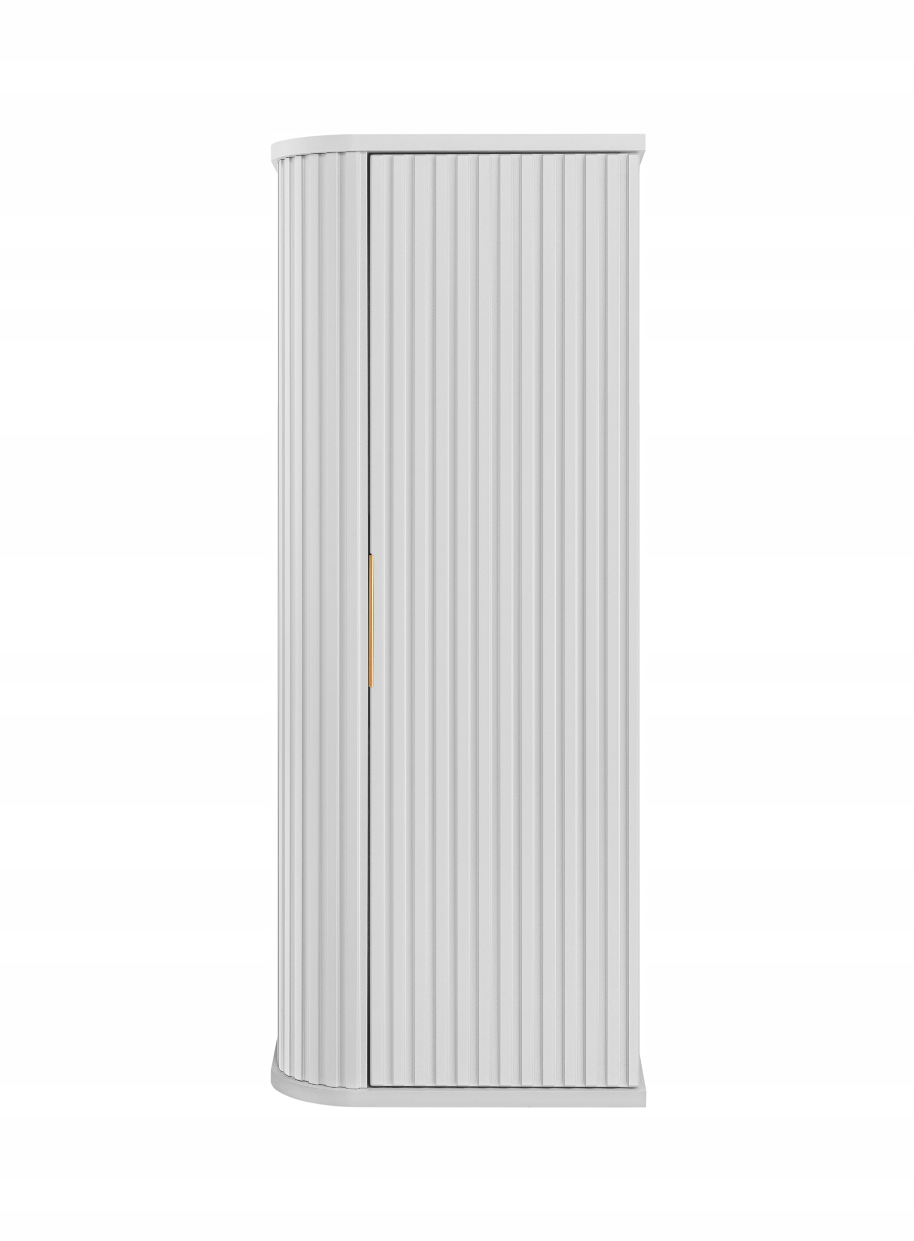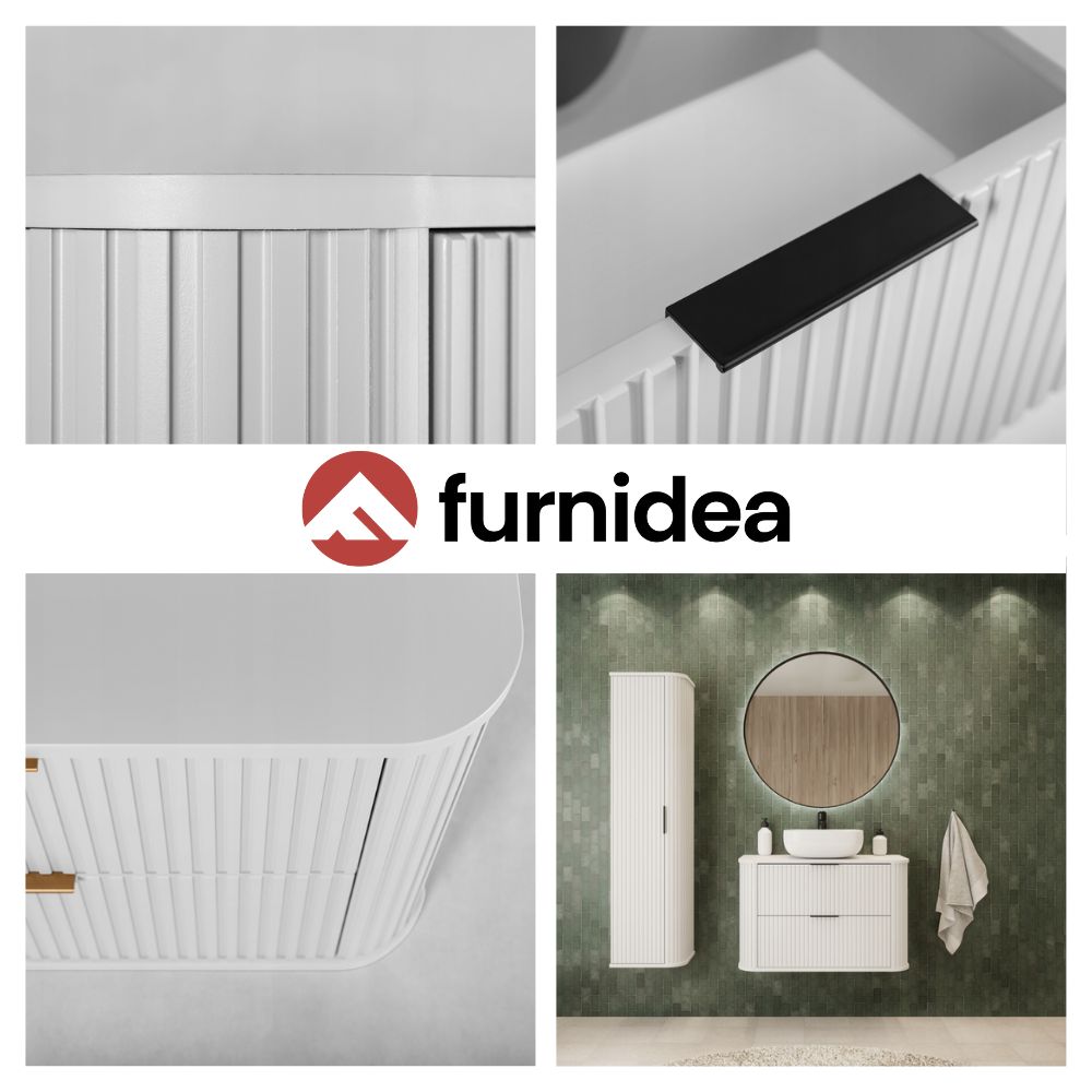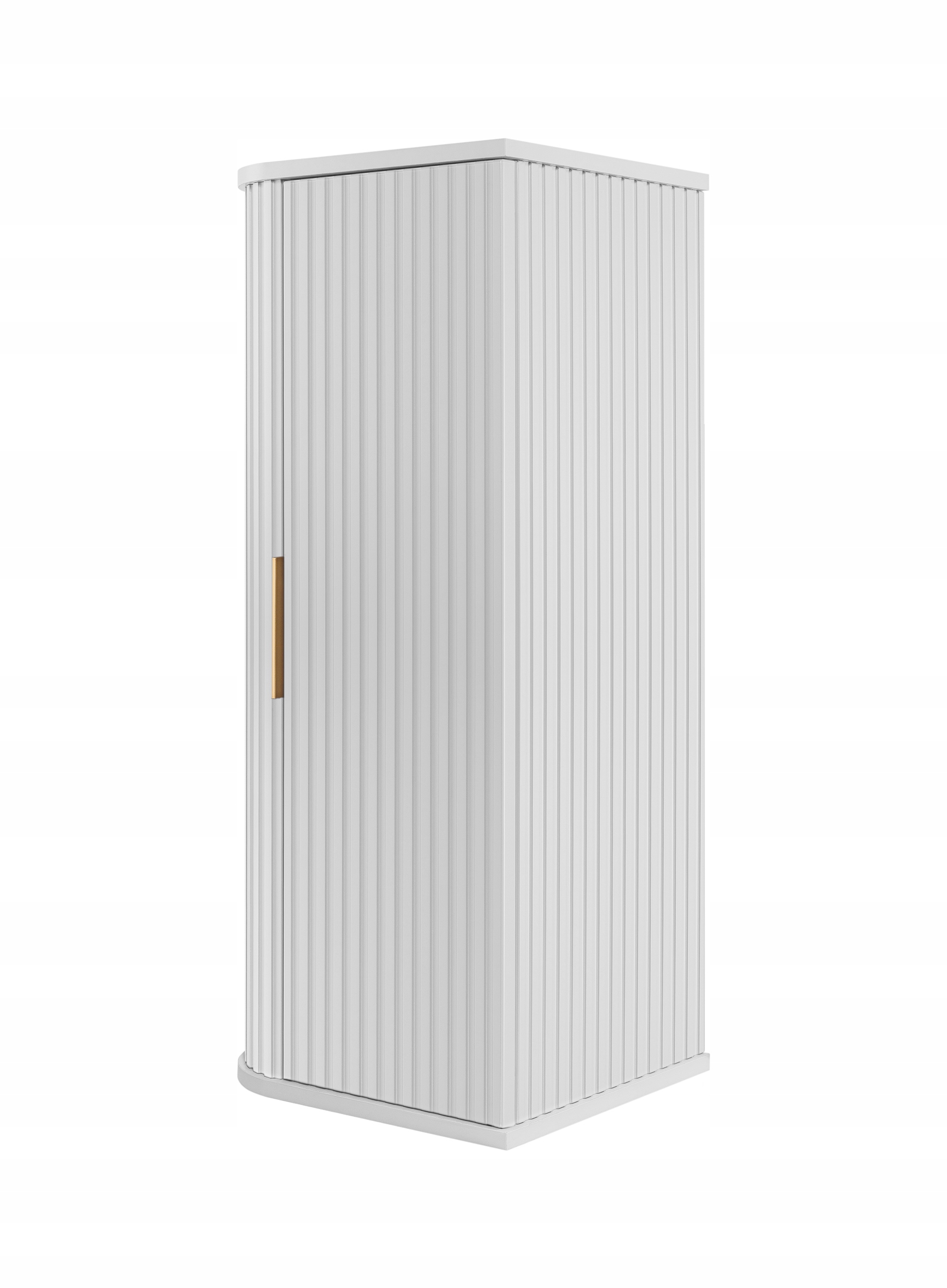 Słupek łazienkowy o wysokości 79 cm zapewnia wygodną przestrzeń do przechowywania za jednymi drzwiczkami, a praktyczne wnętrze pozwala utrzymać porządek w codziennej aranżacji. Korpus i front wykonano z płyty MDF 16 mm w białym macie, natomiast wieńce górny i dolny z wytrzymałej płyty laminowanej. Całość dopełniają ryflowane detale, które podkreślają elegancki charakter mebla.