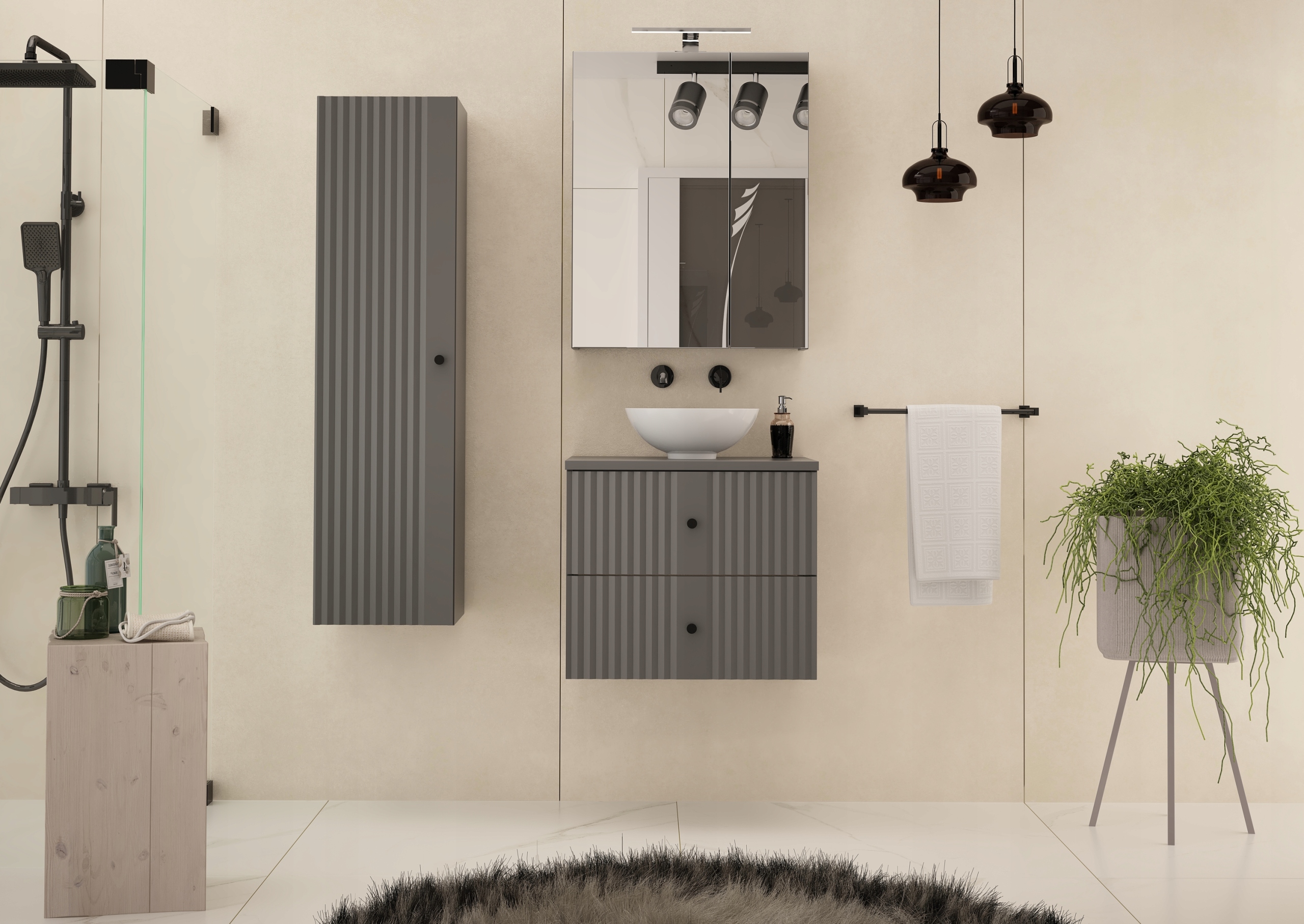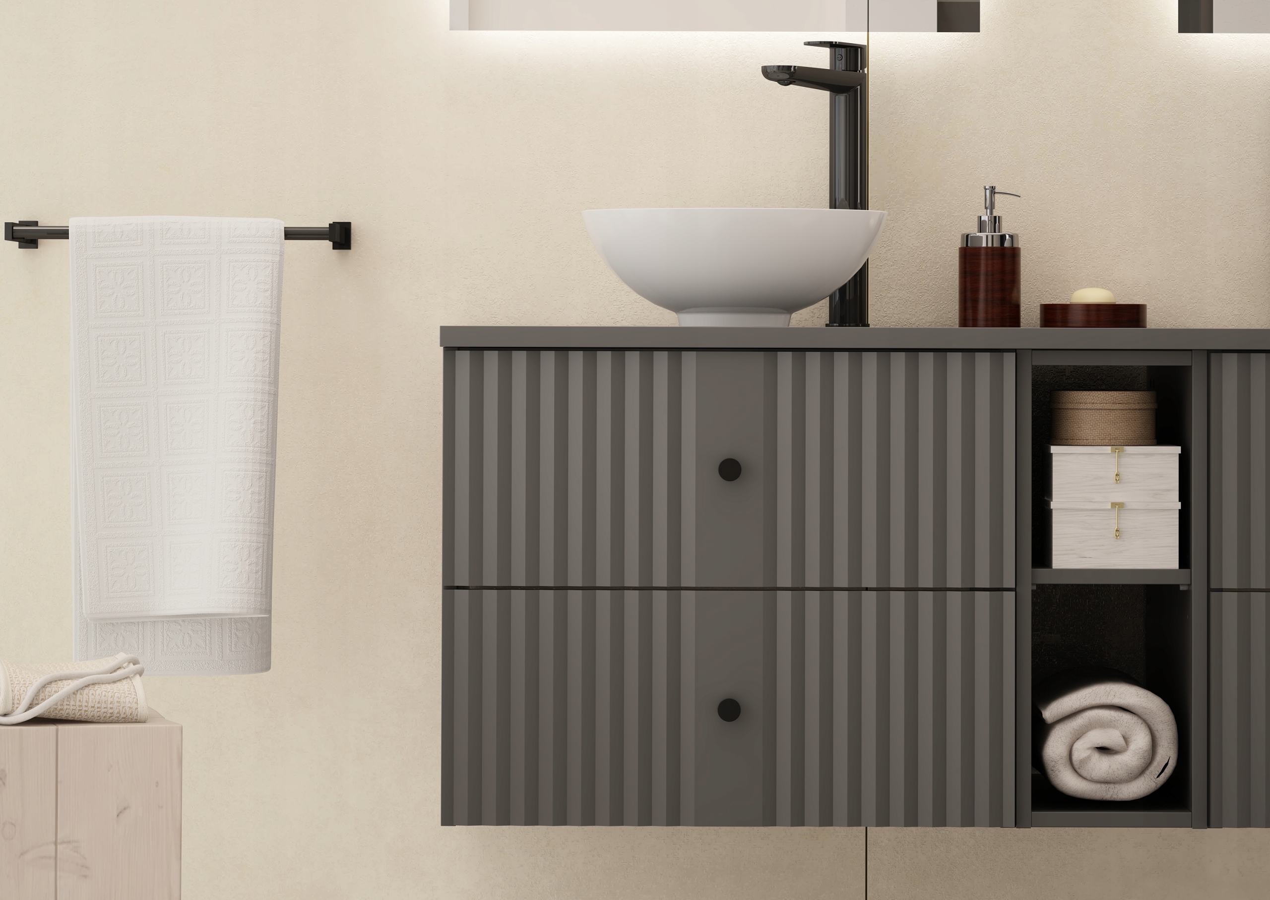 Szafka łazienkowa XILO 60 cm z blatem to idealne połączenie nowoczesnej elegancji i funkcjonalności. Głęboki, antracytowy mat nadaje wnętrzu wyjątkowej głębi i klasy, a czarne uchwyty podkreślają subtelny, industrialny styl kolekcji. To propozycja dla osób ceniących prostotę formy, jakość wykonania i ponadczasowy design.