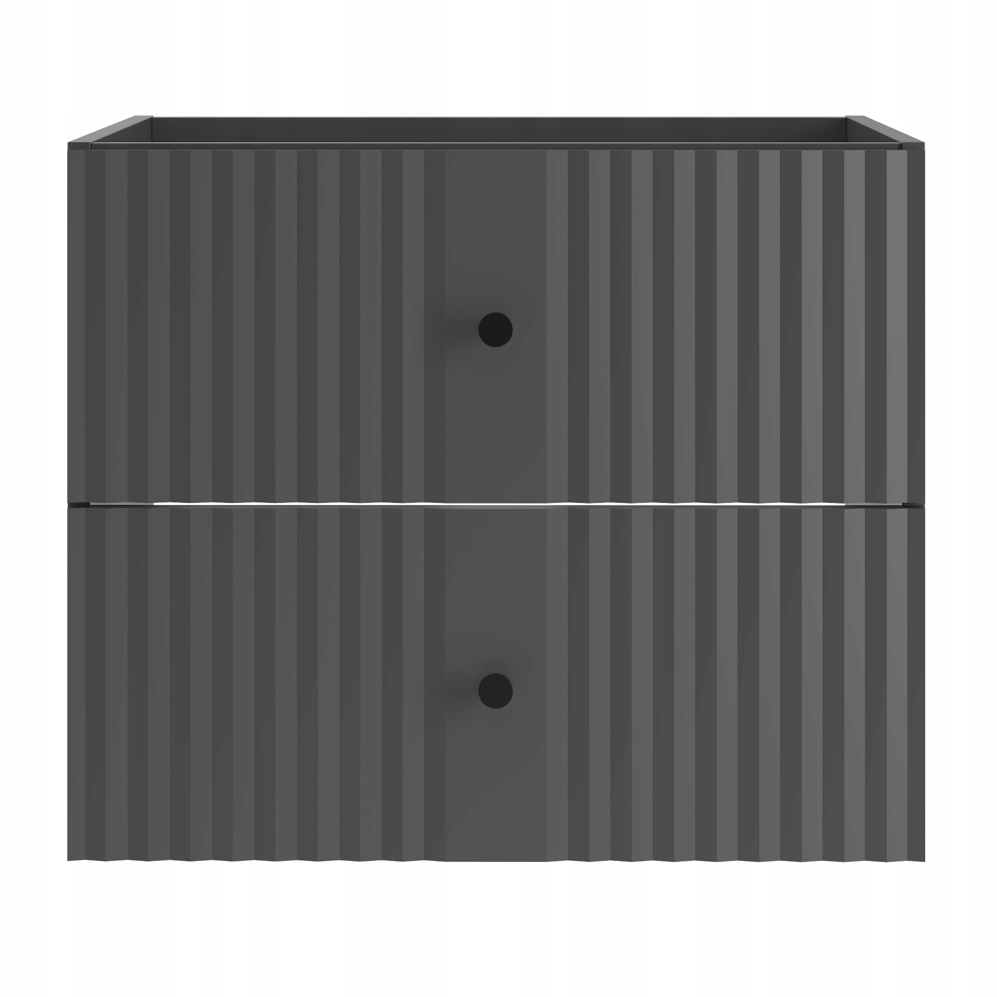 Model o szerokości 60 cm został wyposażony w dwie pojemne szuflady z prowadnicami Häfele o dolnym montażu i systemem cichego domykania, co gwarantuje maksymalny komfort użytkowania. W zestawie znajduje się dopasowany blat w kolorze szarym, który perfekcyjnie dopełnia elegancką formę mebla. Konstrukcja wisząca sprawia, że całość prezentuje się lekko i nowocześnie.