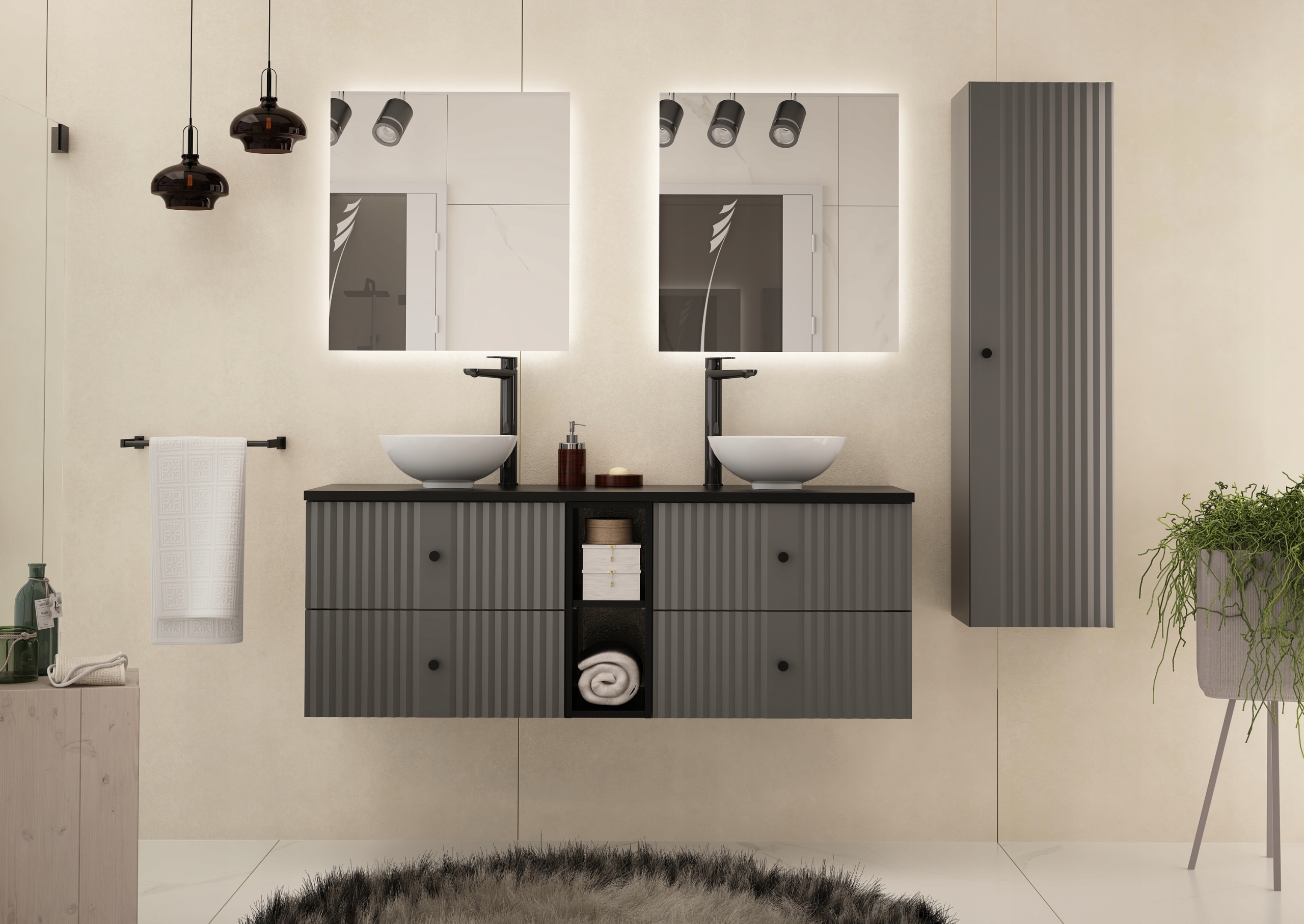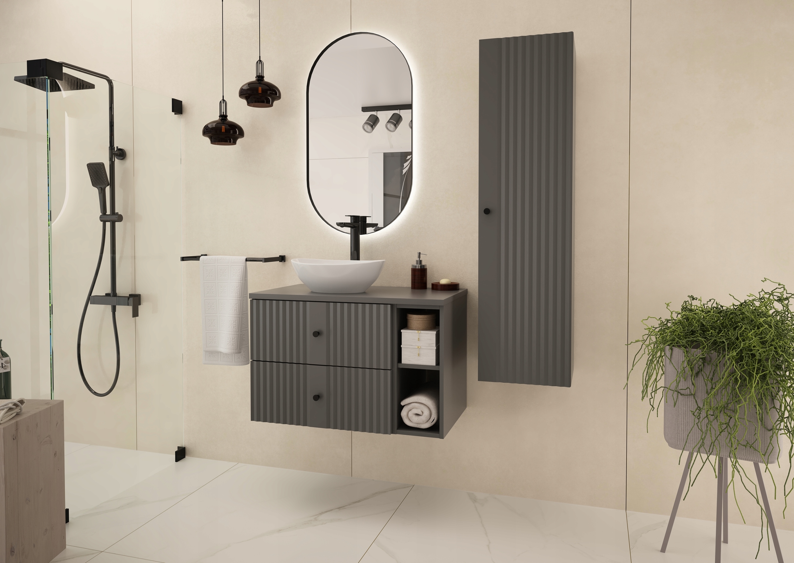 Słupek łazienkowy XILO 130 cm to elegancki i funkcjonalny element nowoczesnej łazienki. Matowe wykończenie w kolorze antracytu w połączeniu z czarnymi metalowymi uchwytami tworzy wyrafinowany, minimalistyczny efekt. Kolekcja XILO została zaprojektowana z myślą o przestrzeniach, w których liczy się prostota formy i trwałość wykonania.