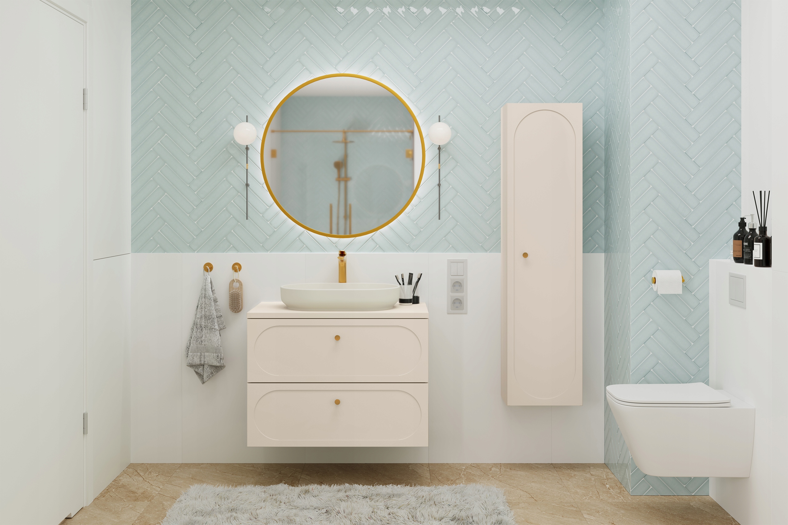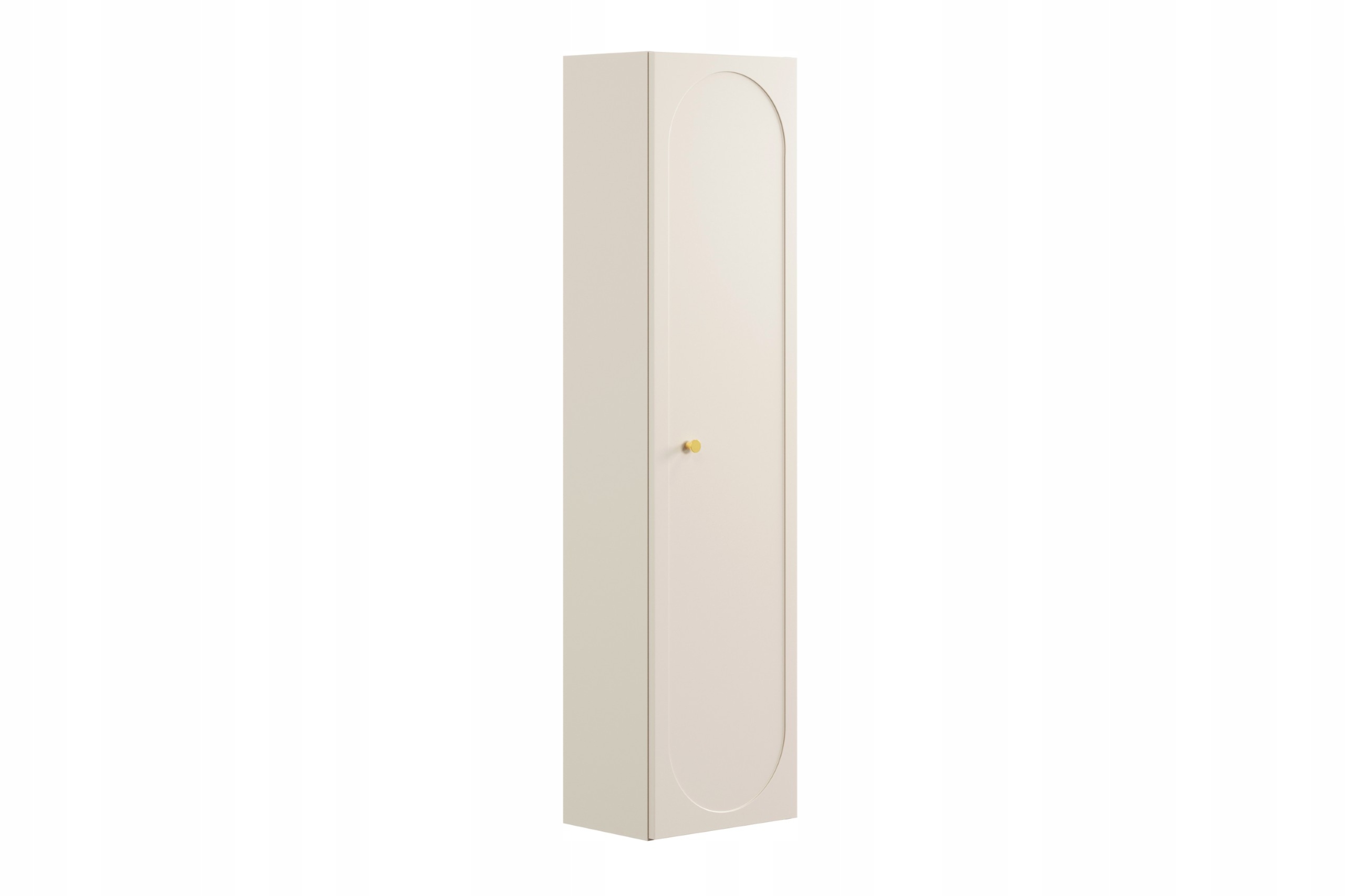 Odcień beżu piaskowego to uniwersalne tło dla różnego rodzaju aranżacji – od klasycznych po nowoczesne. Front z delikatnym frezowaniem nadaje bryle lekkości, a złota, metalowa gałka subtelnie dopełnia elegancką całość.