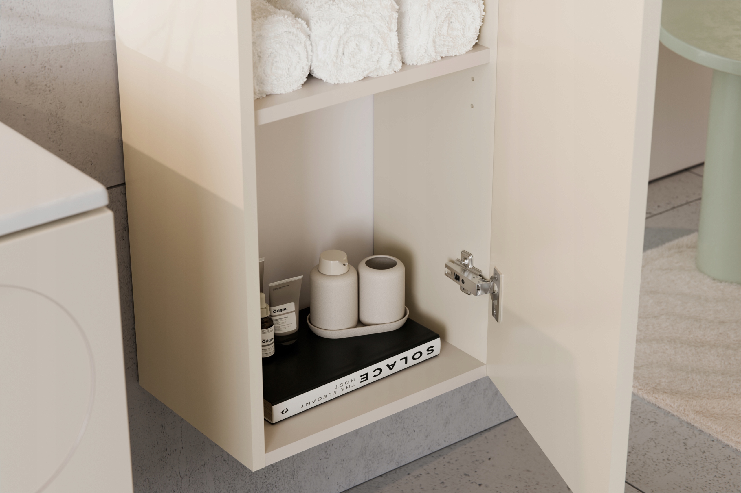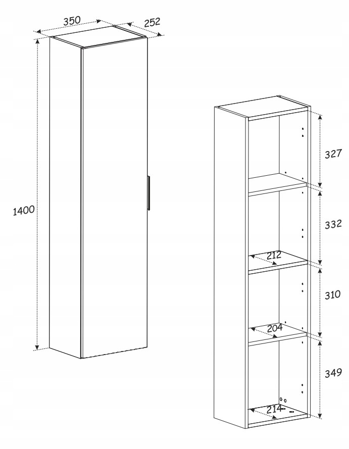 Wnętrze szafki zaprojektowano z myślą o wygodzie użytkowania – drzwi otwierają się miękko dzięki systemowi cichego domykania, a kierunek montażu można dopasować do układu łazienki (prawo lub lewostronnie). Słupek wykonano z trwałych materiałów – płyty laminowanej i MDF – które są odporne na wilgoć, zarysowania i łatwe w pielęgnacji.