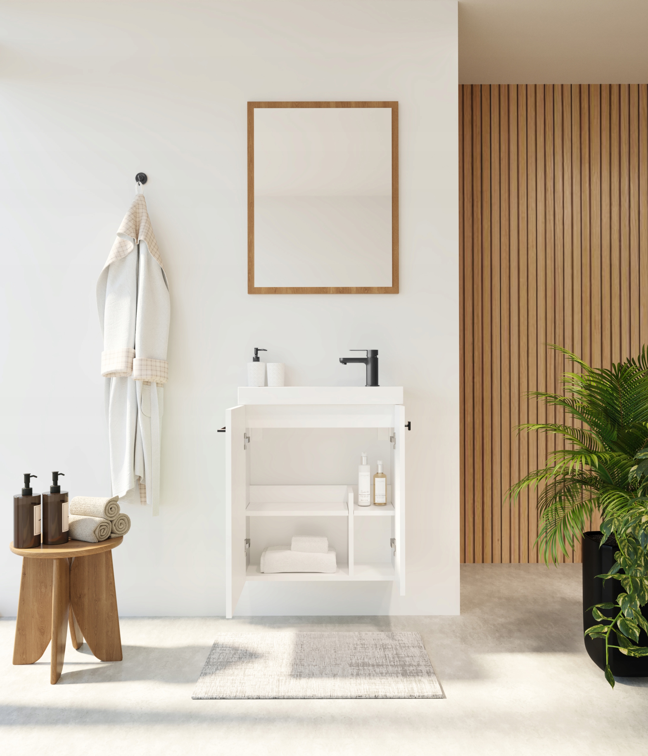 Zestaw NOOK 55 to praktyczne i eleganckie rozwiązanie zaprojektowane z myślą o nowoczesnych, kompaktowych łazienkach. Biała, matowa szafka z lakierowanym, frezowanym frontem prezentuje się świeżo i ponadczasowo, a uchwyt w kolorze gun metal dodaje całości industrialnego, wyrazistego akcentu. Zestaw zawiera ultracienką ceramiczną umywalkę Slim-Line w białym połysku, która doskonale współgra z lekką bryłą mebla. Przemyślany podział szafki na dwie strefy – prywatną i gościnną – pozwala utrzymać porządek i wygodnie przechowywać niezbędne akcesoria. Frezowany front wyposażono w system cichego domyku, a metalowy uchwyt może pełnić również funkcję praktycznego wieszaka na ręcznik. Mebel dostarczany jest w formie fabrycznie zmontowanego zestawu, gotowego do montażu w łazience. Produkt wyprodukowany w Polsce, zestaw nie zawiera baterii.