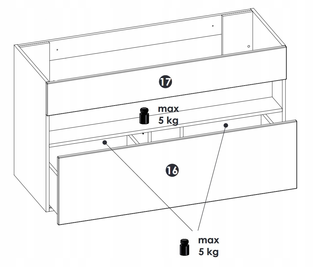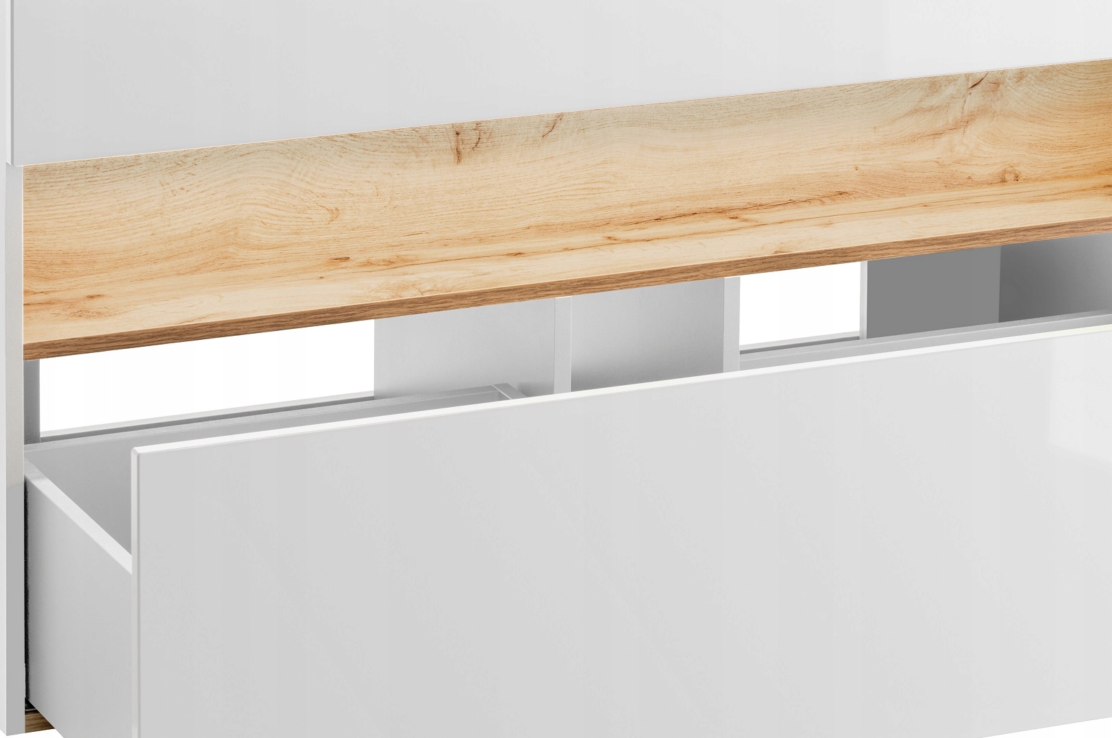Korpus wykonano z płyty laminowanej 16 mm, a fronty z płyty MDF 16 mm w wysokim połysku. Obrzeża wykończone okleiną PVC zwiększają odporność na wilgoć i uszkodzenia. Mebel łączy trwałość, estetykę i wygodę w jednym projekcie.