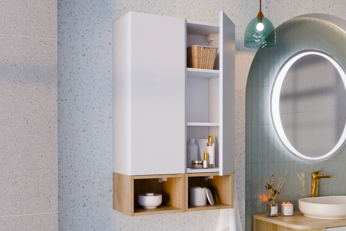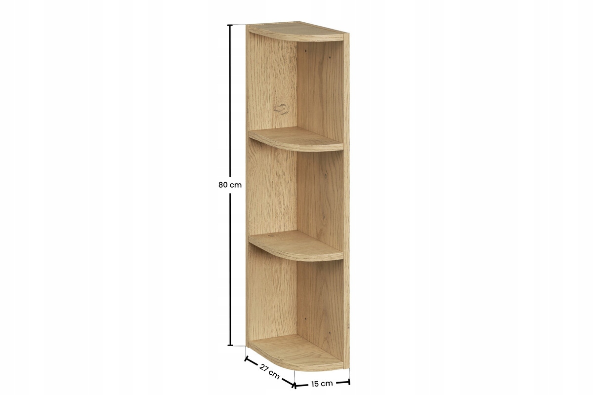 Zestaw o szerokości 45 cm składa się z półsłupka jednodrzwiowego oraz wąskiego regału z otwartymi półkami. Półsłupek wyposażony jest w system otwierania push to open oraz zawiasy z cichym domykiem, które zapewniają wygodne użytkowanie na co dzień. Wewnątrz znajdują się trzy wnęki umożliwiające przechowywanie kosmetyków oraz akcesoriów łazienkowych. Regał o szerokości 15 cm z trzema otwartymi półkami stanowi funkcjonalne uzupełnienie zabudowy i sprawdza się jako miejsce na podręczne przedmioty.