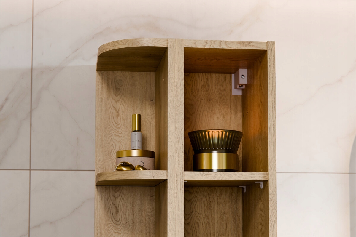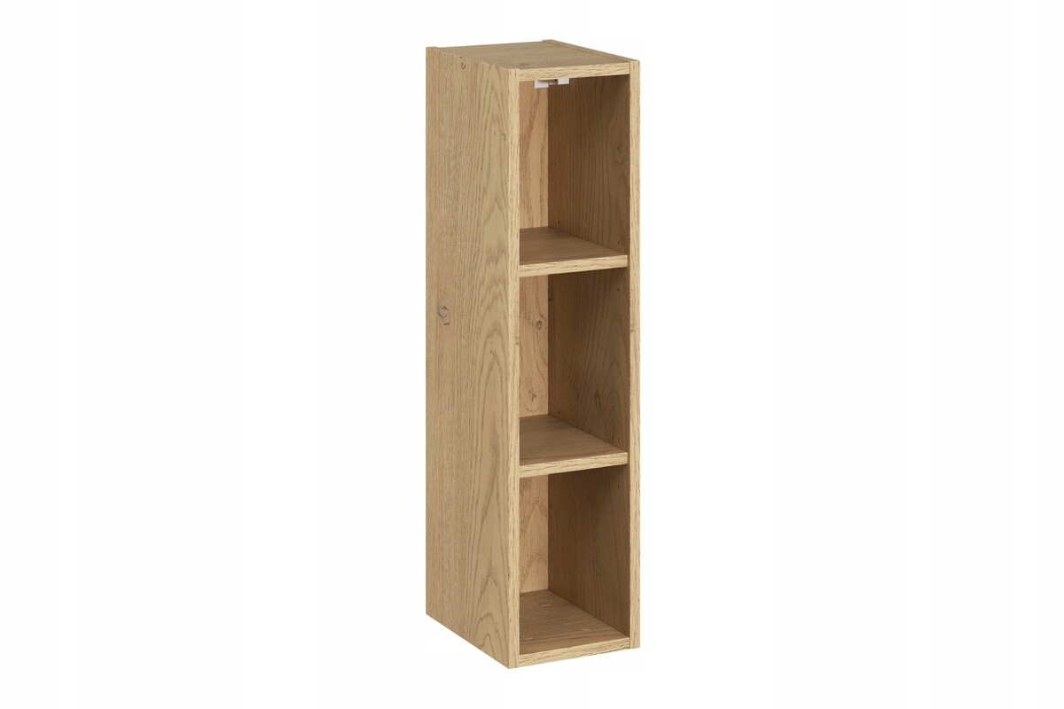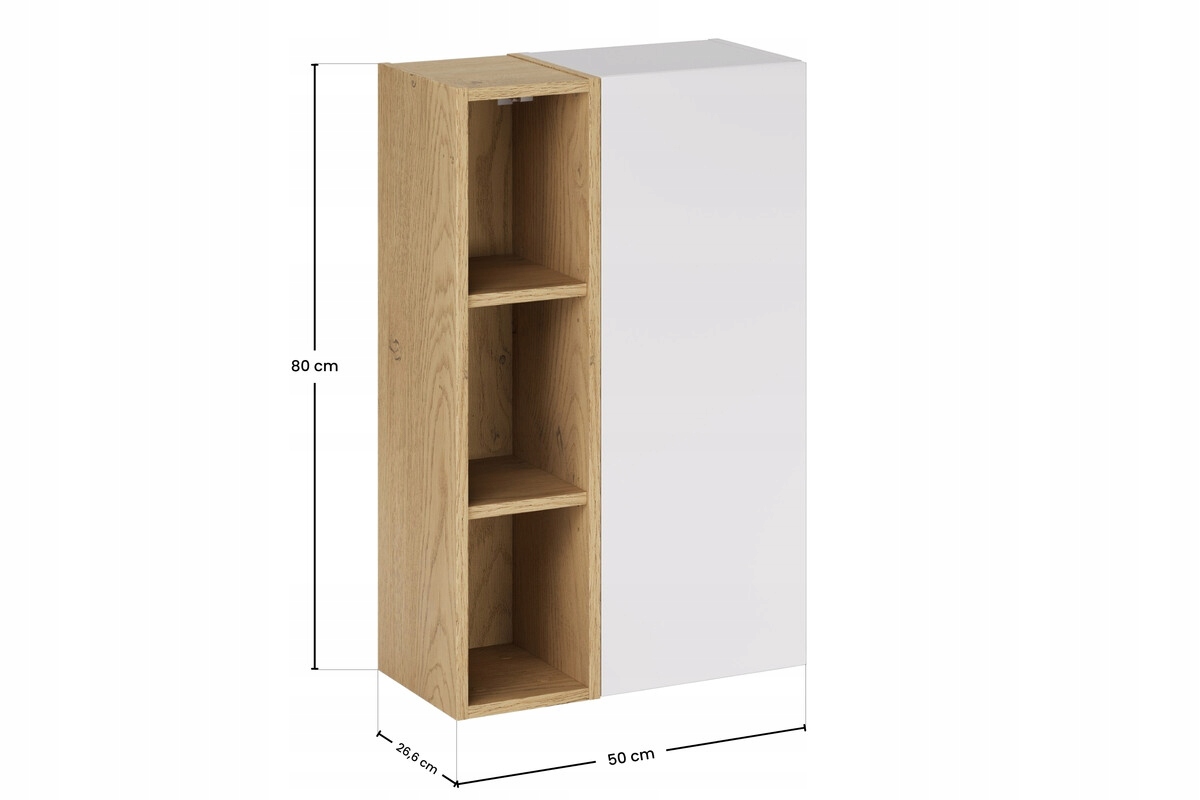 Zestaw o łącznej szerokości 50 cm składa się z półsłupka o szerokości 30 cm oraz regału górnego o szerokości 20 cm. Półsłupek wyposażony jest w system otwierania push to open oraz zawiasy z cichym domykiem, które zapewniają wygodne i bezuchwytowe użytkowanie. Wewnątrz znajdują się trzy wnęki do przechowywania. Regał z trzema otwartymi wnękami stanowi praktyczne uzupełnienie zabudowy i umożliwia wygodne przechowywanie podręcznych akcesoriów.