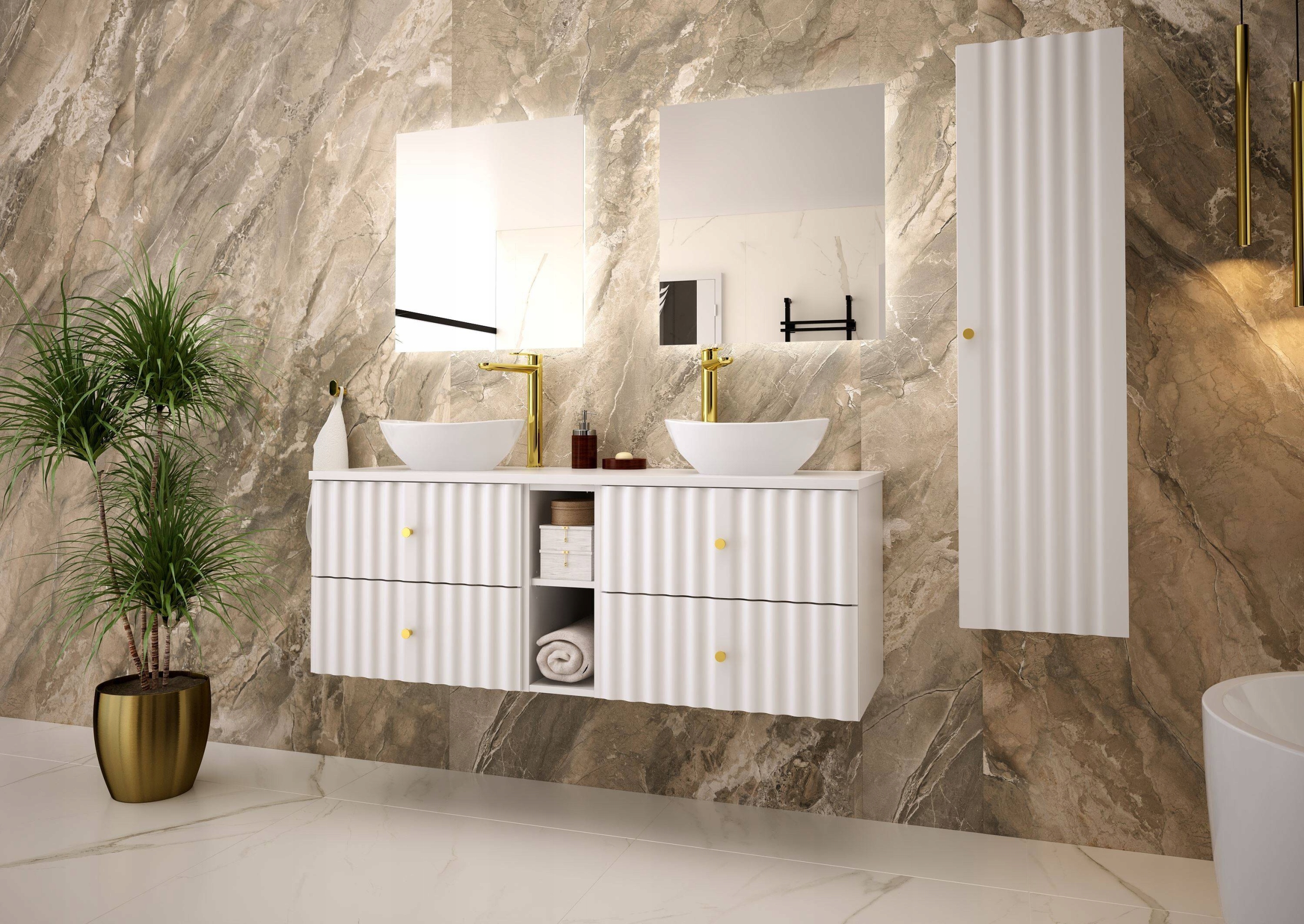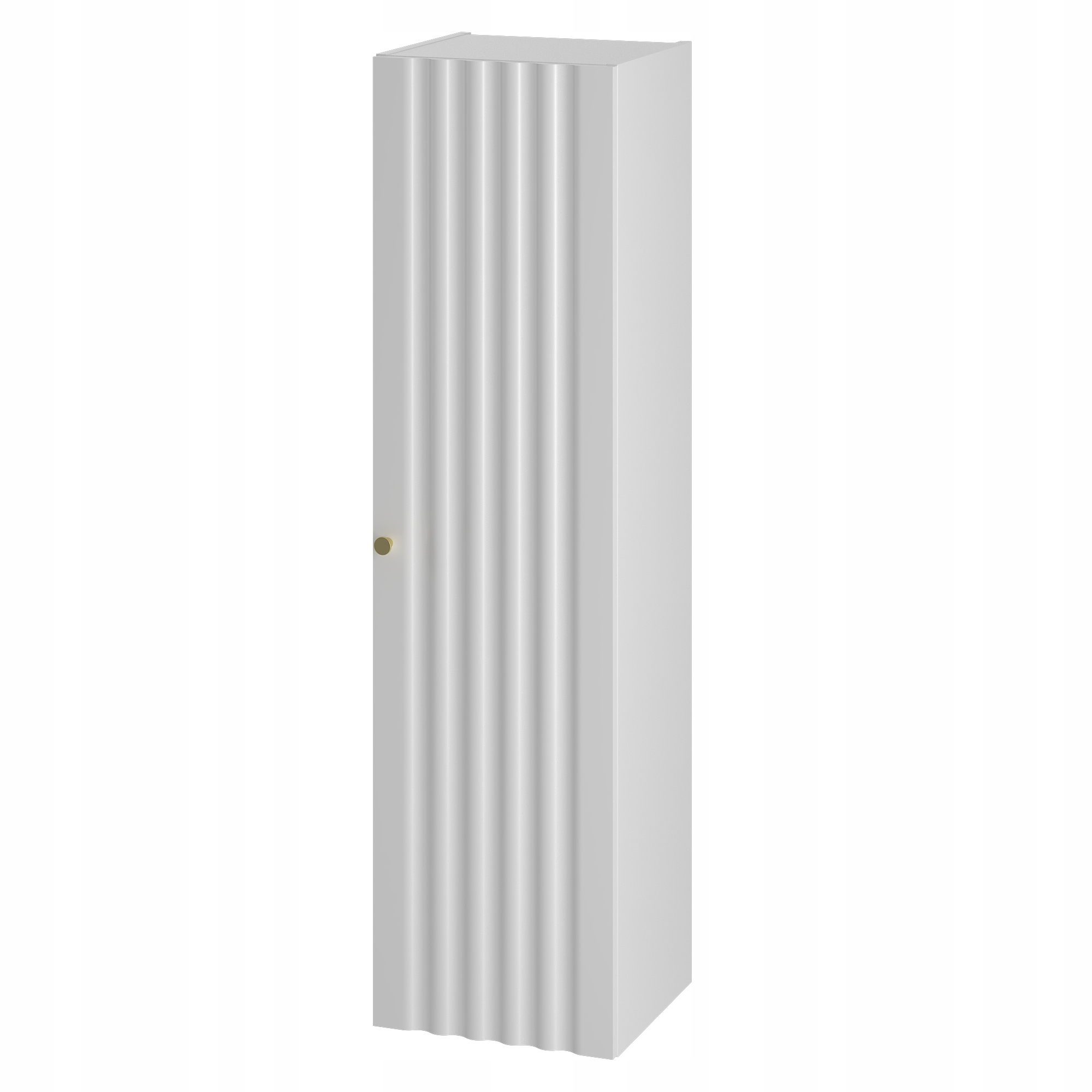 Słupek łazienkowy z kolekcji Aqua o wysokości 130 cm i szerokości 35 cm w kolorze biały mat to eleganckie i praktyczne rozwiązanie do nowoczesnych łazienek. Ryflowany front MDF w subtelnym, matowym wykończeniu nadaje meblowi wyjątkowego charakteru, a złote aluminiowe uchwyty gałkowe podkreślają jego elegancki styl. Wisząca forma sprawia, że słupek prezentuje się lekko i nowocześnie, a dodatkowo ułatwia sprzątanie pod meblem.