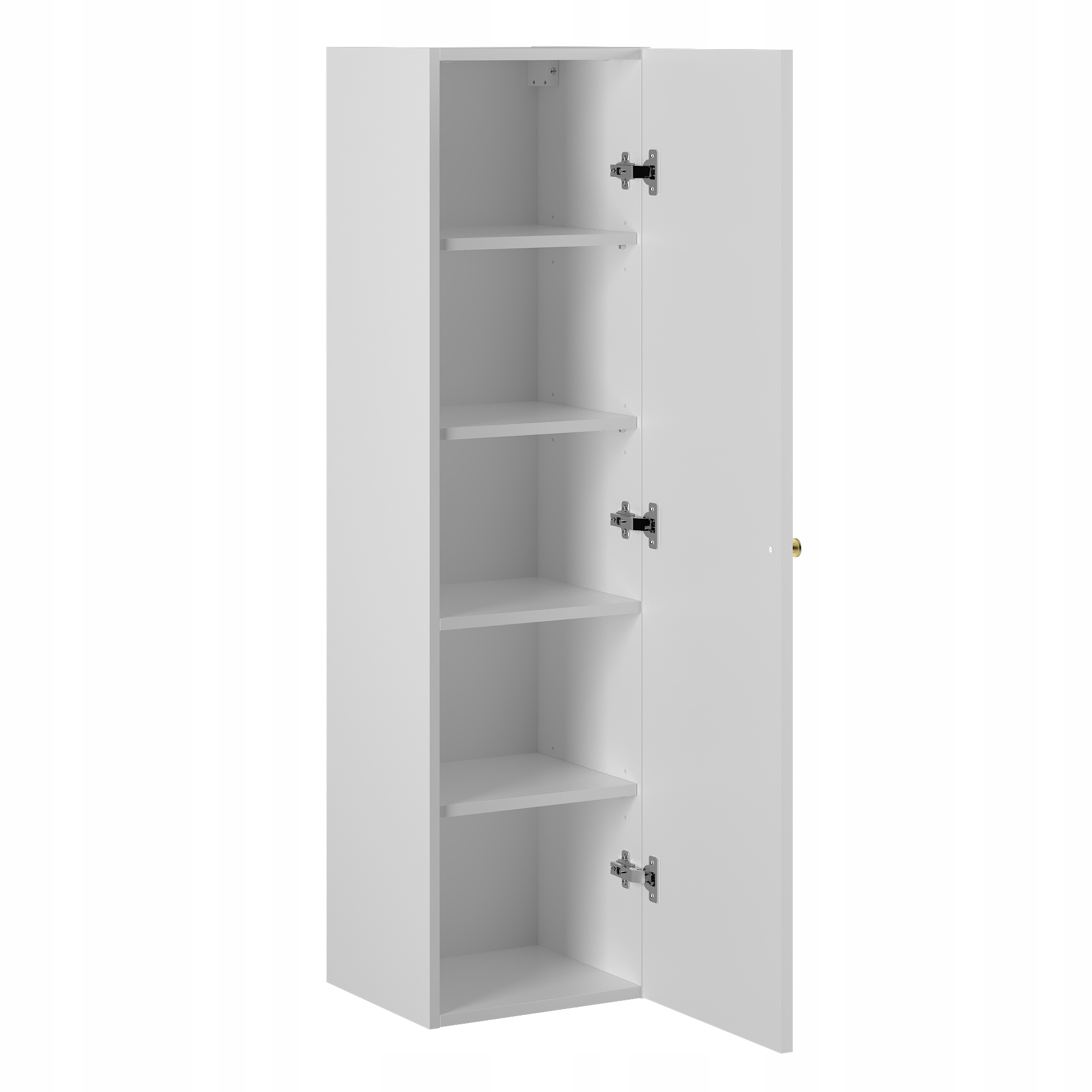 Słupek ma wysokość 130 cm, głębokość 31,8 cm i szerokość 34,5 cm. Korpus wykonano z płyty laminowanej 16 mm, front z płyty MDF wykończonej folią meblową, a półki z płyty laminowanej. Tył to płyta HDF 3 mm. Stylowe złote uchwyty dodają całości elegancji. To polska produkcja z certyfikowanych materiałów FSC, dostarczana w paczkach do samodzielnego montażu wraz z kompletną instrukcją i zestawem montażowym.