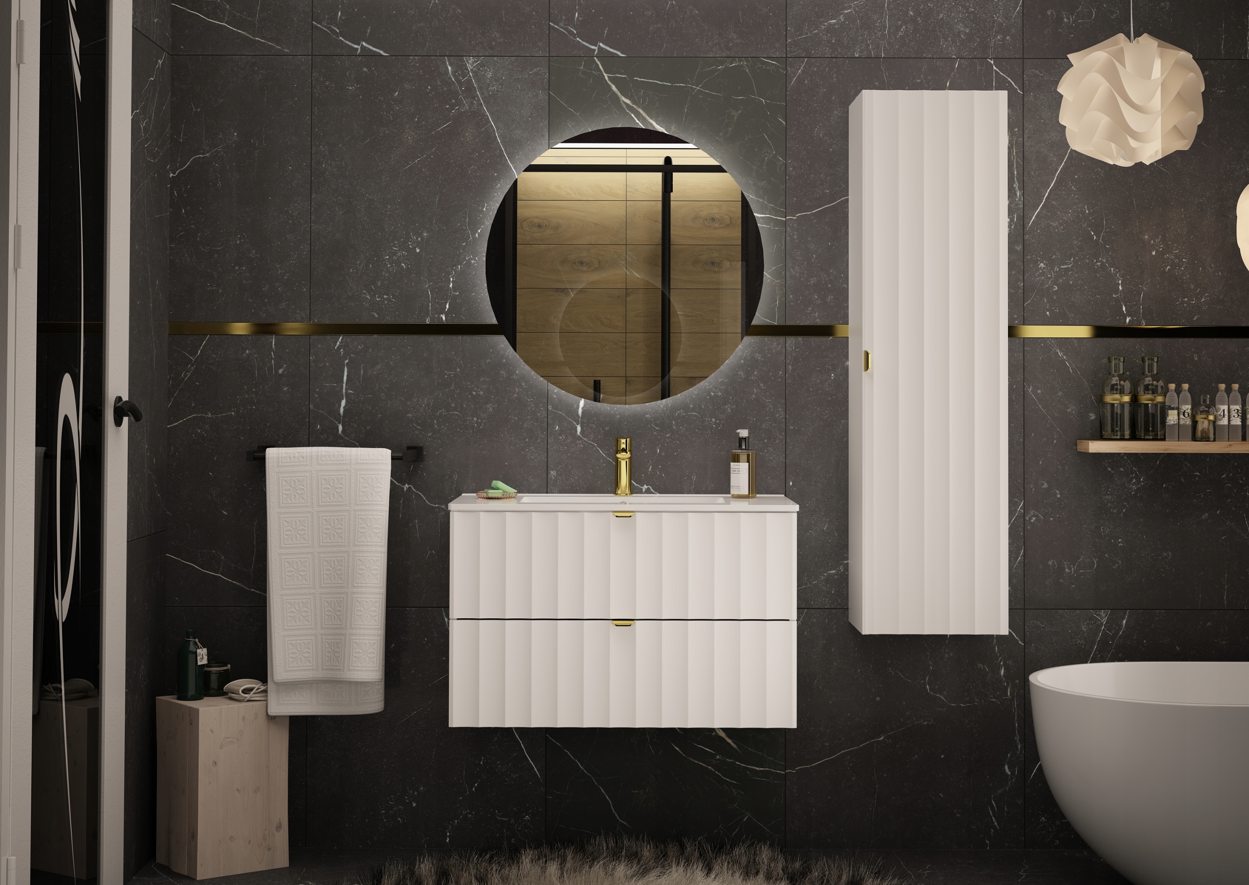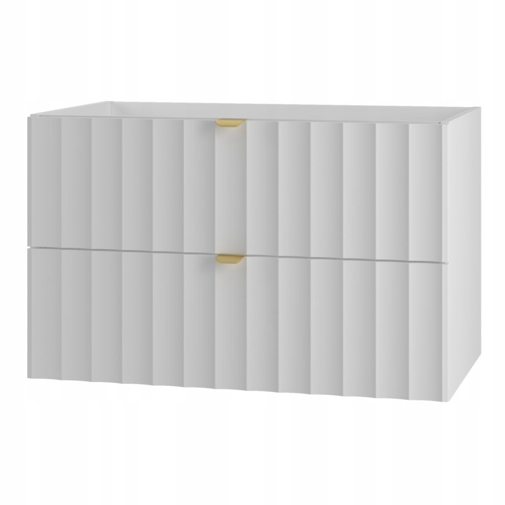 Słupek łazienkowy ARCOS o szerokości 34,5 cm, wysokości 130 cm i głębokości 31,8 cm to elegancka propozycja, która łączy nowoczesny minimalizm z funkcjonalnością. Ryflowane fronty w białym macie nadają całości subtelnego, a zarazem wyrazistego charakteru, a złote uchwyty krawędziowe wprowadzają nutę luksusu i elegancji.