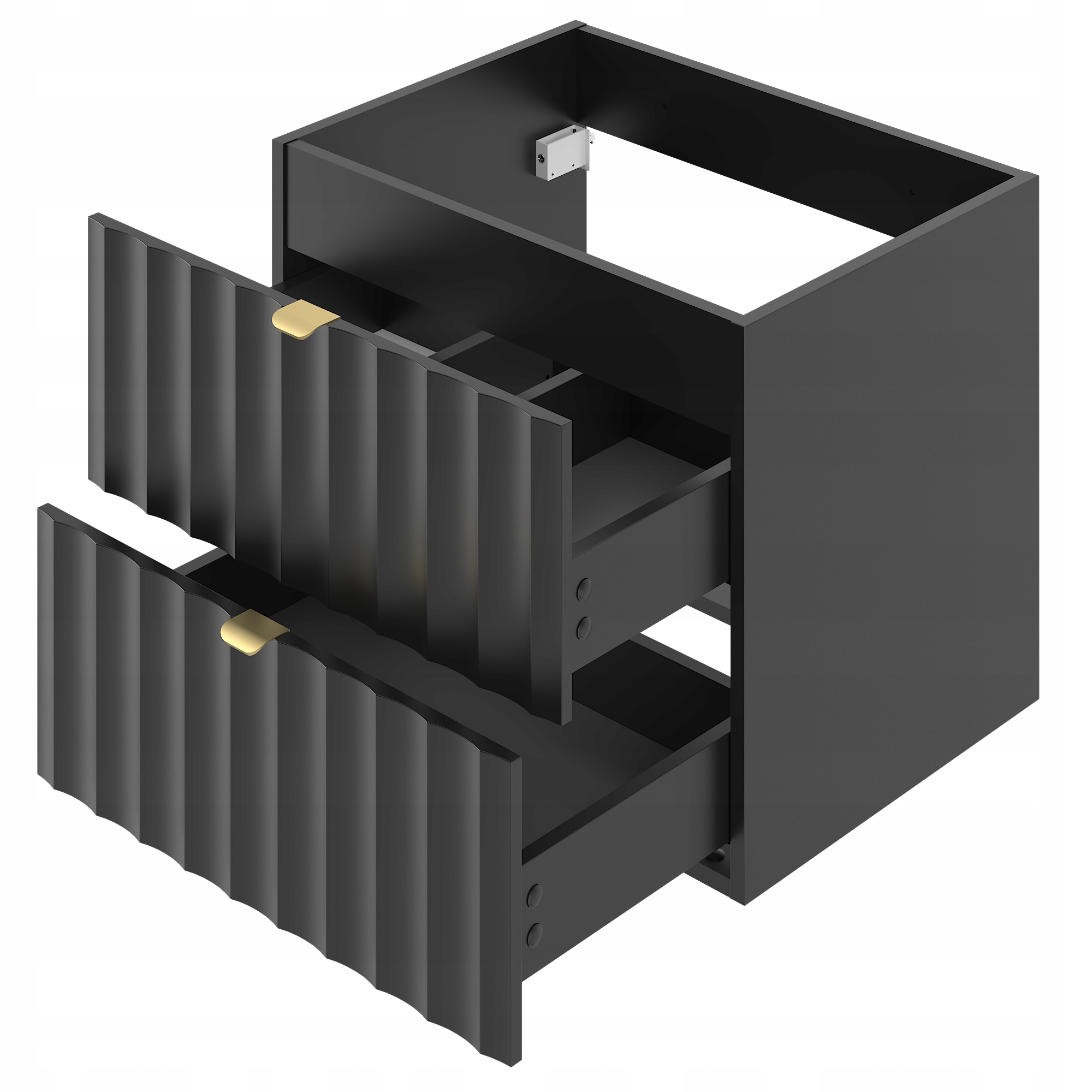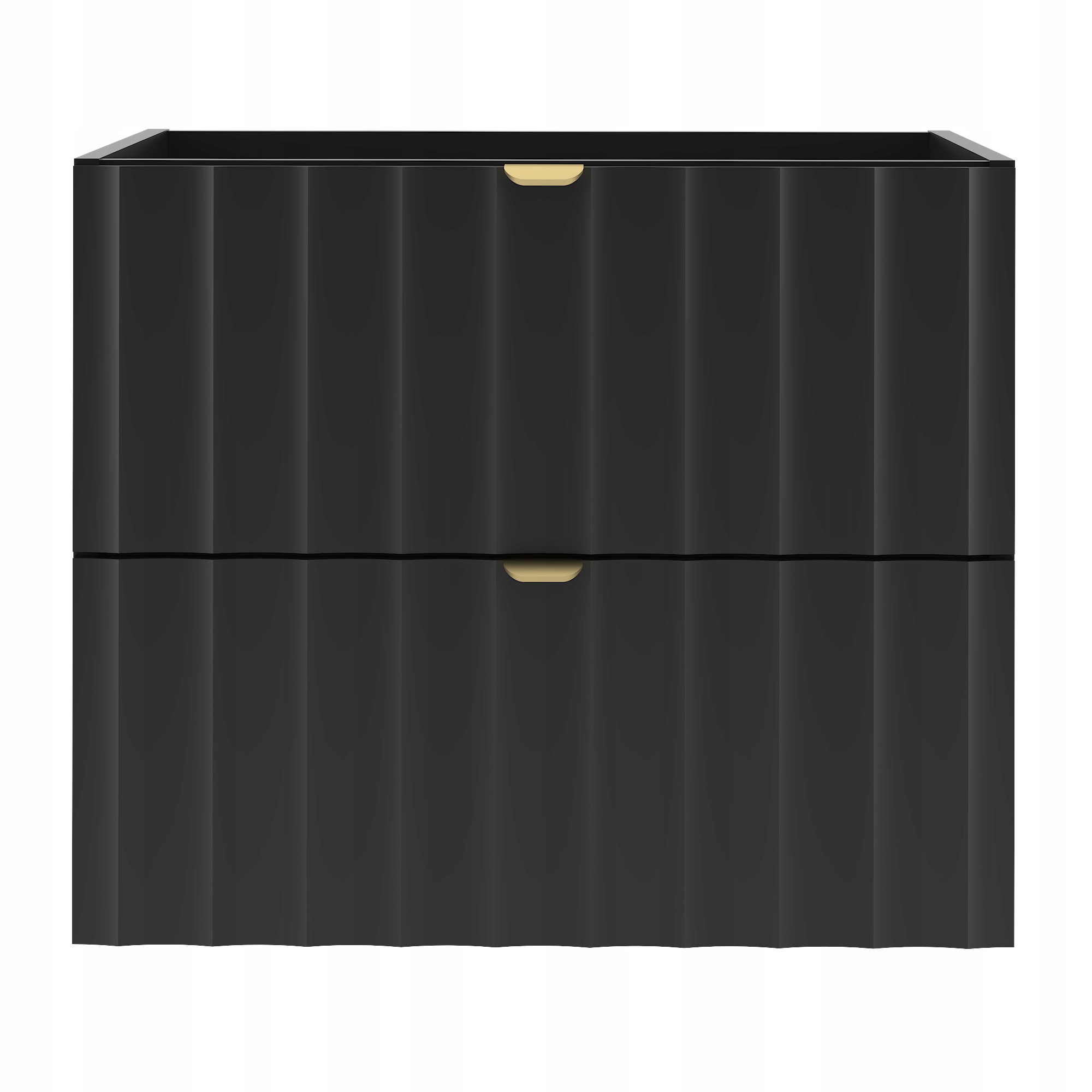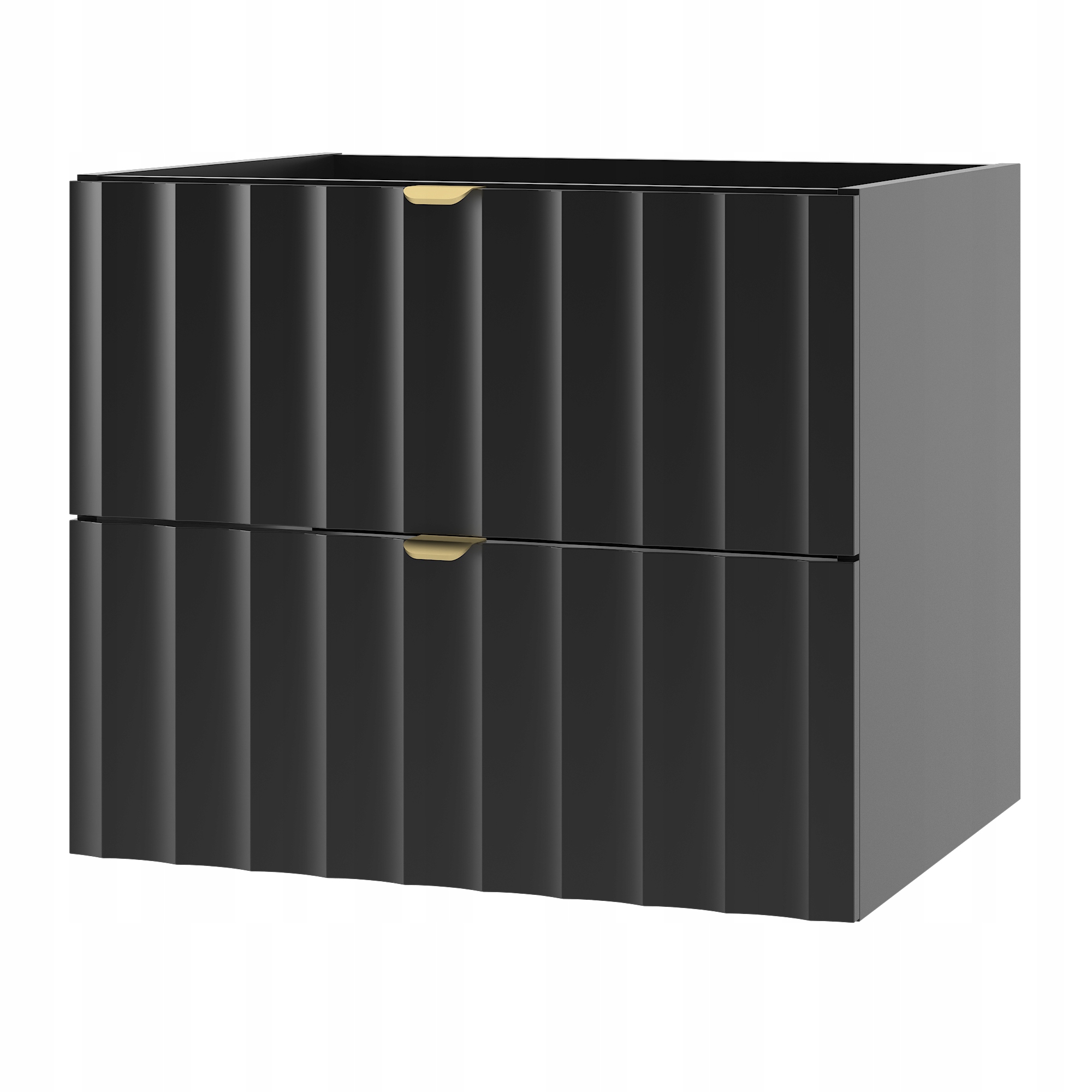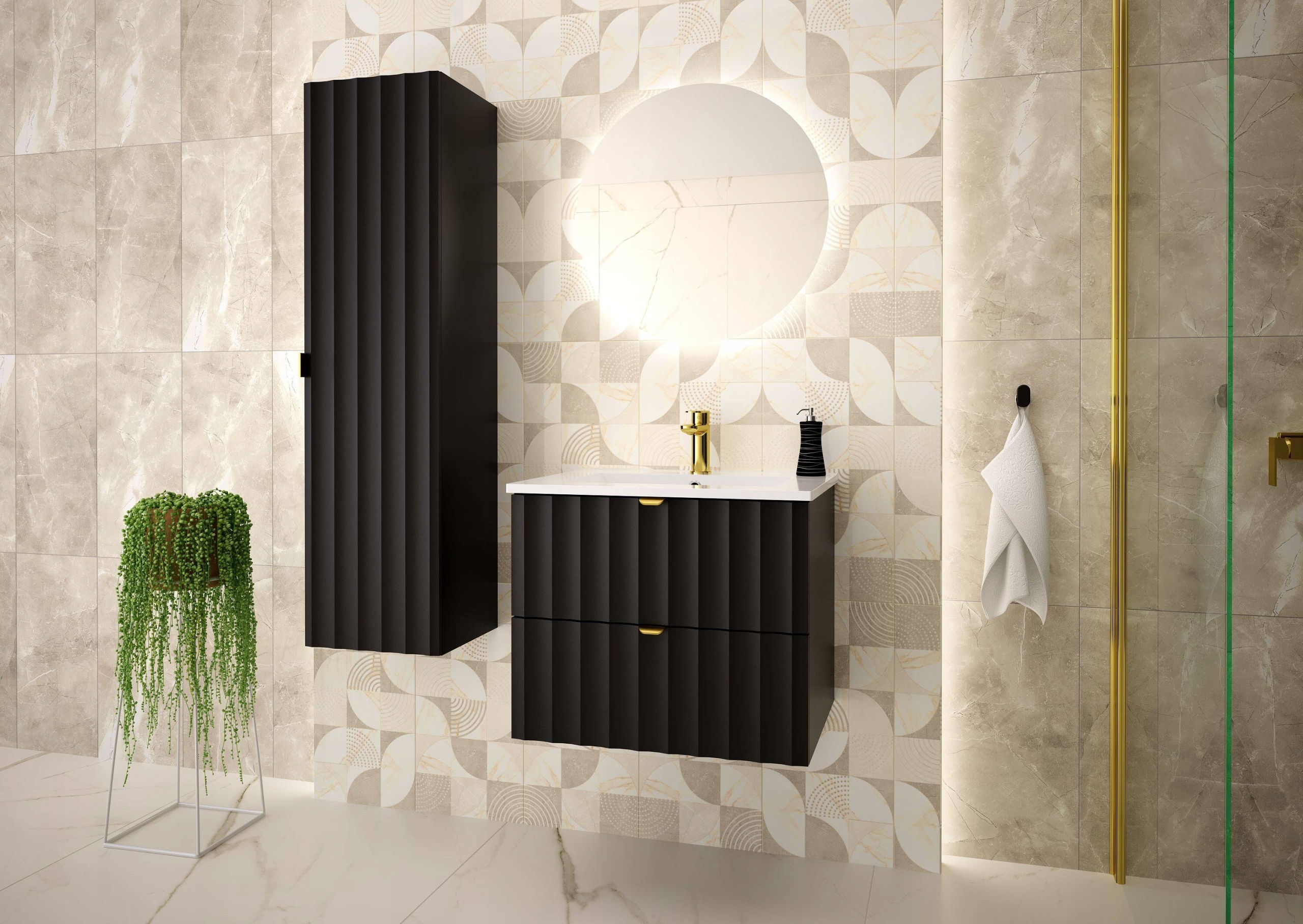 Szafka łazienkowa ARCOS o szerokości 60 cm, wysokości 50 cm i głębokości 45,8 cm to elegancka propozycja, która łączy minimalistyczną formę z nowoczesnym designem. Czarne matowe fronty z pionowym ryflowaniem nadają wnętrzu wyjątkowej głębi i stylu, a złote uchwyty krawędziowe podkreślają luksusowy charakter kolekcji.