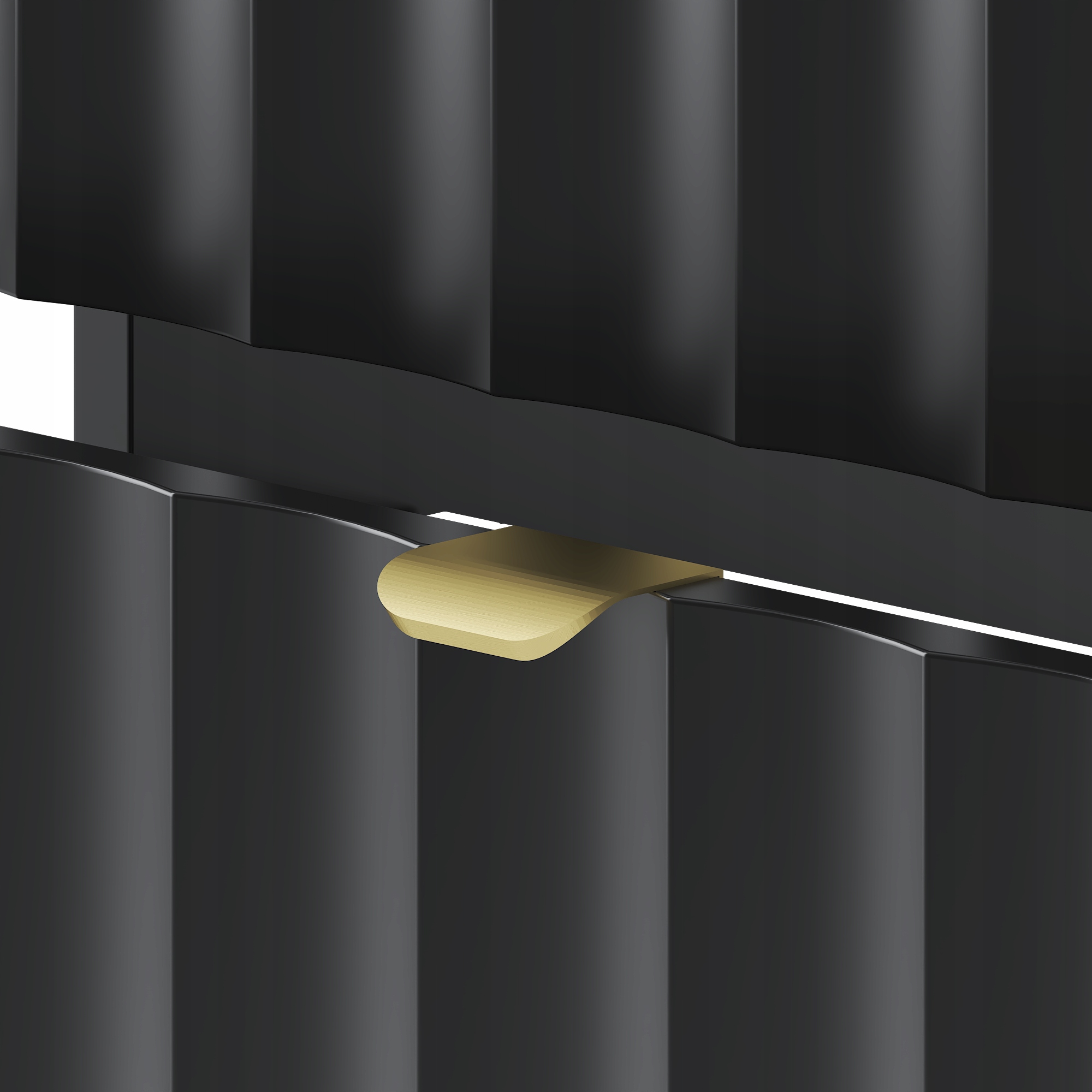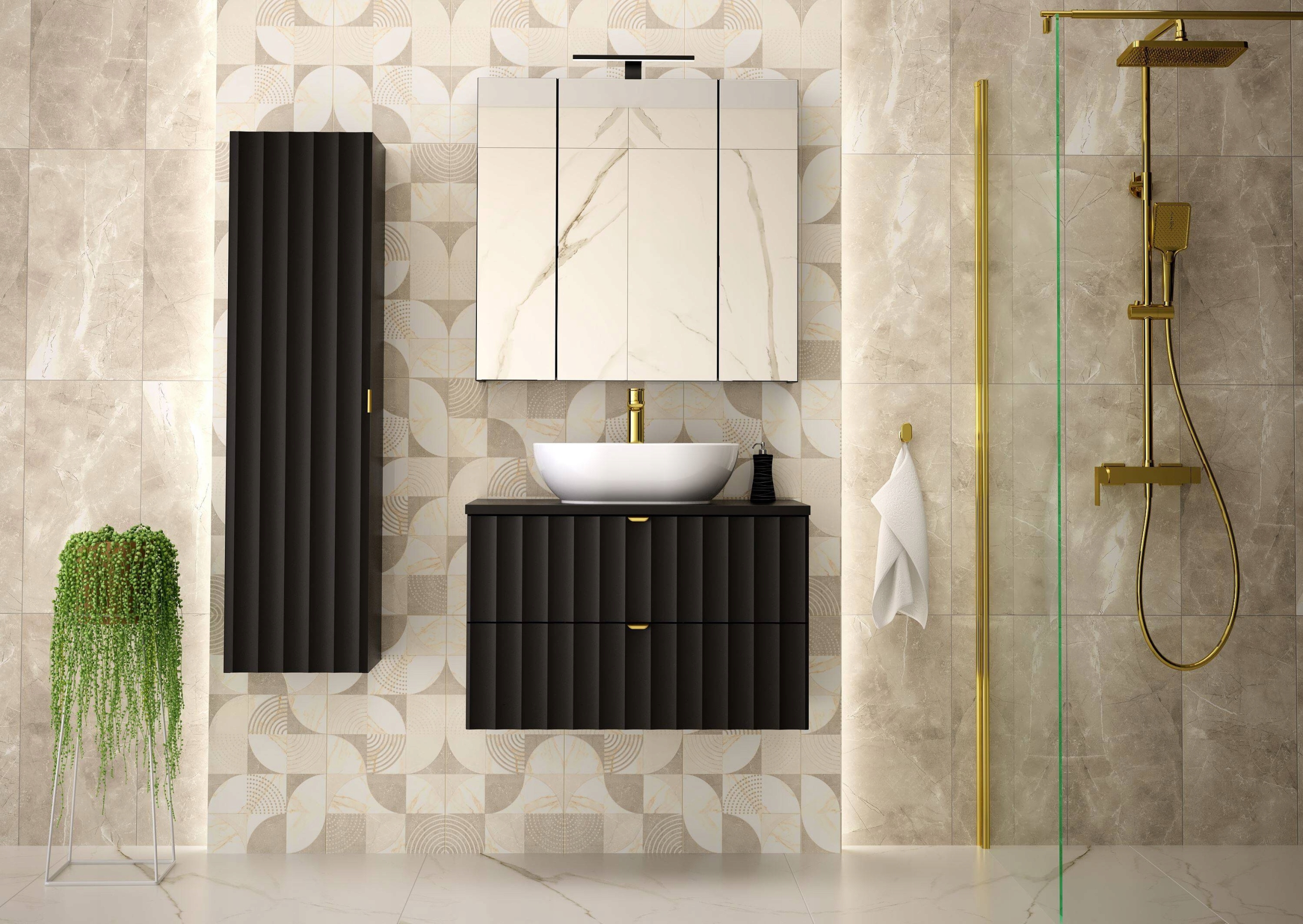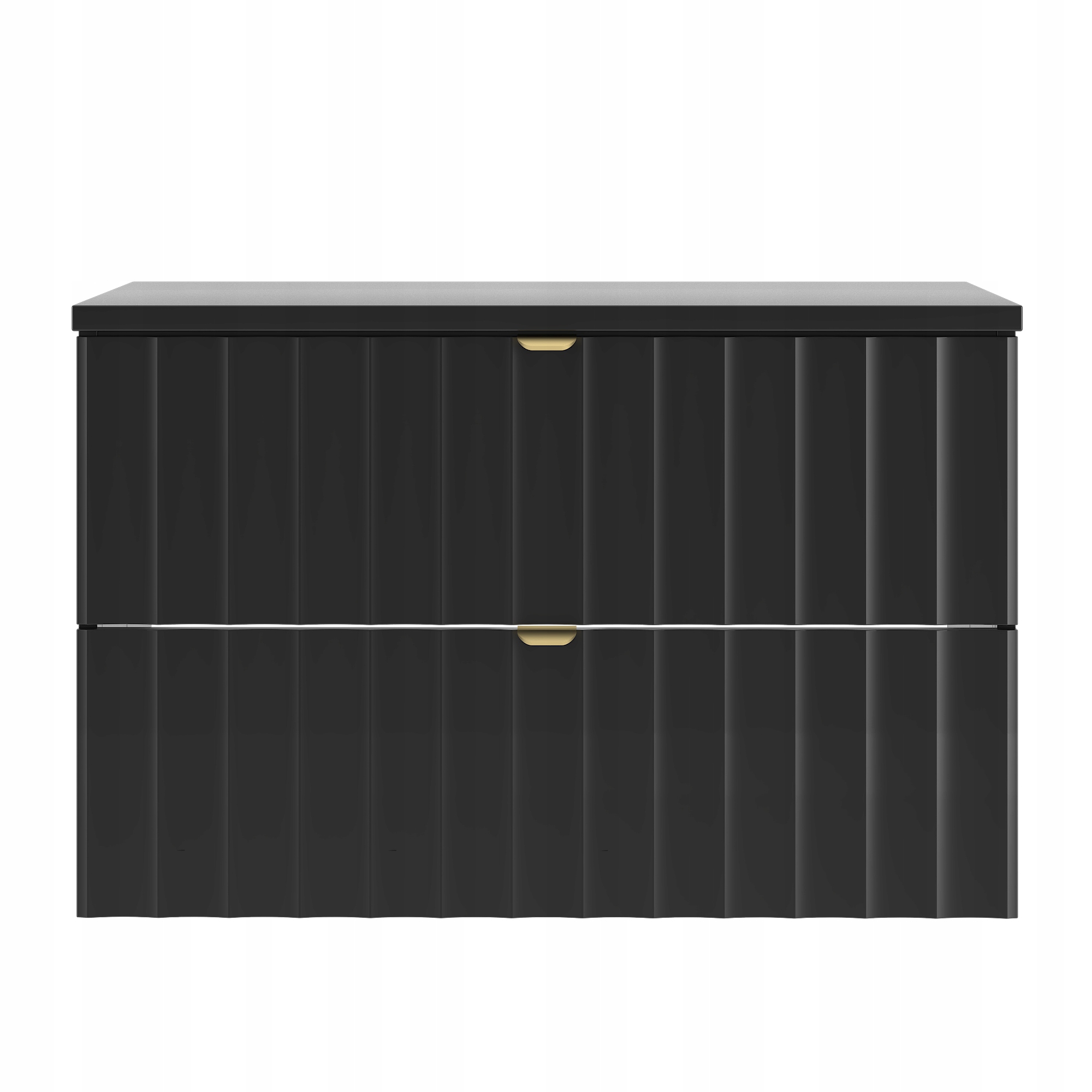 Szafka łazienkowa ARCOS o szerokości 80 cm, wysokości 50 cm i głębokości 45,8 cm z dopasowanym blatem MDF o grubości 2,2 cm to propozycja, która łączy nowoczesny minimalizm z eleganckim stylem. Czarne matowe fronty z pionowym ryflowaniem nadają całości wyrazistego charakteru, a złote uchwyty krawędziowe wprowadzają nutę luksusu i podkreślają ponadczasowy wygląd kolekcji.