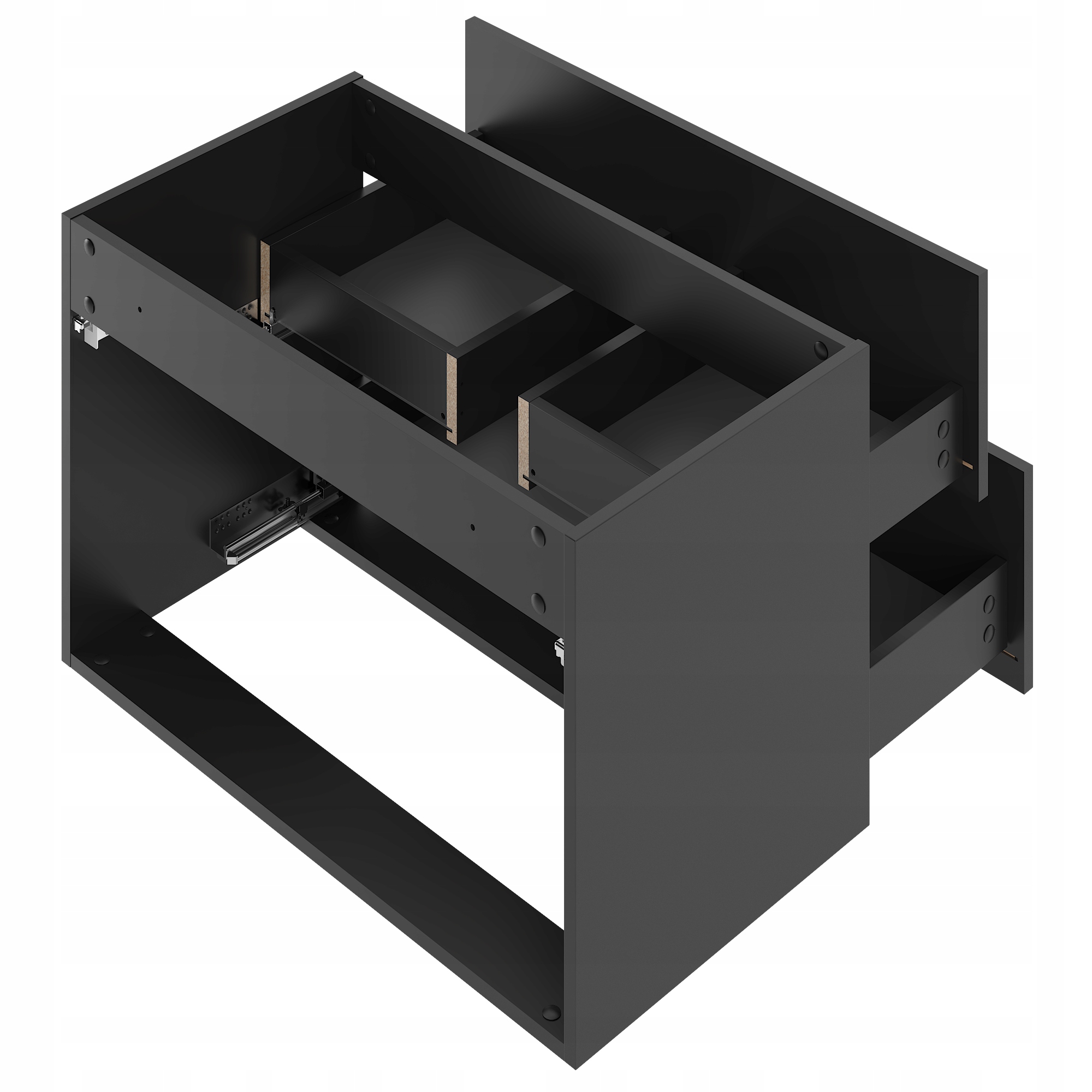 – Blat MDF czarny mat o wymiarach: szerokość 80,6 cm, wysokość 2,2 cm, głębokość 46,5 cm