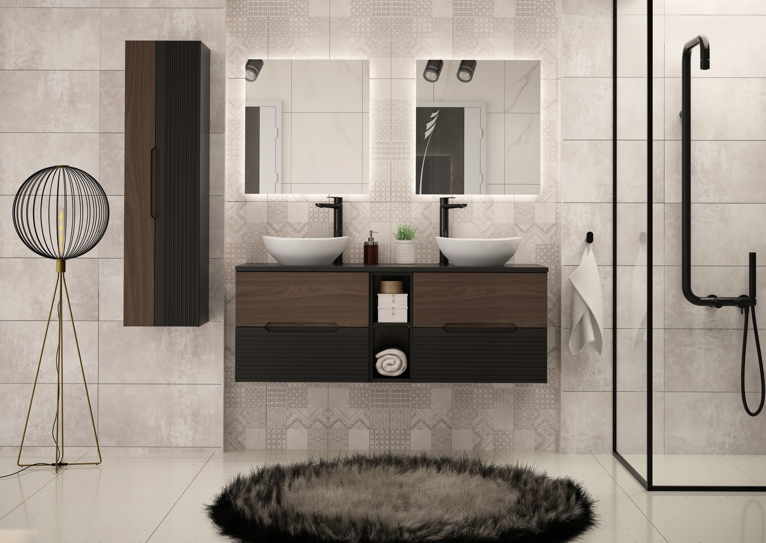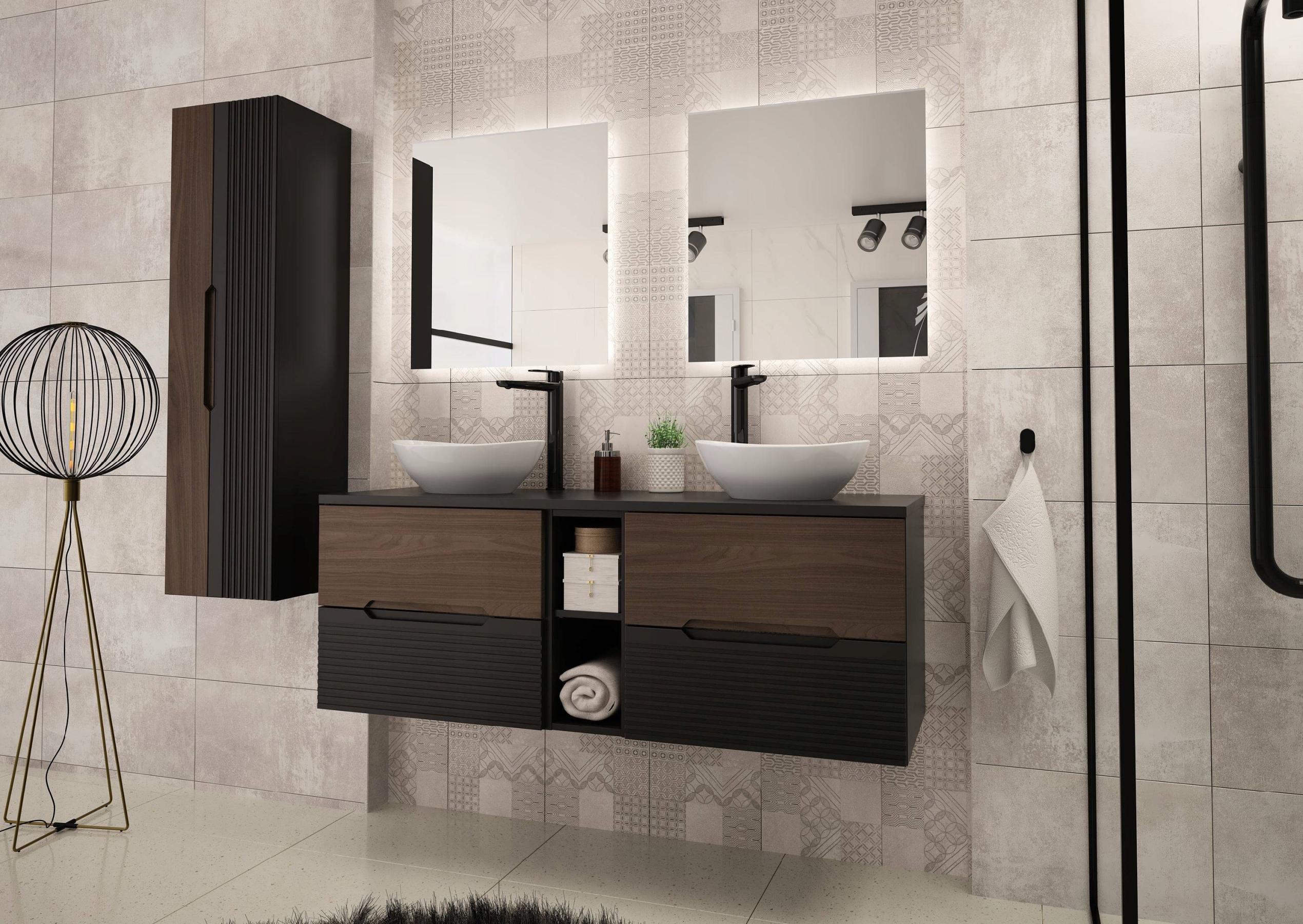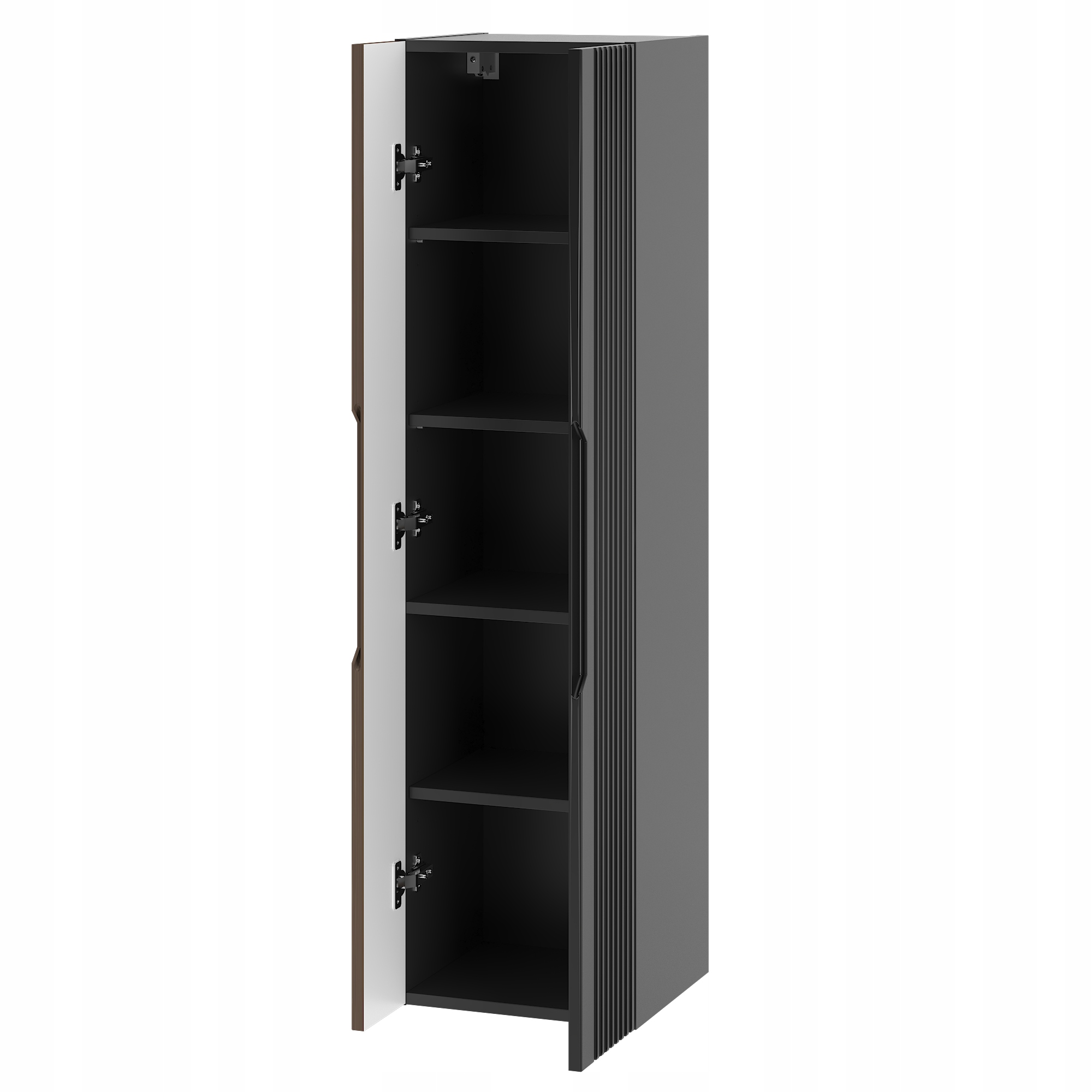 Słupek łazienkowy z kolekcji Avella o wysokości 130 cm i szerokości 35 cm to nowoczesny mebel łączący czarny mat z eleganckim dekorem orzech. Charakterystyczne frezowane fronty MDF nadają mu wyjątkowego charakteru, a minimalistyczna forma podkreśla nowoczesny styl kolekcji. Konstrukcja wisząca sprawia, że mebel prezentuje się lekko i estetycznie, jednocześnie ułatwiając utrzymanie czystości w łazience.