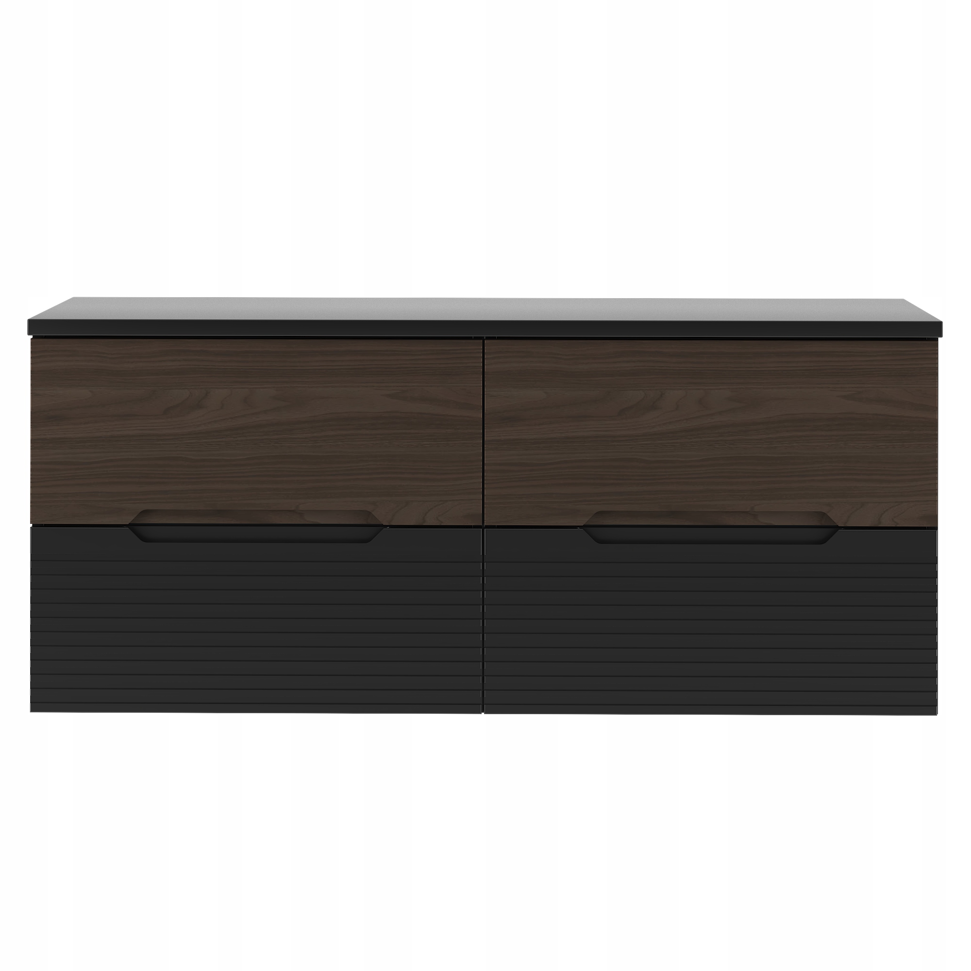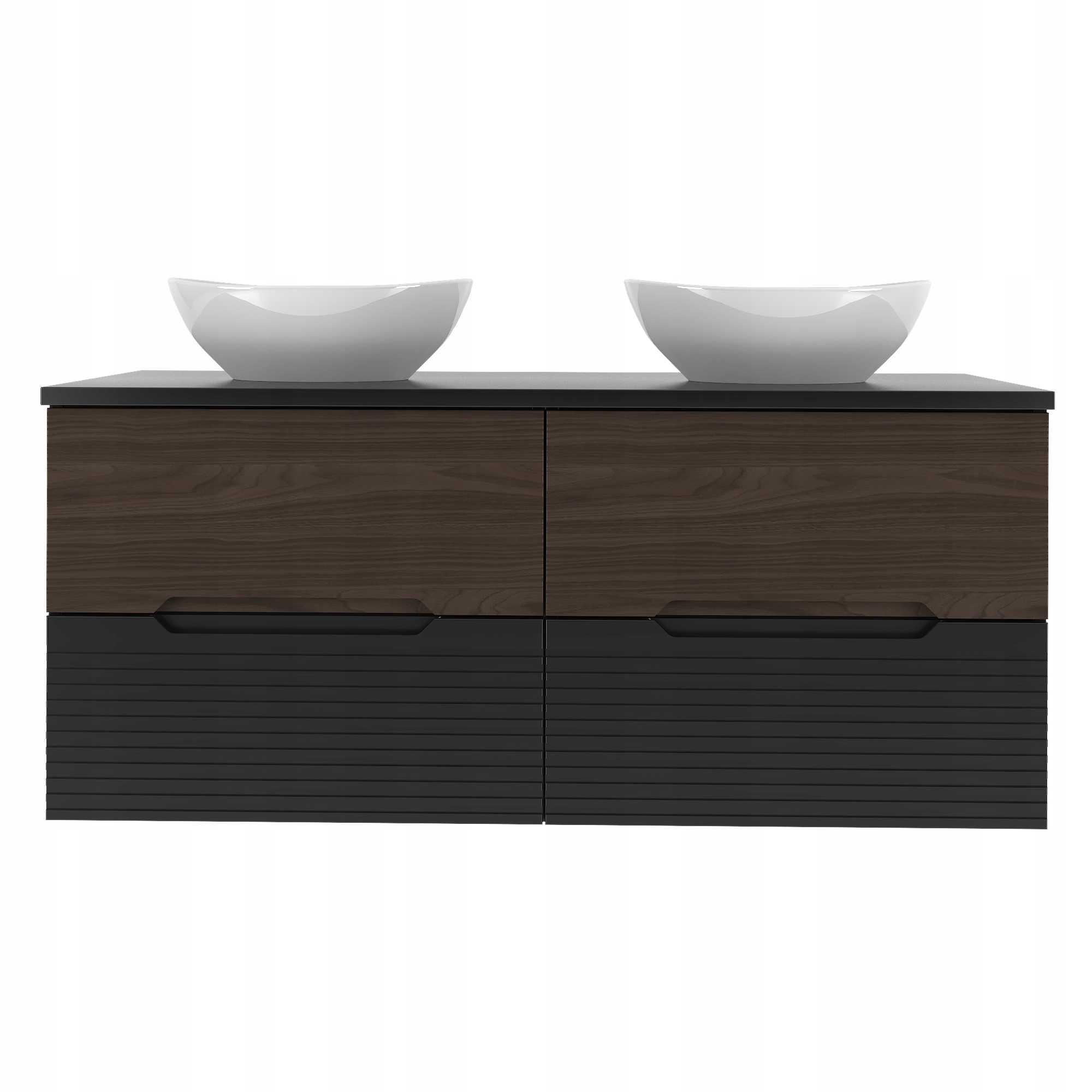 Szafka łazienkowa Avella o szerokości 120 cm to eleganckie rozwiązanie stworzone z dwóch połączonych modułów o szerokości 60 cm, przykrytych jednym dopasowanym blatem. Nowoczesne zestawienie czarnego matu i dekoru orzech nadaje meblowi wyjątkowego charakteru, a frezowane fronty MDF podkreślają unikalny design kolekcji.