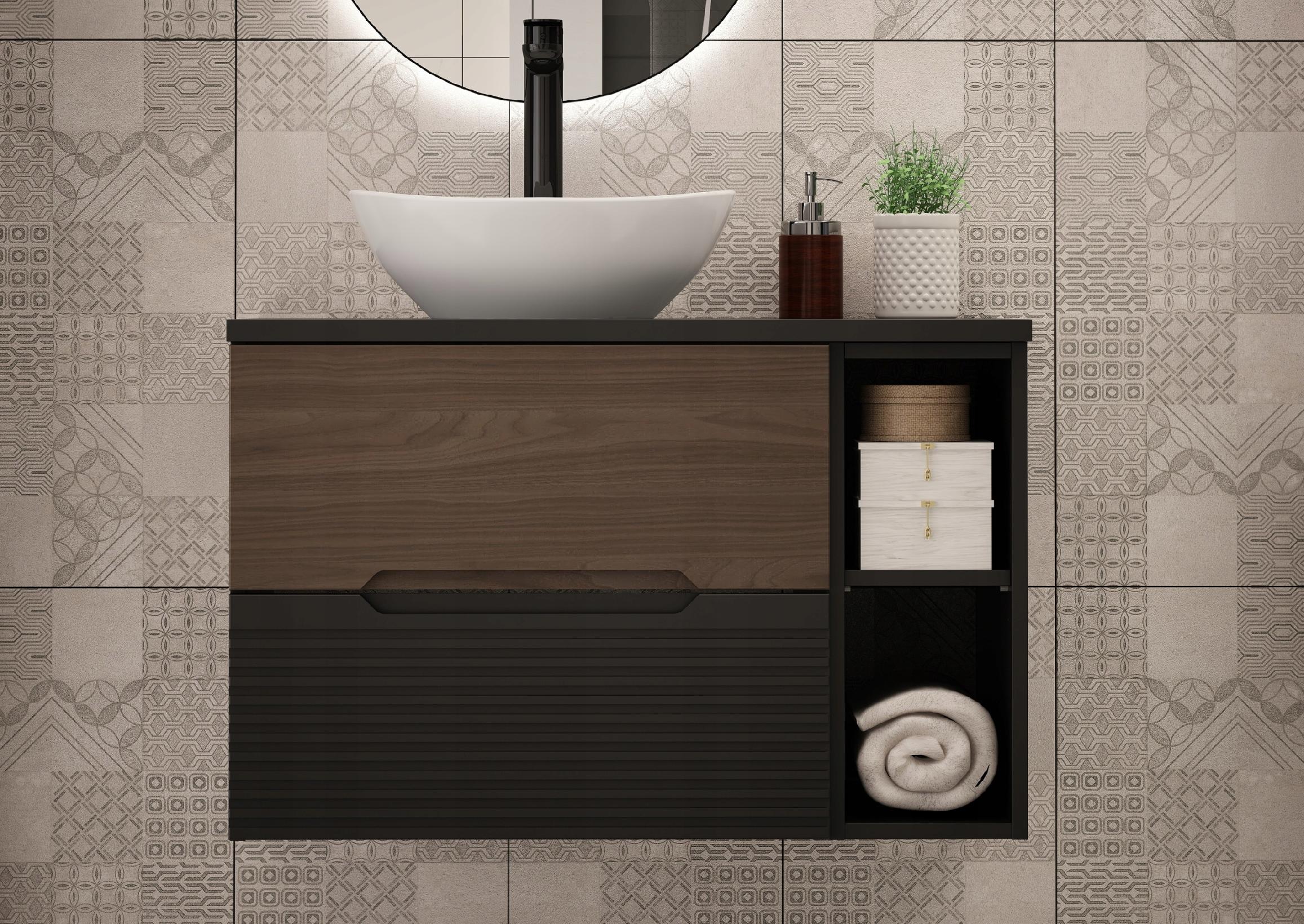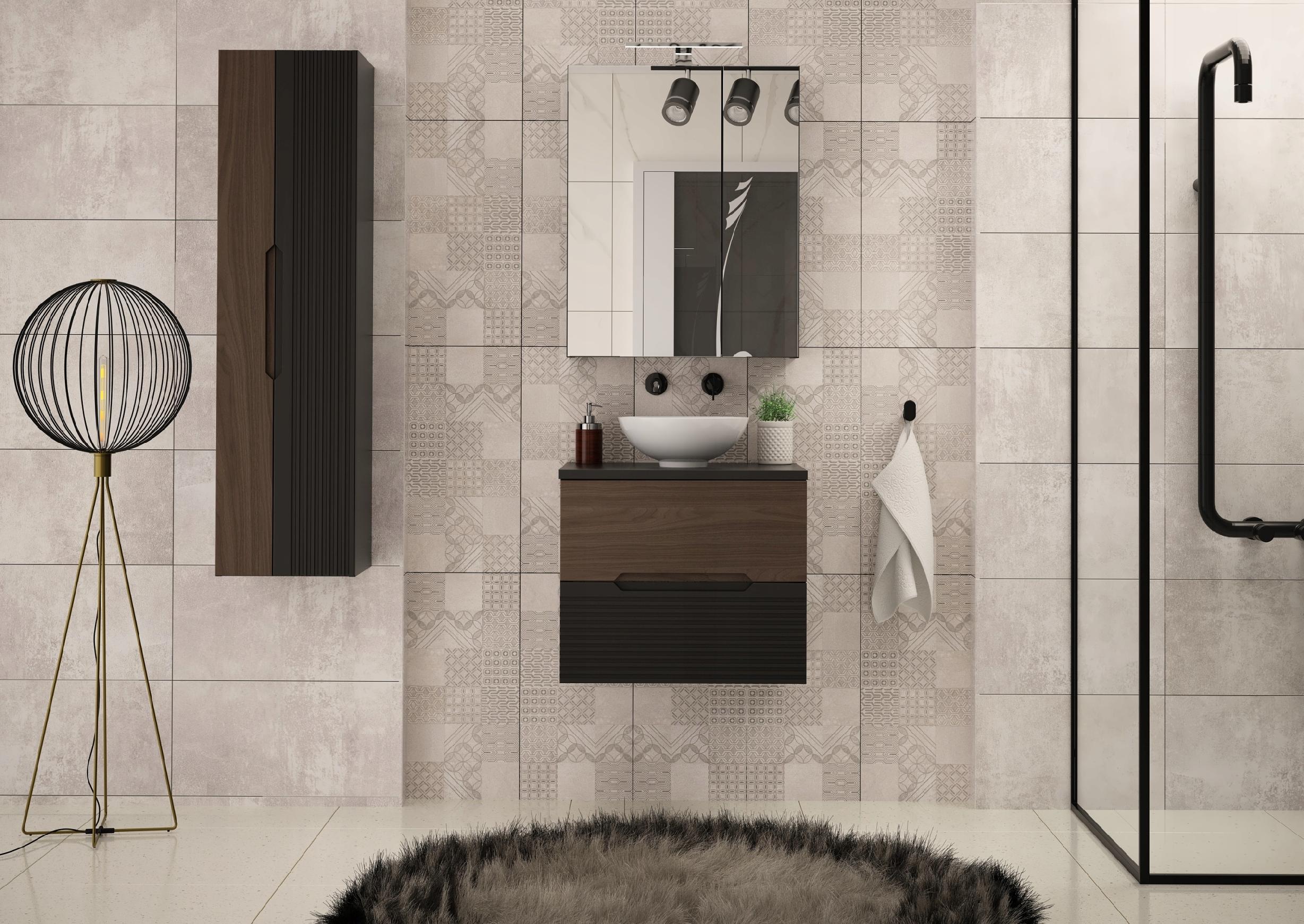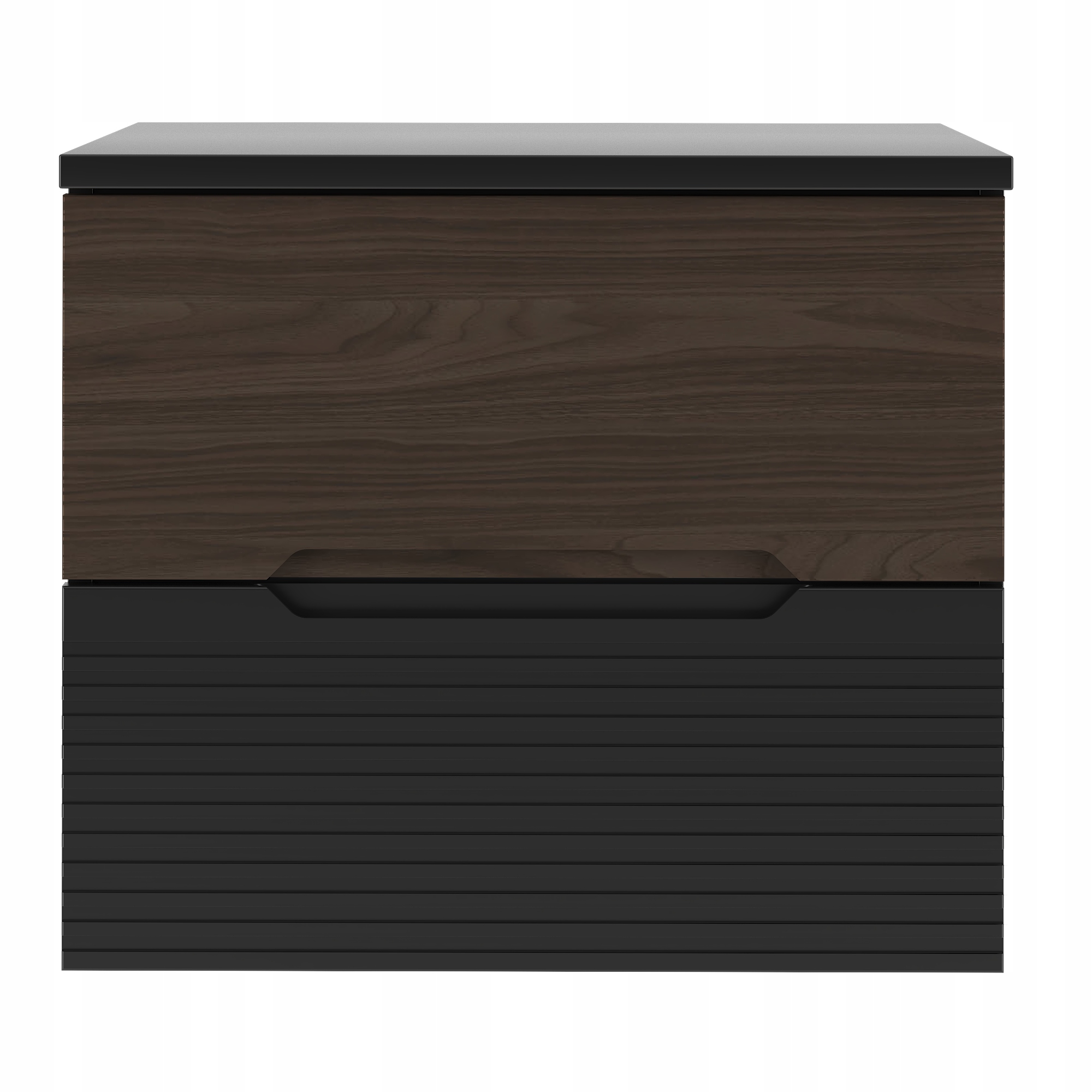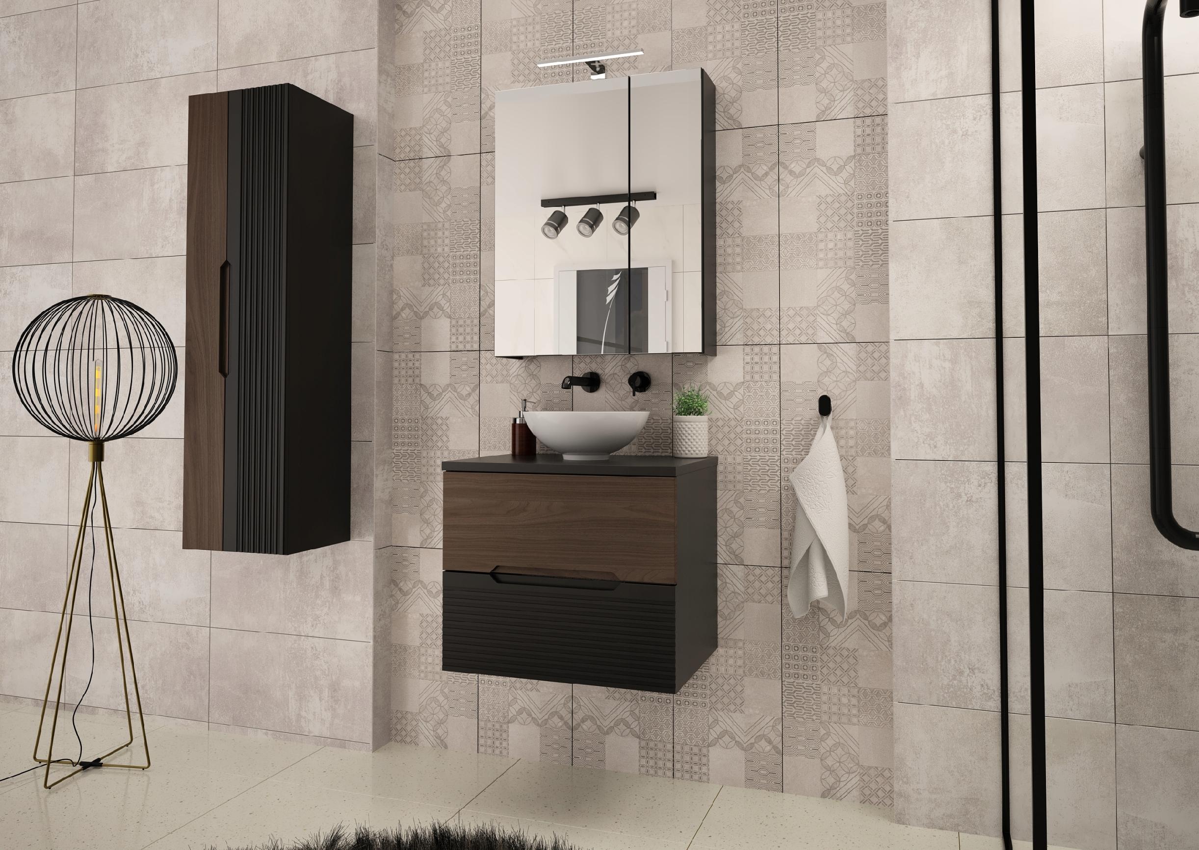 Szafka łazienkowa z kolekcji Avella o szerokości 60 cm z dopasowanym blatem to połączenie czarnego matu i eleganckiego dekoru orzech. Wyjątkowe frezowane fronty MDF nadają całości niepowtarzalnego charakteru, a kontrastowe wykończenie podkreśla nowoczesny i luksusowy styl wnętrza. Wisząca konstrukcja mebla sprawia, że wygląda on lekko i nowocześnie, a dodatkowo ułatwia utrzymanie czystości w łazience.